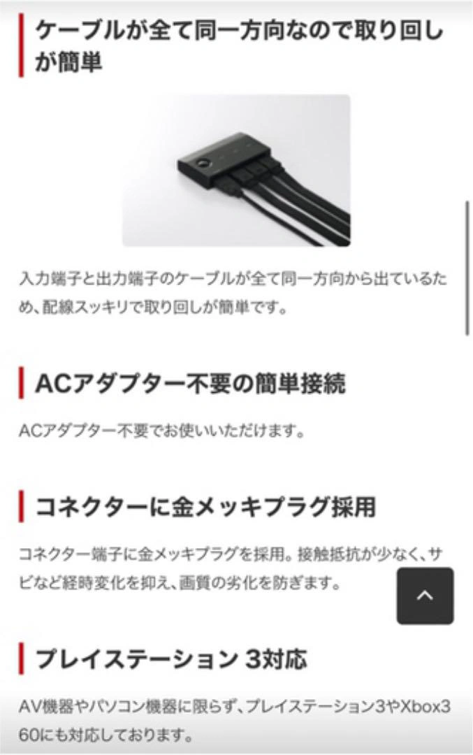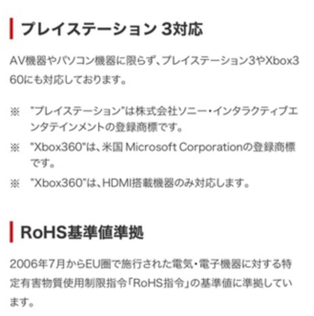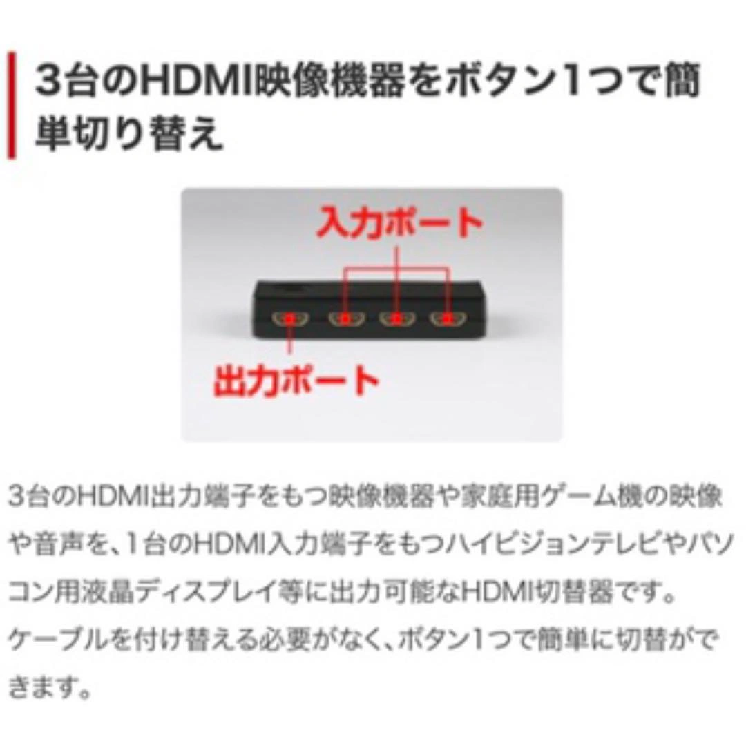 カラー···ブラック 定価5148円 BSAK301 バッファロー BUFFALO 3台のHDMI映像機器をボタン1つで簡単切り替え 3台のHDMI出力端子をもつ映像機器や家庭用ゲーム機の映像や音声を、1台のHDMI入力端子をもつハイビジョンテレビやパソコン用液晶ディスプレイ等に出力可能なHDMI切替器です。 ケーブルを付け替える必要がなく、ボタン1つで簡単に切替ができます。 ケーブルが全て同一方向なので取り回しが簡単 入力端子と出力端子のケーブルが全て同一方向から出ているため、配線スッキリで取り回しが簡単です。 ACアダプター不要の簡単接続 ACアダプター不要でお使いいただけます。 コネクターに金メッキプラグ採用 コネクター端子に金メッキプラグを採用。接触抵抗が少なく、サビなど経時変化を抑え、画質の劣化を防ぎます。 プレイステーション 3対応 AV機器やパソコン機器に限らず、プレイステーション3やXbox360にも対応しております。 ”プレイステーション”は株式会社ソニー・インタラクティブエンタテインメントの登録商標です。 "Xbox360"は、米国 Microsoft Corporationの登録商標です。 ”Xbox360”は、HDMI搭載機器のみ対応します。 RoHS基準値準拠 2006年7月からEU圏で施行された電気・電子機器に対する特定有害物質使用制限指令「RoHS指令」の基準値に準拠しています。 詳しい仕様はメーカーHPご参照ください。
