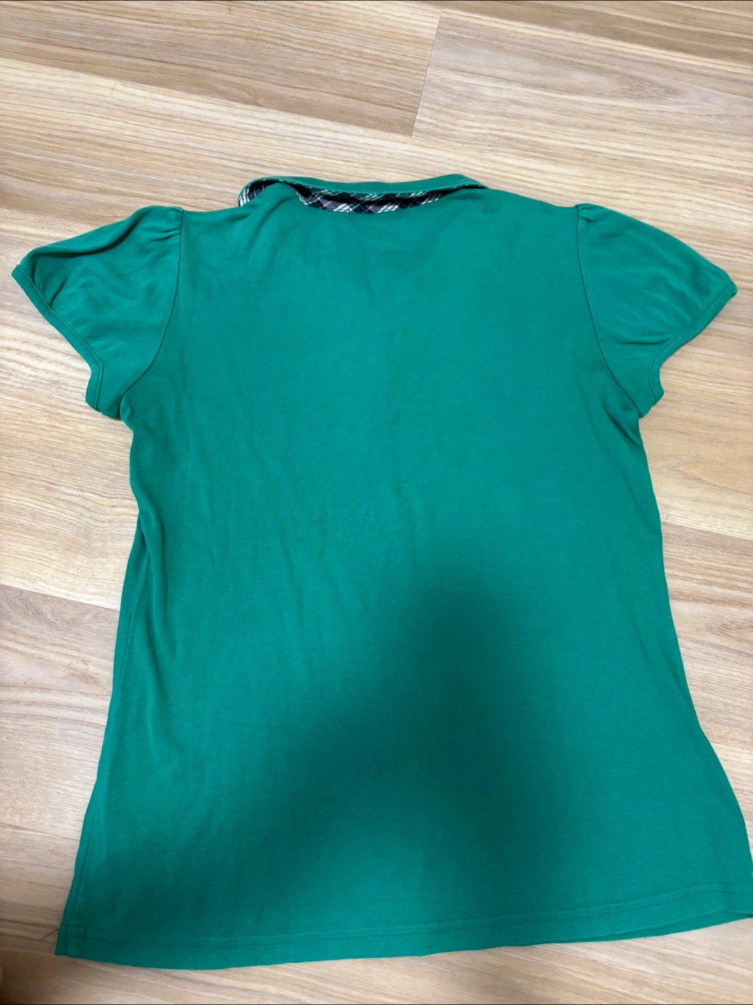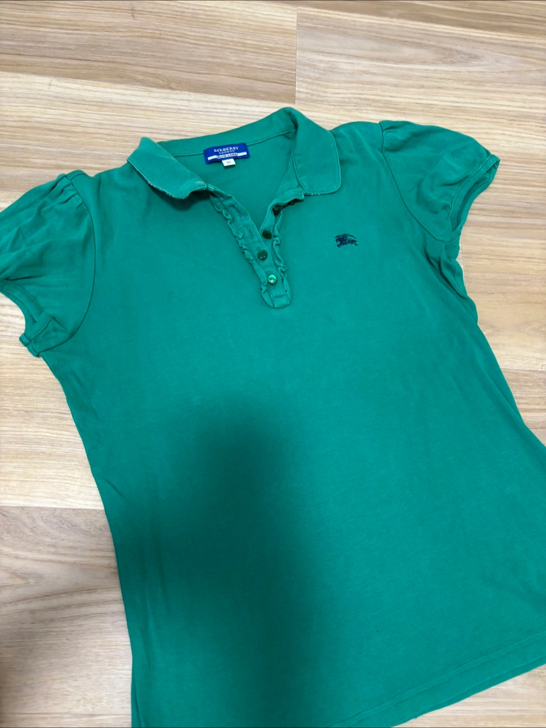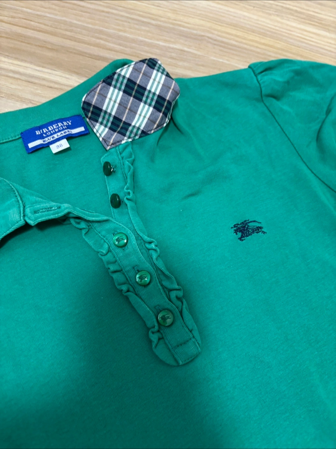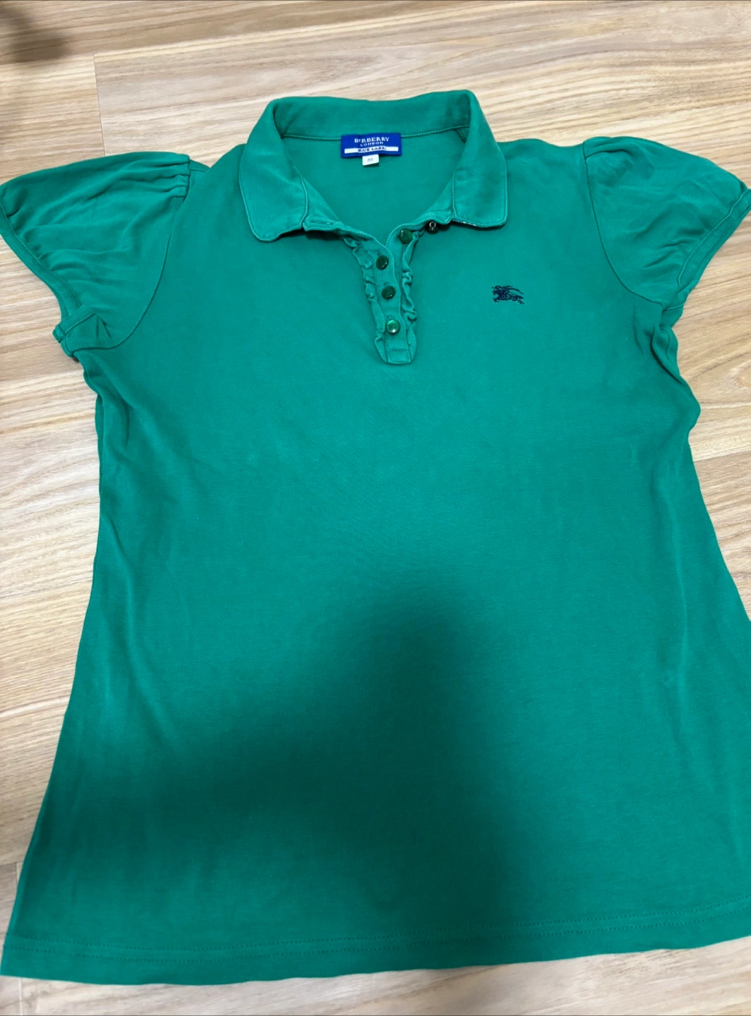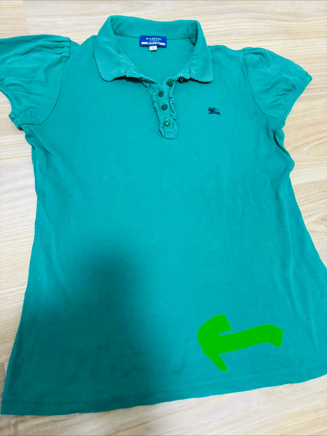 白いパンツと合わせてゴルフに行く時などに使っていました。 使用感はありますが、まだ使えると思います (160- 高学年や中学生によいかも?) お腹下あたりに、ちいさなホールを縫った部分あります(写真の黄色矢印にて) その為お安くしましたので、気にならない方にお願いします! ・ブランド:バーバリーブルーレーベル ・ポロシャツ ・カラー:グリーン ・サイズ:38 ・襟:チェック柄 ・ロゴあり