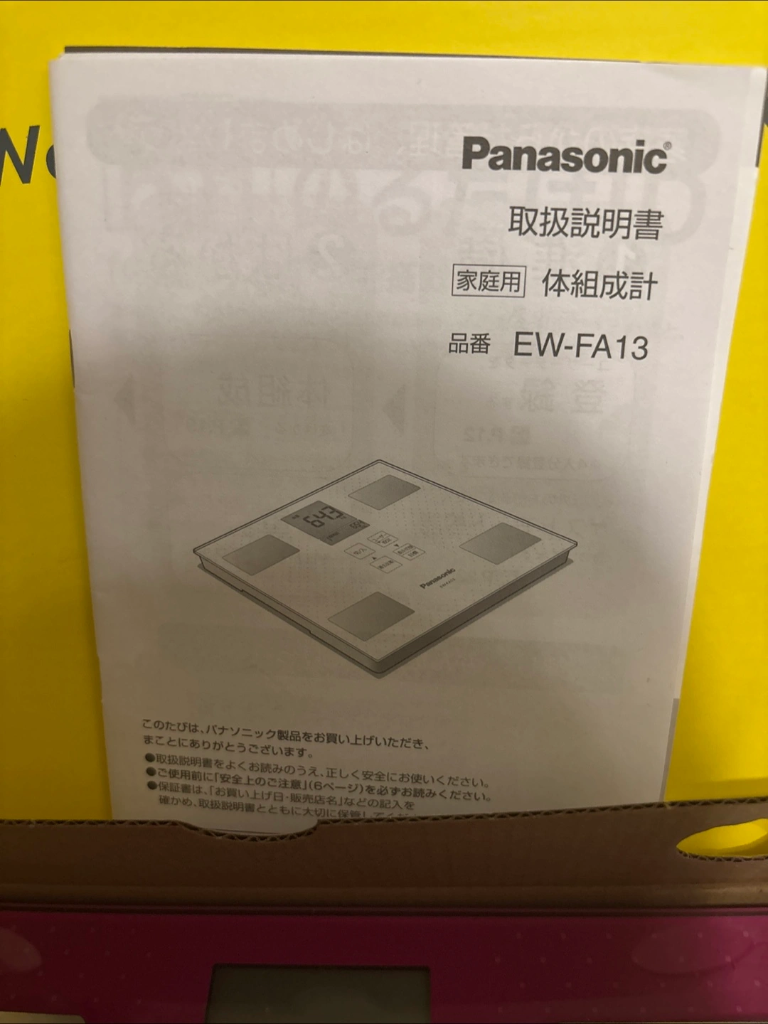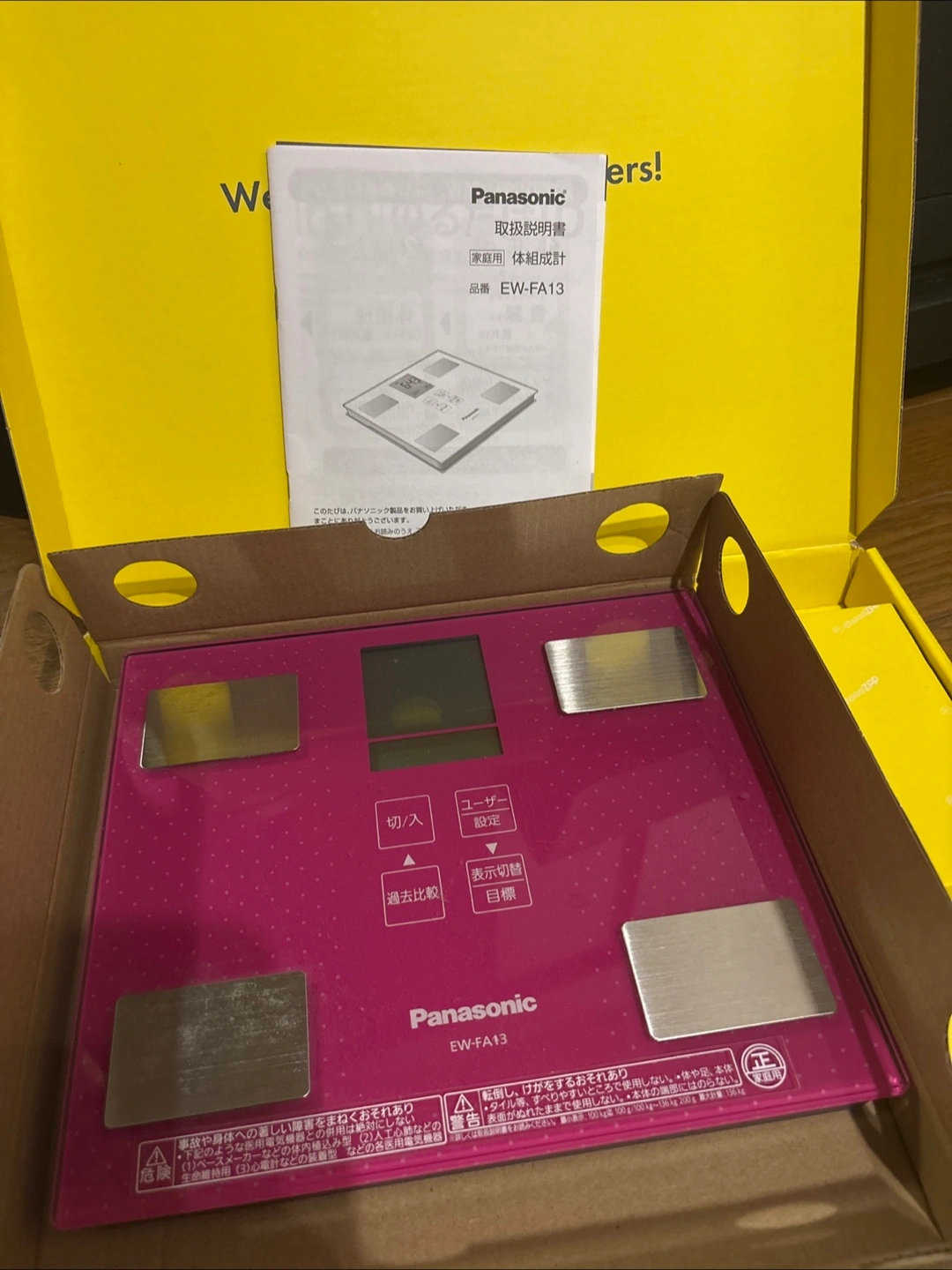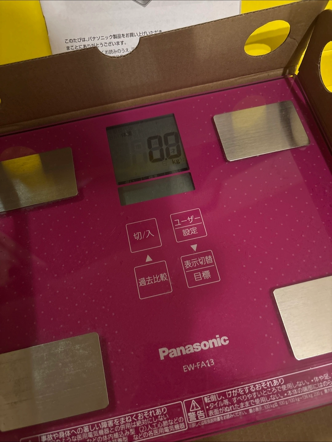 【情報】 ブランド:パナソニック 型番:EW-FA13 種類:体組成計 カラー:ピンク 【付属品】 取扱説明書、箱※箱がチョコザップの箱ですが中身はパナソニックです 新しい体重計があるため、2個もいらないので出品です。身長などユーザー登録しておくと、乗るだけで合わせて測ってくれるのがとても使いやすかったです。 目立った傷や汚れはないですが、中古品ですのでご理解頂ける方のみ。 また尾山台駅に取りに来てくださる方でお願いいたします。 直近まで使っていたので、電池入れたまま差し上げます。 本体寸法:26mm*250mm*220mm(1160g) 高さ*幅*奥行き(質量) ・目標体重設定と減量時のごほうびキラキラで楽しく継続 ・前回値から最長1年までの過去比較をわかりやすく表示 ・ユーザー登録しておけば電源も入れずに乗るだけ認証 ダイエットをサポート 目標体重設定と減量時のごほうびキラキラで楽しく継続 過去比較1・2画面表示 前回値から最長1年までの過去比較1をわかりやすく表示
