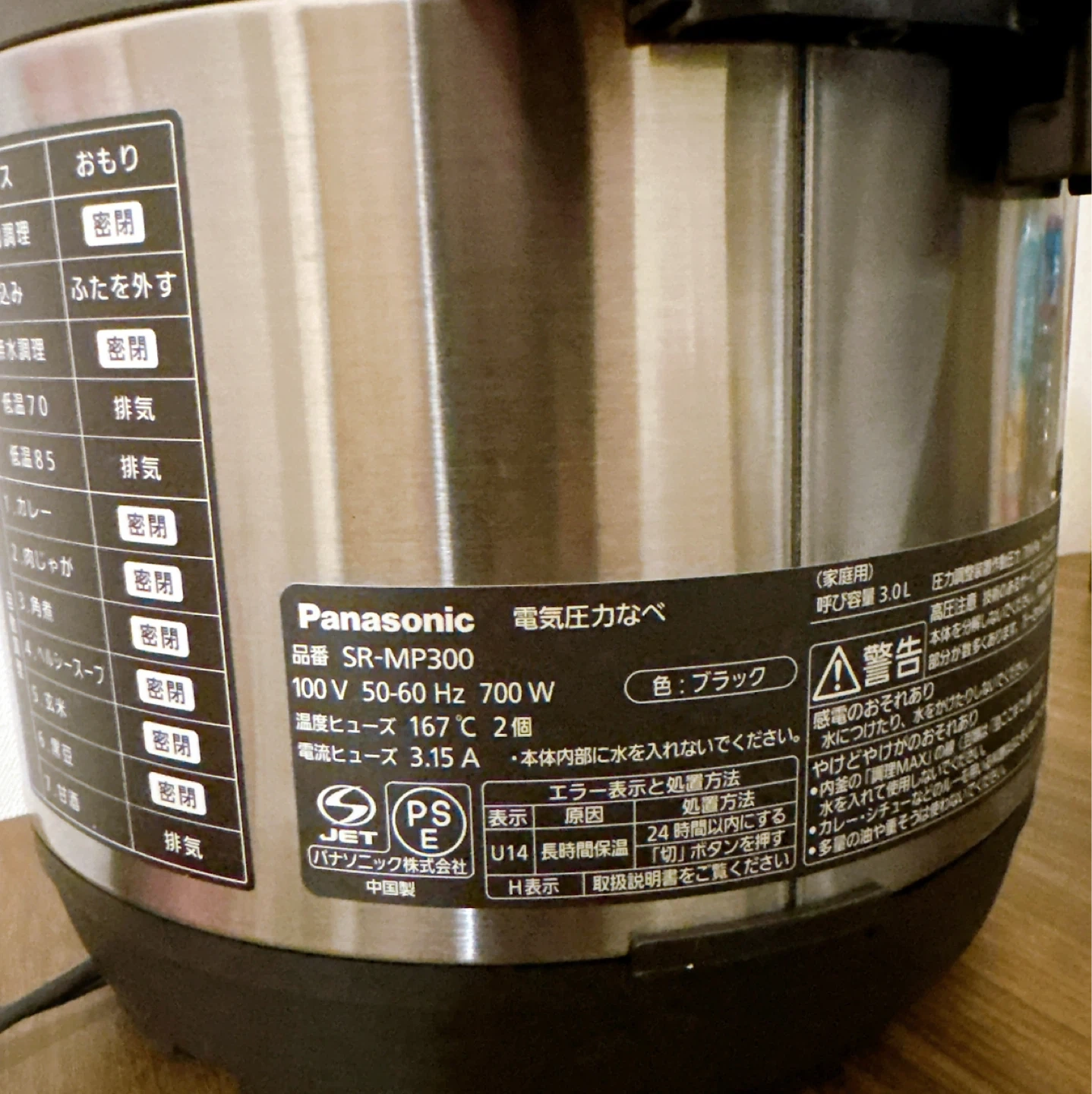 パナソニックの電気圧力鍋です。 動作に問題ありません。 【情報】 ブランド:パナソニック 型番:SR-MP300 カラー:ブラック 容量:3.0L 年式:2020年製 【状態】 使用感あり 内側に汚れあり 外側は傷や汚れほとんどありません 中古品であることご了承ください🙇‍♀️