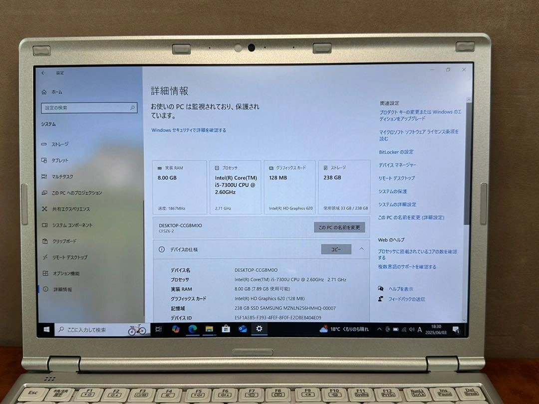 パナソニック Let's note CF-SZ6 (207)です。 ■スペック ・CPU: Core i5-7300U 2.6GHz ・RAM: 8GB ・ストレージ: 256GB. ・ディスプレイ: 12.5インチ ・Webカメラ搭載 ・DVD ドライバー ・解像度: 1920x1200 ・OS: Windows 10 Pro ■状態 起動確認済です。 設定は全て完了しておりますので、すぐにご使用頂けます。 (本品は中古品なので、バッテリーの寿命は保証できません。ご理解の上でご購入下さい) ■外観状態 中古品ですので、使用に伴った擦り傷や汚れなどはあります。 商品の状態を写真でご確認ください。 ■付属品 本体、ACアダプタ、電源コード ■保証期間: 初期不良の場合、到着後7日以内にご連絡ください。 不明点がございましたら、ご購入の前にご質問をお願い致します。 ご検討よろしくお願いいたします。