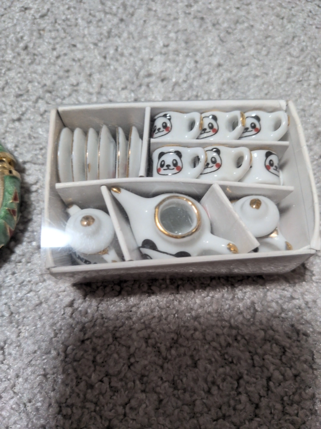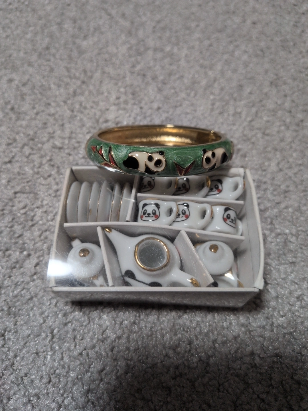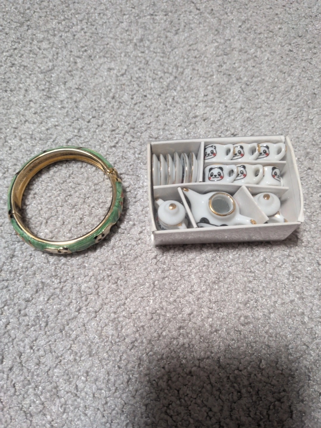 横浜中華街で購入した、パンダのミニチュアティーセットとブレスレットとなります。 未使用に近いですが自宅保管の為、神経質の方は御遠慮ください。 ノークレーム・ノーリターンでお願い致します。 仕事がある日は、基本18時以降になります。 お休みの日はあわせられます。 宜しくお願いいたします。