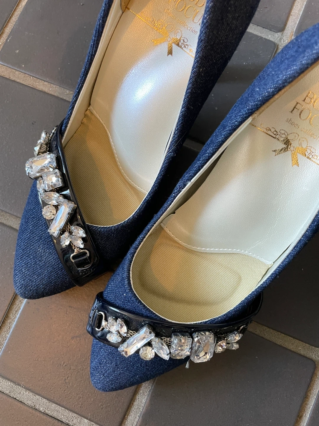 あたたかさデニム生地のパンプスです。 サイズが合わず試し履きしただけです。 ・サイズ:22.0cm ・色:デニム ・ラインストーンの装飾 ・使用感ほぼなし 中古品であ ることご了承ください