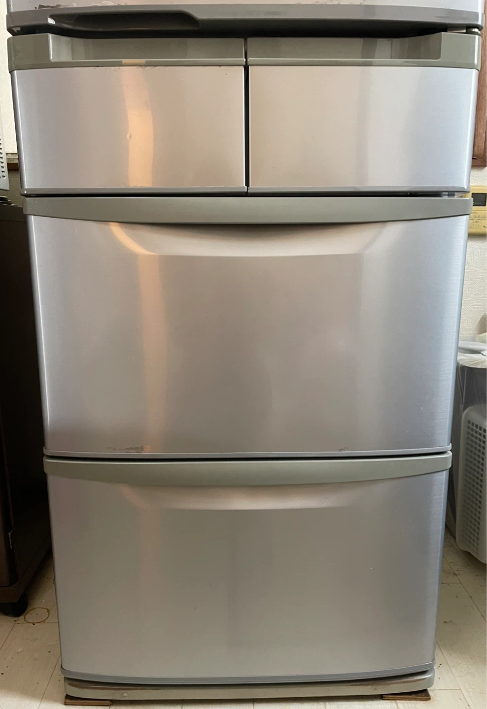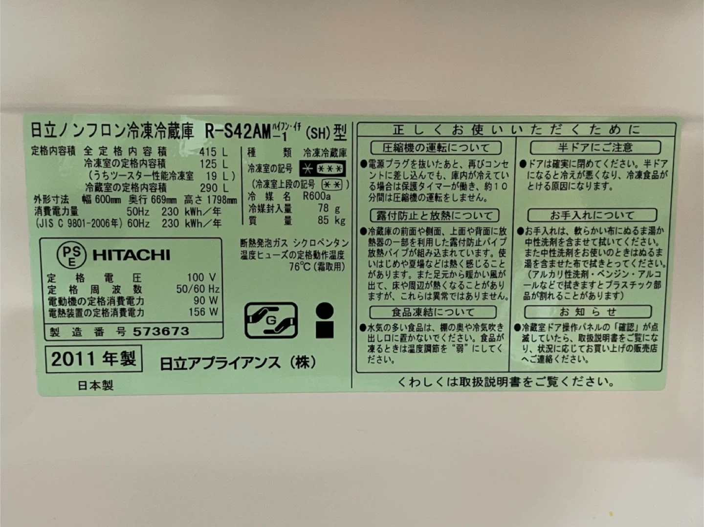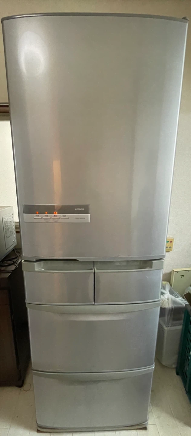 ヒタチの冷蔵庫です。 【情報】 ブランド:ヒタチ 型番:R-S42AM(SH) 年式:2011年製 購入月:2011年8月 全定格内容積:415L 冷蔵室の定格内容積:125L 冷凍室の定格内容積:290L 外形寸法:幅600mm 奥行669mm 高さ1798mm 【状態】 使用感はありますが、比較的きれいです。 10月5日に動作確認いたしました。 【付属品】 取扱説明書 中古品であること、ご了承ください。 ⚠️アパートの1階、室内の玄関付近に設置しております。お客様で搬出可能で、取りに来てくださる方、よろしくお願いいたします。 🗓受け渡し日は、平日の夜or土日を希望です。 その他の時間はご相談ください。 よろしくお願いいたします。