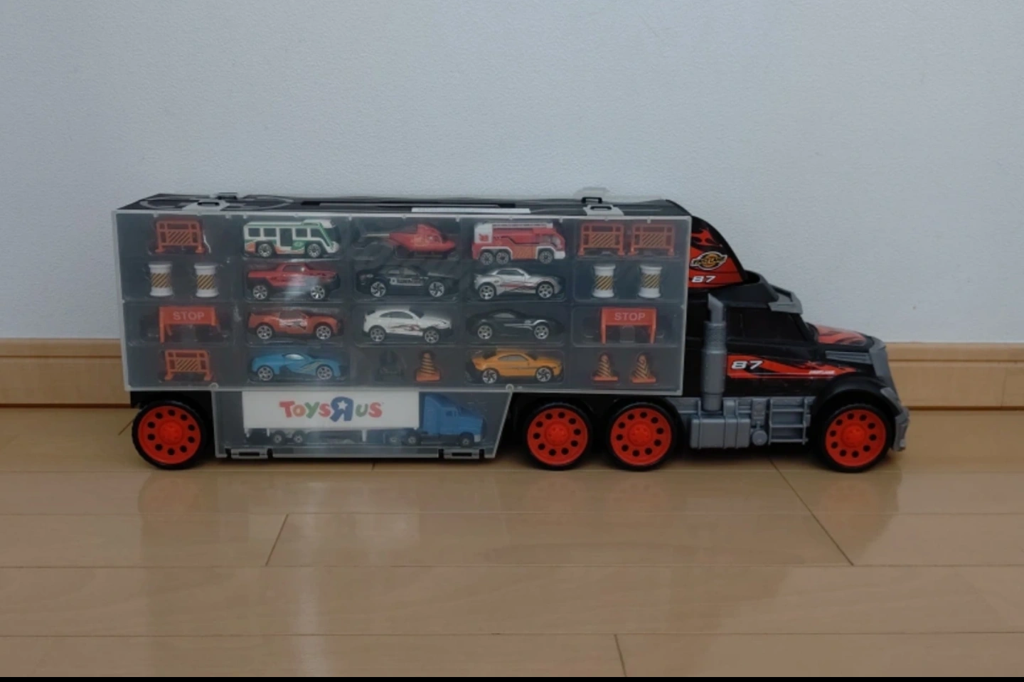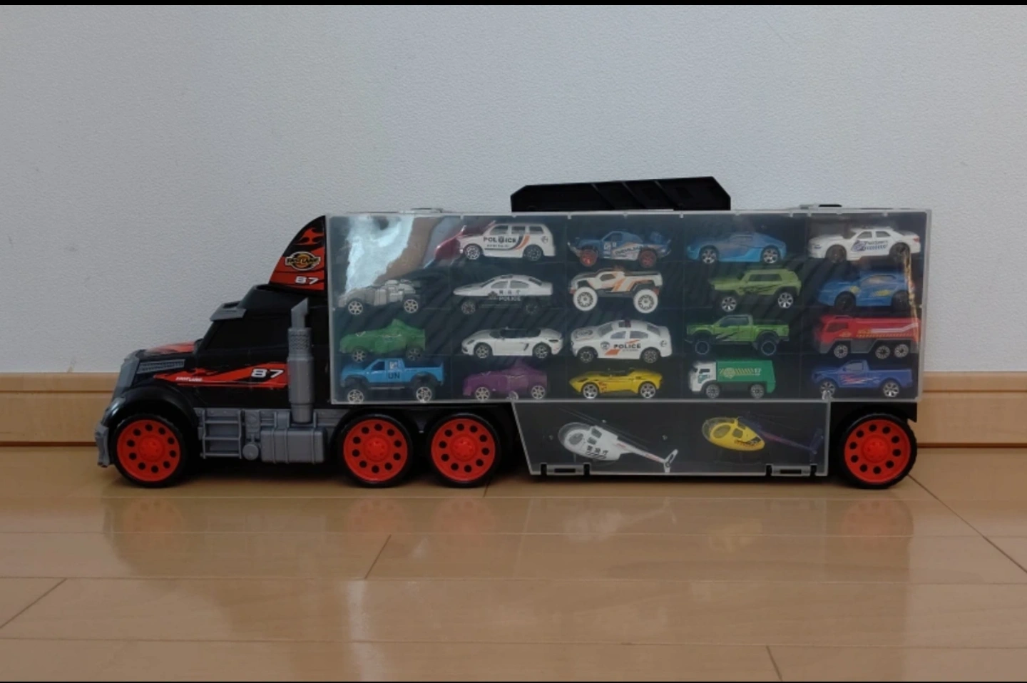 写真に写っているものが全てです。 本体は綺麗です。 ※ミニカー・付属品なしで本体のみの販売も可能です。 その場合は¥2000となります。 中のミニカーが多少傷があるものもあります。 ヘリコプターやミニカー、付属品の一部が破損しているものもあります。 写真にてご確認下さい。 ミニカーのみ入ってる側のミニカーは本来の付属品ではありません。 使わなくなったミニカーを入れました。 大きさは全長62cm、幅12cm、高さ20cm位です。 上部に収納式の取っ手が付いており、持ち運び出来ます。 運転席の上部にミニカーを入れて遊ぶこともできます。 運転席の前方からミニカーが出てきます。