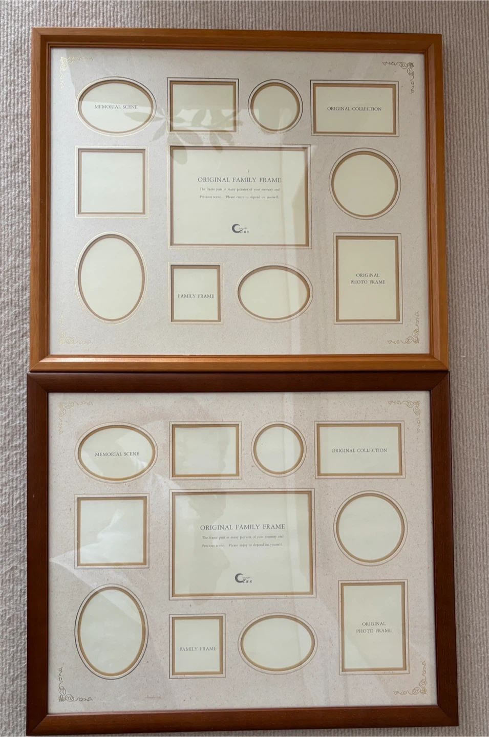 複数窓のフォトフレームです ・木製のフレーム2色(写真参照) ・複数の写真を入れることができます ・裏面に吊り下げ用の紐付き ・アクリルカバー 中古品であることご了承の上、ご興味がありましたらご検討下さい。 セット価格でのご案内ですが、単品価格は600円/枚とさせて頂きます。 ネットフリマでは、新品ガラスカバー同サイズ同デザインで6,500円で掲載がありました。