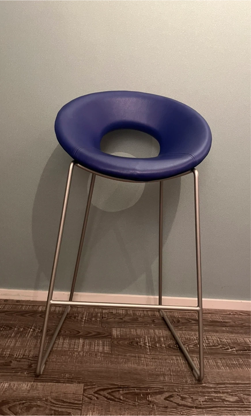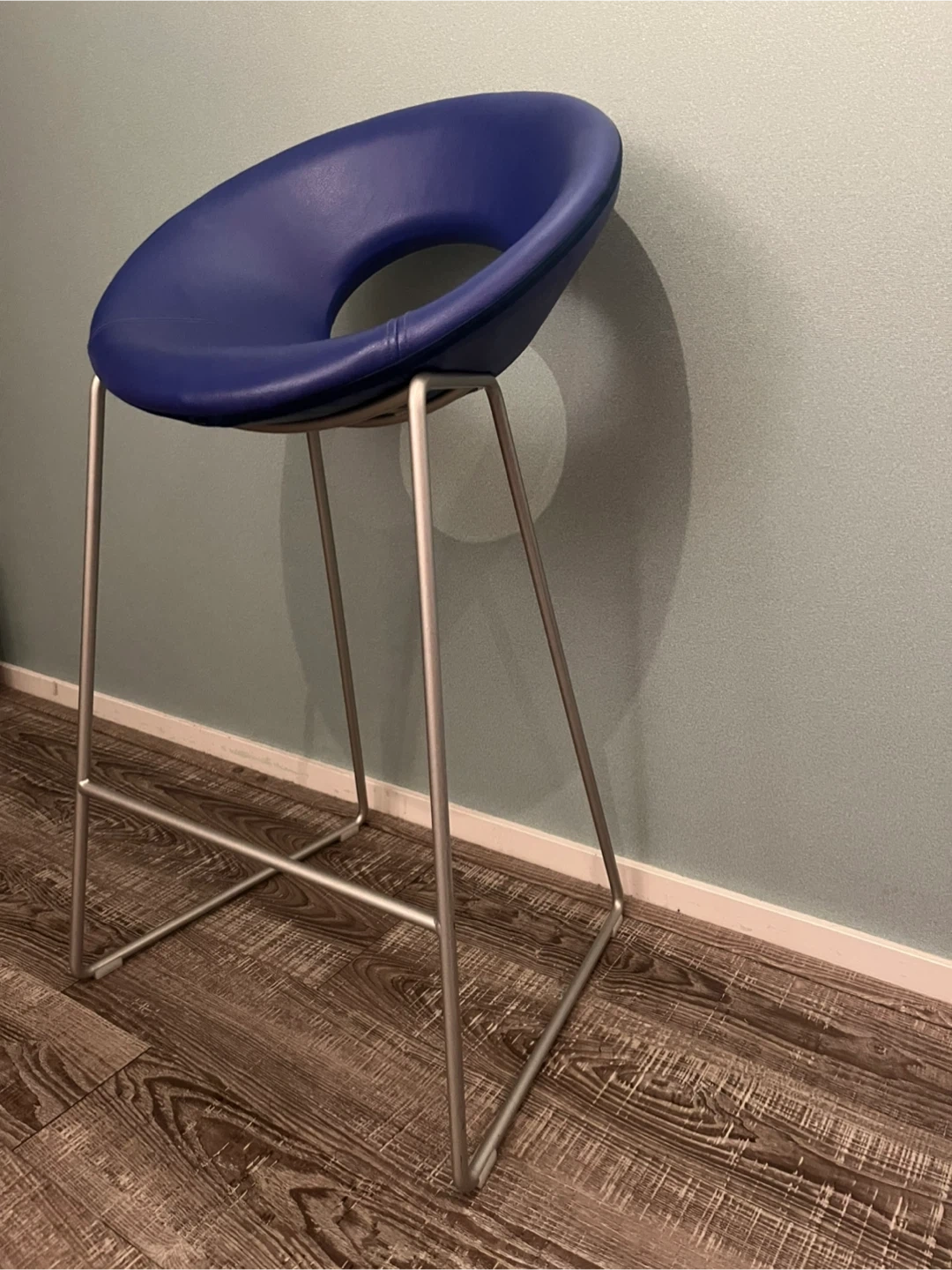 とても存在感のある子です。 お尻のフィット感はなんとも言えないくらいに心地よいです。少し高さがあるのでカウンターで使用するのがベストですが、デザイン性にも富んでるのでインテリアとしても有用です。 ・ブランド:フライミーベーシック ・色:青 ・状態:使用感ほぼ無し ・サイズ:確認します。 [幅(W)]50cm [奥行(D)]43cm [高さ(H)]86cm [座面高さ(SH)]64cm [張地] ビニルレザー [脚部] スチール(クローム) 中古品であることご了承ください。