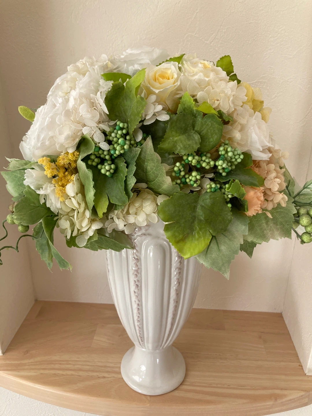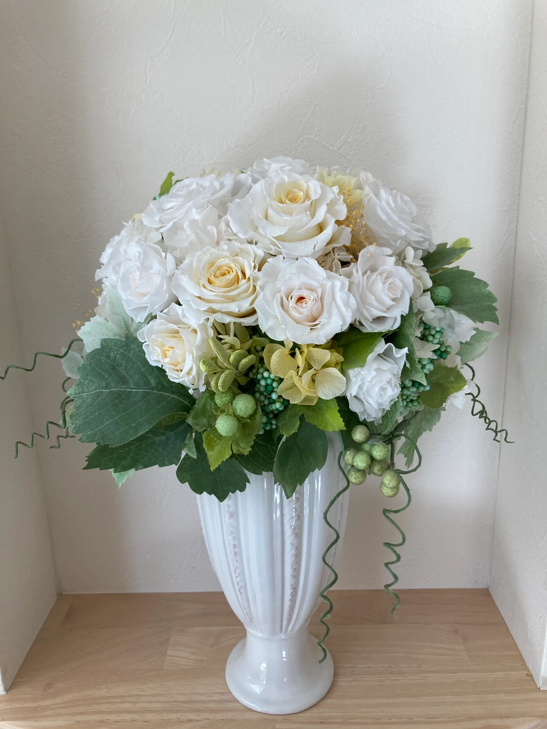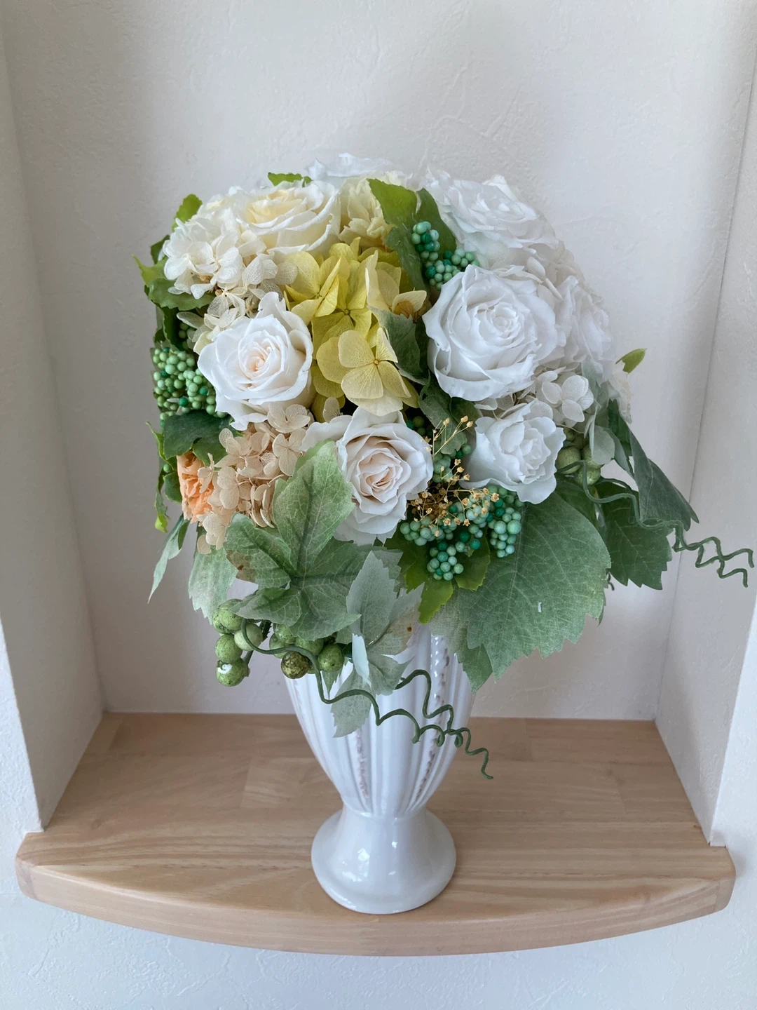 白と黄色のブリザードフラワーアレンジメントです。 狭い場所でも飾れるように前面は丸みを帯びた作りで、背面はフラットな作りにしてあります。江田駅の花屋さんで特注で2万円ぐらいで作っていただきました。ニッチに飾っていました。 経年劣化で花びらに亀裂などあります。中古品にご理解いただける方でお願いします。商品状態をご覧になってから決めていただいても大丈夫です。 お気軽にお問い合わせください。 ・色:白、グリーン ・高さ:約38 cm ・横幅:約20cm ・花瓶付き ご不明点があればお気軽にご連絡ください
