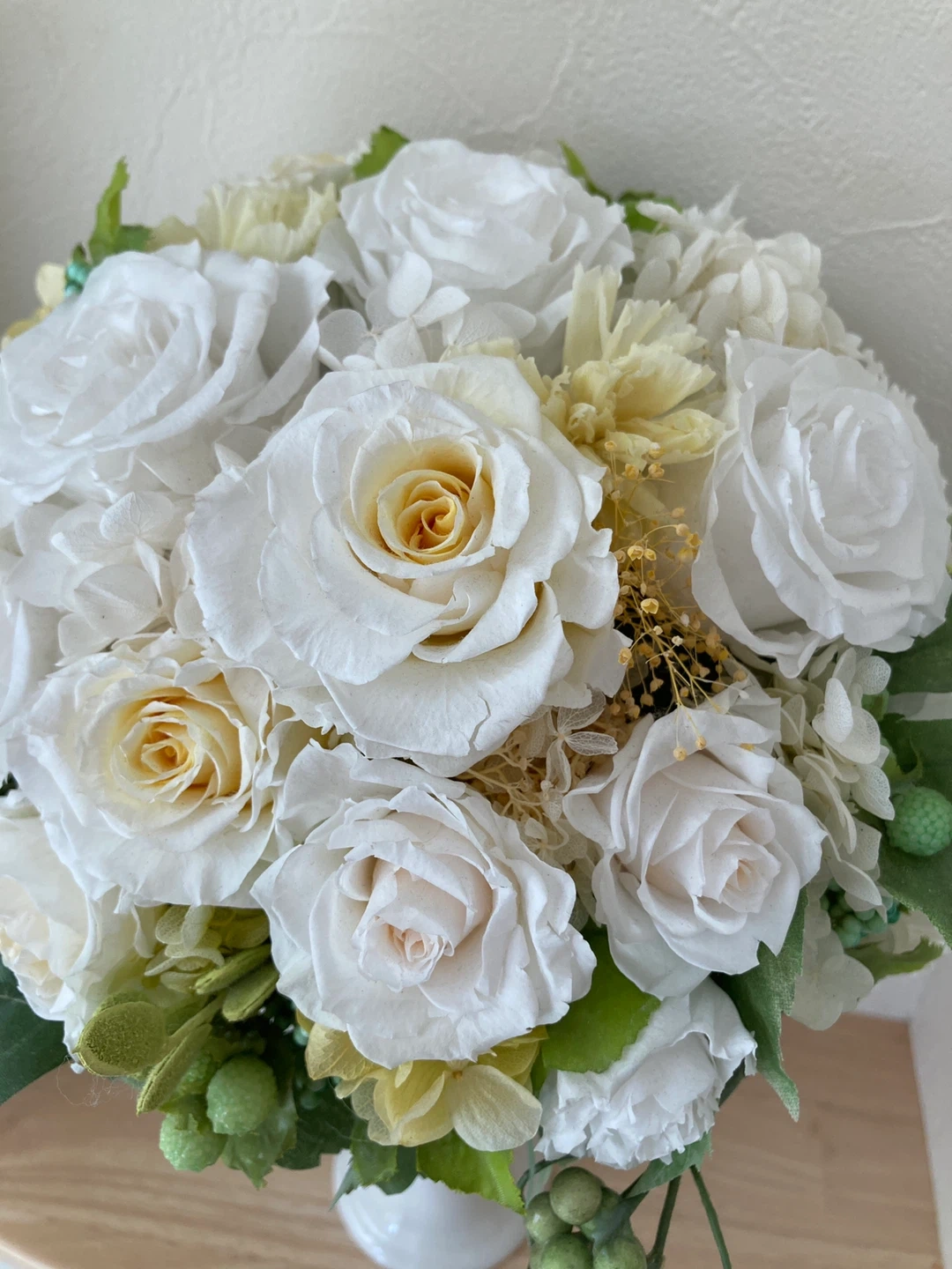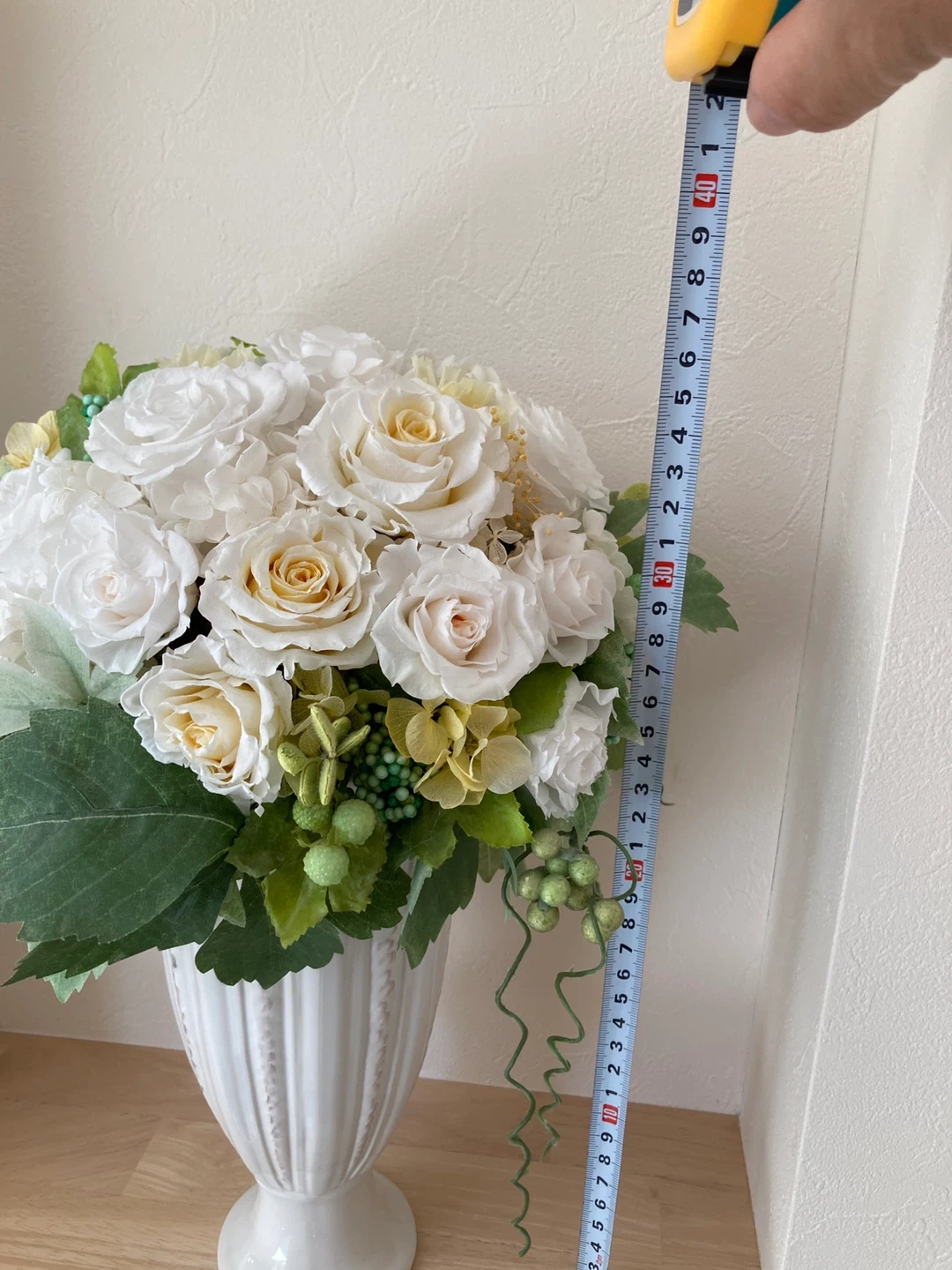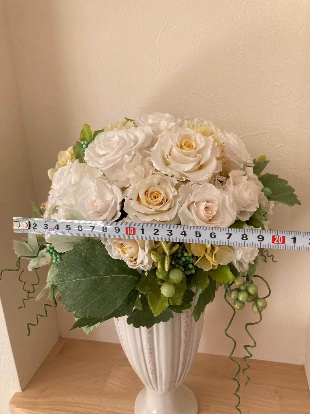 白と黄色のブリザードフラワーアレンジメントです。 狭い場所でも飾れるように前面は丸みを帯びた作りで、背面はフラットな作りにしてあります。江田駅の花屋さんで特注で2万円ぐらいで作っていただきました。ニッチに飾っていました。 経年劣化で花びらに亀裂などあります。中古品にご理解いただける方でお願いします。商品状態をご覧になってから決めていただいても大丈夫です。 お気軽にお問い合わせください。 ・色:白、グリーン ・高さ:約38 cm ・横幅:約20cm ・花瓶付き ご不明点があればお気軽にご連絡ください