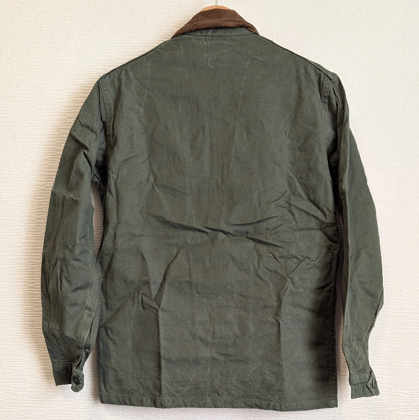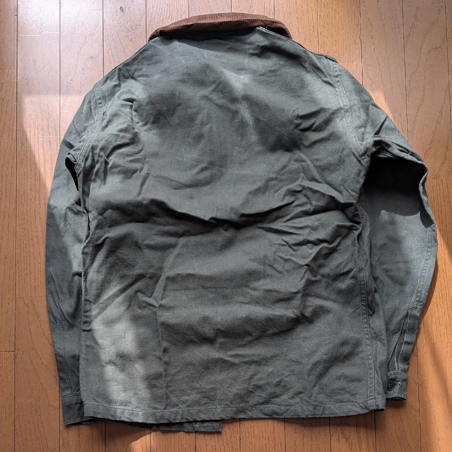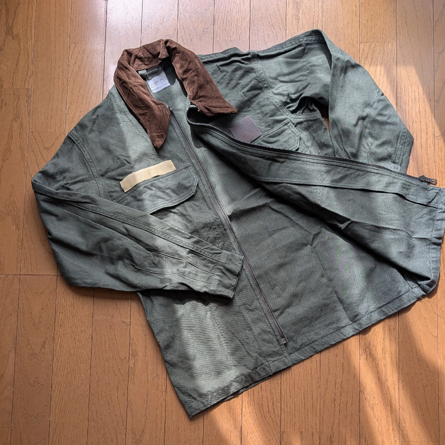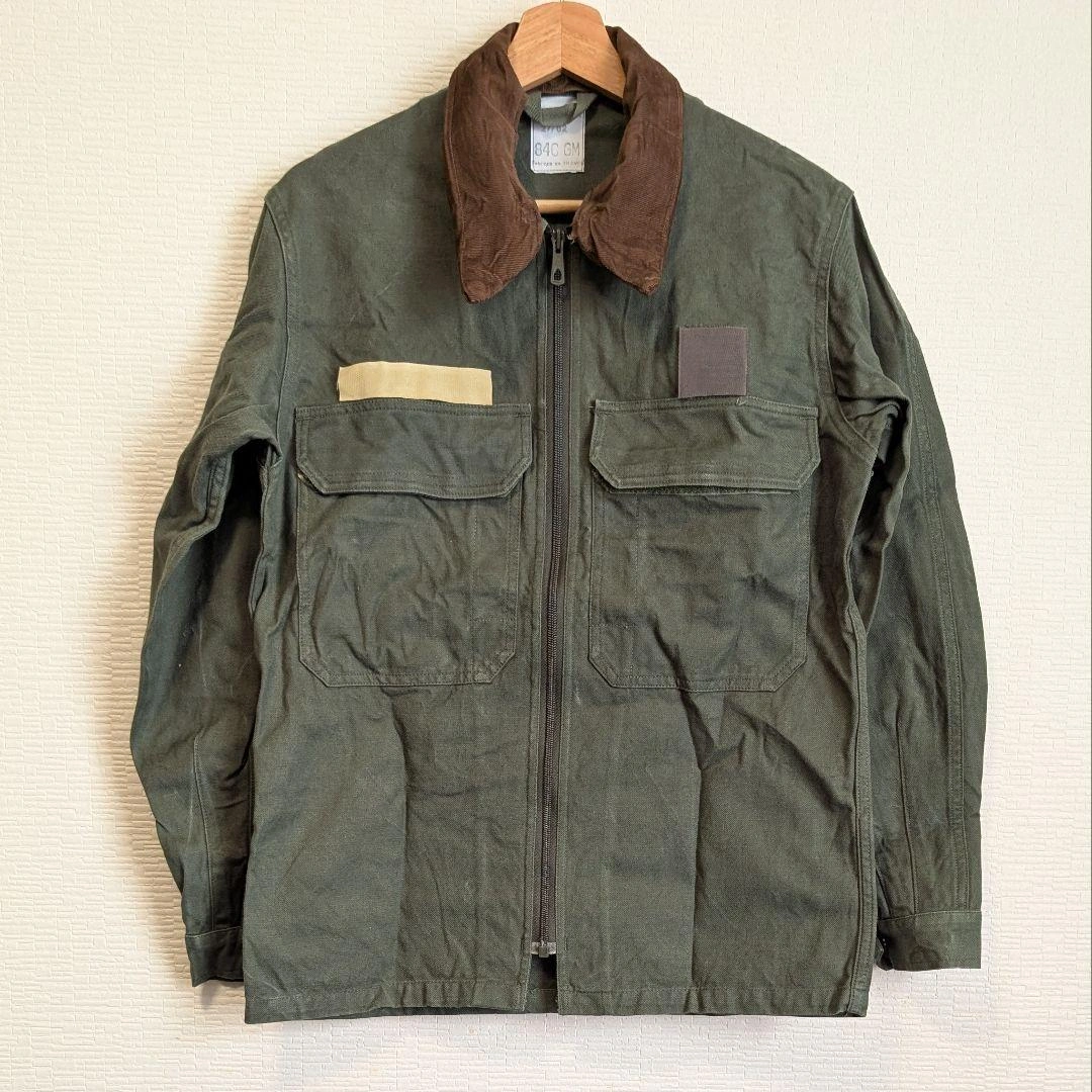 ※写真追加しました(10/21) 以前ミリタリー専門店で購入したフランス軍エアフォースのユーティリティジャケットです。 襟はBarbourのジャケットをイメージしてコーデュロイ生地で作り、取り外しできるようにしています。 ∼以下サイト引用∼ 70〜80年代の雰囲気を感じさせるコットンツイルが使用されたジャケットで、古い年代特有のコットン生地の質感が良く、さらっとした肌触りに耐久性に優れ、通気性の良い素材が使用されています。 ファスナー開閉のフロントのデザイン、2箇所のベルクロ開閉のポケットがデザインされています。ポケットのファスナー側にはそれぞれペンホルダーになっています。胸ポケット上部にはベルクロが備わっていますのでデザインのアクセントに一役買っています。 袖口にかけてダーツが入れられていますので立体的なシルエットに仕上げられていて、肩のエポレットなども付属していませんので多くの方に着ていただくことのできるデザインです。袖先はベルクロとボタンで開閉できます。袖をロールアップすることで軽さの出る着こなしに。アームホールなども太すぎず、バランスの良い1着です。 着込む中で良い具合にフェードしていき、さらに雰囲気の良くなるジャケットです。シンプルでベーシックなデザインが幅広いスタイリングに活躍する、手に入りにくいフランス空軍の希少なジャケットです。 肩幅/身幅/袖丈/着丈 肩幅...43cm 身幅...49cm 袖丈...60cm 着丈...69cm カラー...カーキ系 汚れ・破れ・臭いなど...なし