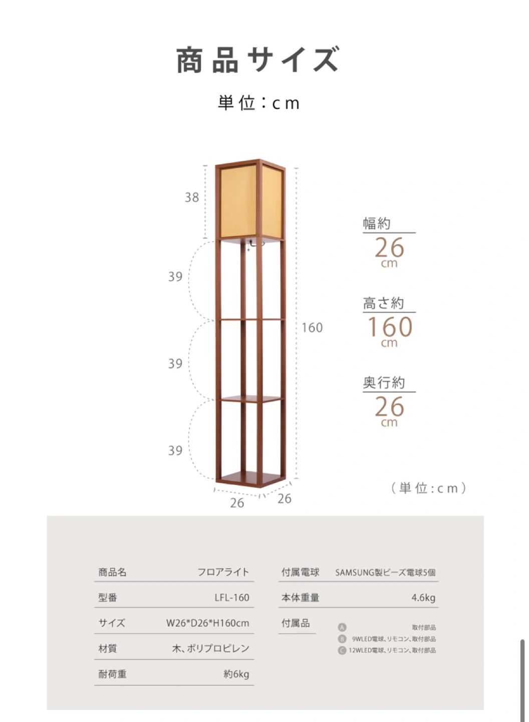 3段収納スペースがあるフロアランプです。 lfl-160 【情報】 型番:LFL-160 サイズ:W26×D26×H160cm 素材:木、ポリプロピレン 本体重量:4.6kg 模様替えのため出品致します。 中古品であることご了承ください。 フロアライト おしゃれ ライト フロアランプ LED ラック付き フロアスタンド E26 LED電球付き フロアスタンド 照明 間接照明 北欧 LED 商品URL https://store.shopping.yahoo.co.jp/saitou11-store/lfl-160.html