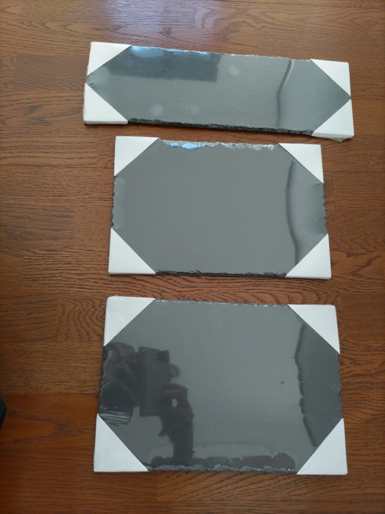 ご覧頂き、ありがとうございます♪ ABCクッキングのノベルティで頂いた非売品です。 定価6000 円程のお品のようです。 天然石の黒のストーンプレート 3枚組です。お料理映えするお洒落な盛り付けに最適(*^^*) お料理好きな方に♪ 新品未使用で、画像では梱包されているため、四隅が紙で保護サれています。 もともと入っていた段ボールは、自宅保管の経年劣化でかなり傷んでいますが、そのまま段ボールに入れてのお渡しとなります。 サイズと素材は画像2でご確認ください。