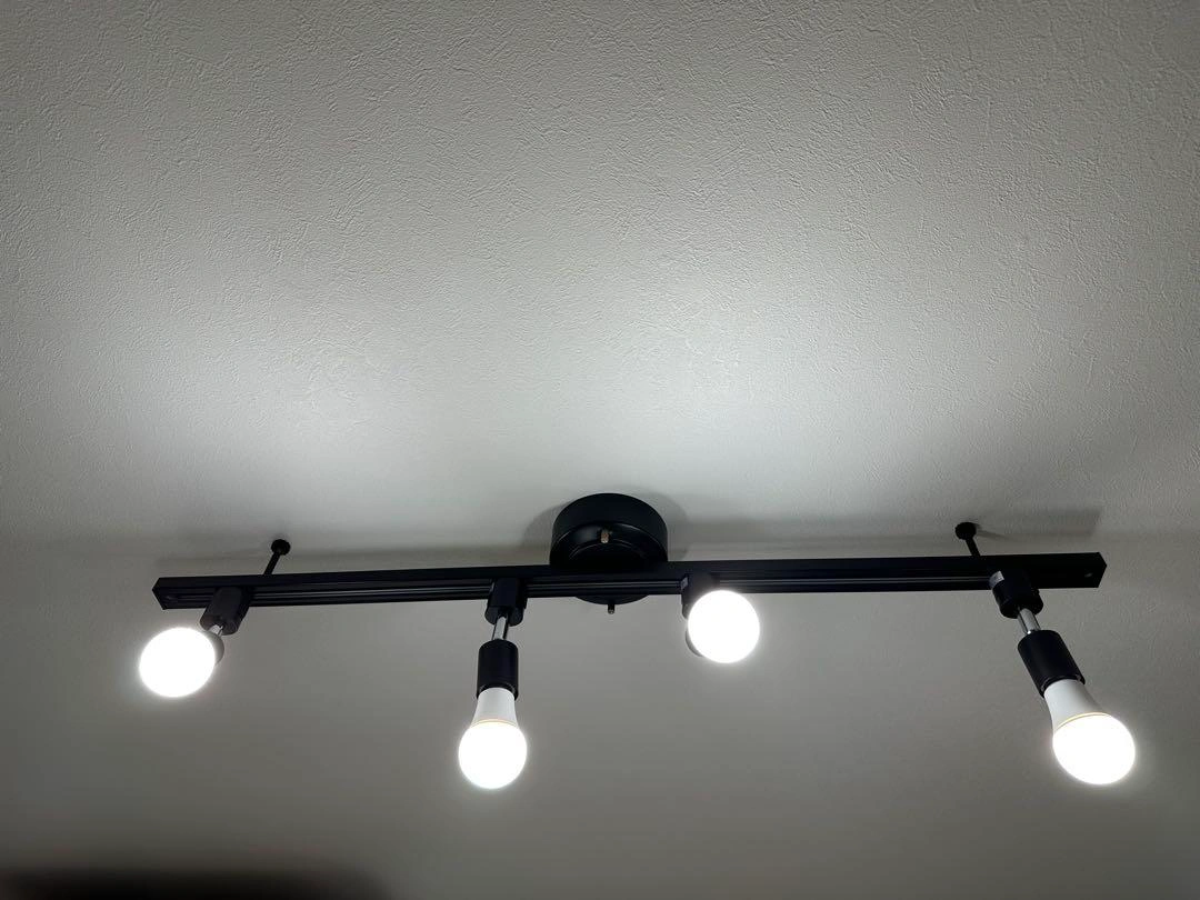 RAIL-spotlightのシーリングライト、ブラックレールです。 Hao Deng のスマート電球が4つ付属します。 ◎シーリングライト 工事不要で、簡単に取り付けられるタイプです。 ダクトレール:(約)幅1000x奥行き130x高さ78mm(1メートル) スポットライト:(約)直径40x高さ133mm 重量:約1.400g 対荷重:約5kg 材質:スチール 定価:¥6.600 取付方法:シーリングプラグ 定格電圧(周波数):AC100V(50/60Hz) 対応電球:口金/E26 15W✕4まで 点灯方法:壁スイッチ ◎スマート電球 Hao Deng(Magic Home Proのアプリを使います) 口金:E26/E27対応 サイズ:60*60*118mm 入力電压:AC100-240V, 50/60HZ 定格消費電力:7W 色温度:2700K-6500K 定格寿命:約20,000時間 照射角度:約120° 全光束:600ルーメン 定価:¥4.399 両方とも、4年ほど使用していますが目立った汚れはありません。 ご質問等ございましたら、お気軽にコメント下さいませ。