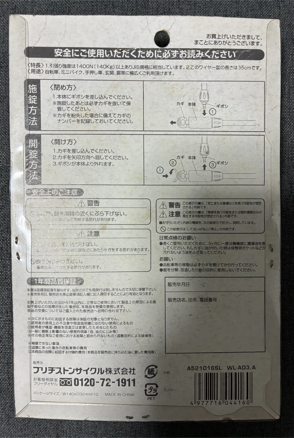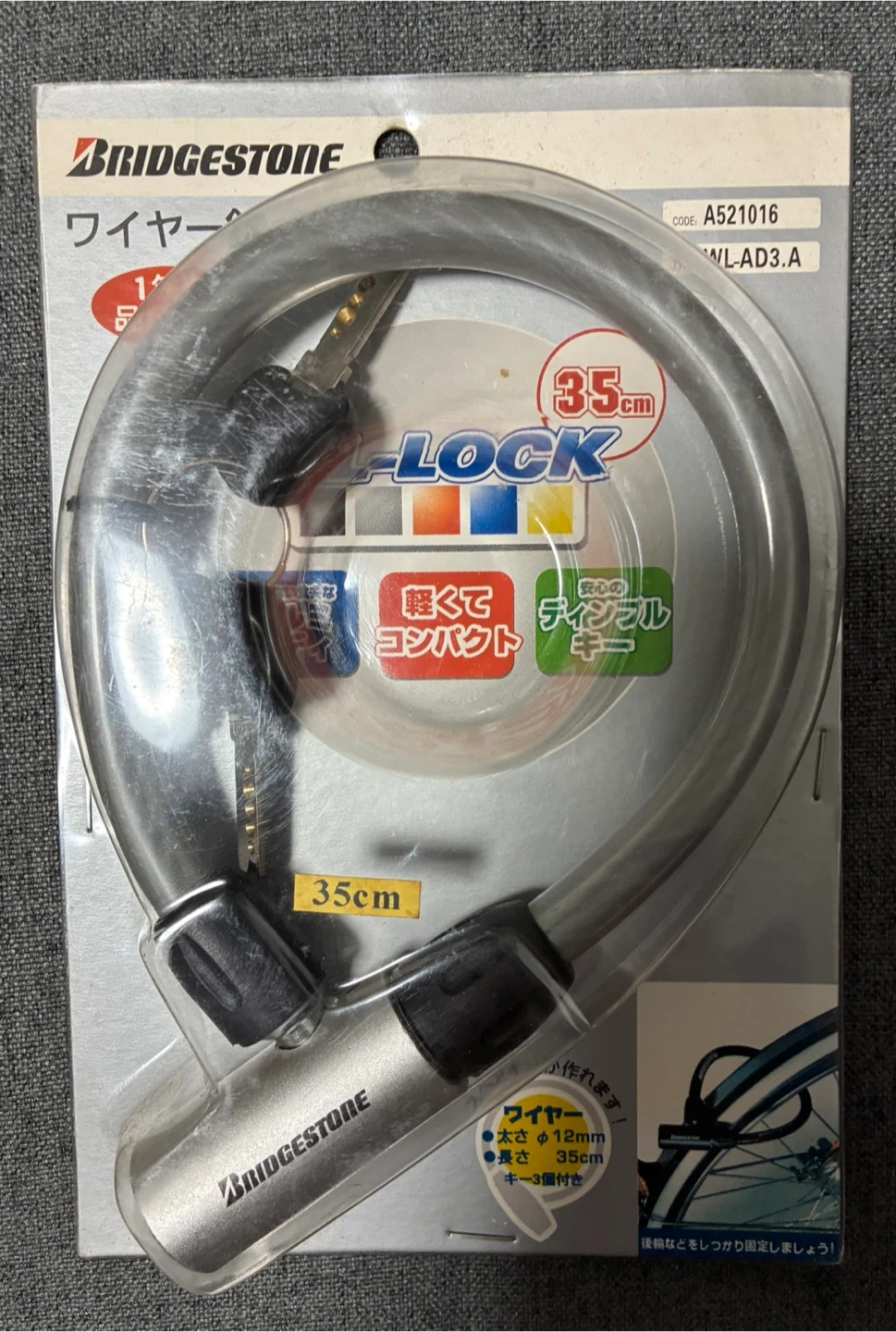 ブリヂストンのワイヤーロックです。 【情報】 ブランド:ブリヂストン 種類:ワイヤーロック サイズ:35cm 型番:A521016 WL-AD3.A ⚠️新品・未使用品ですが長期保存の為、箱やパッケージに色あせ、傷、汚れがあります。 【状態】 新品、未使用 【付属品】 キー3個 一応中古品であることご了承ください