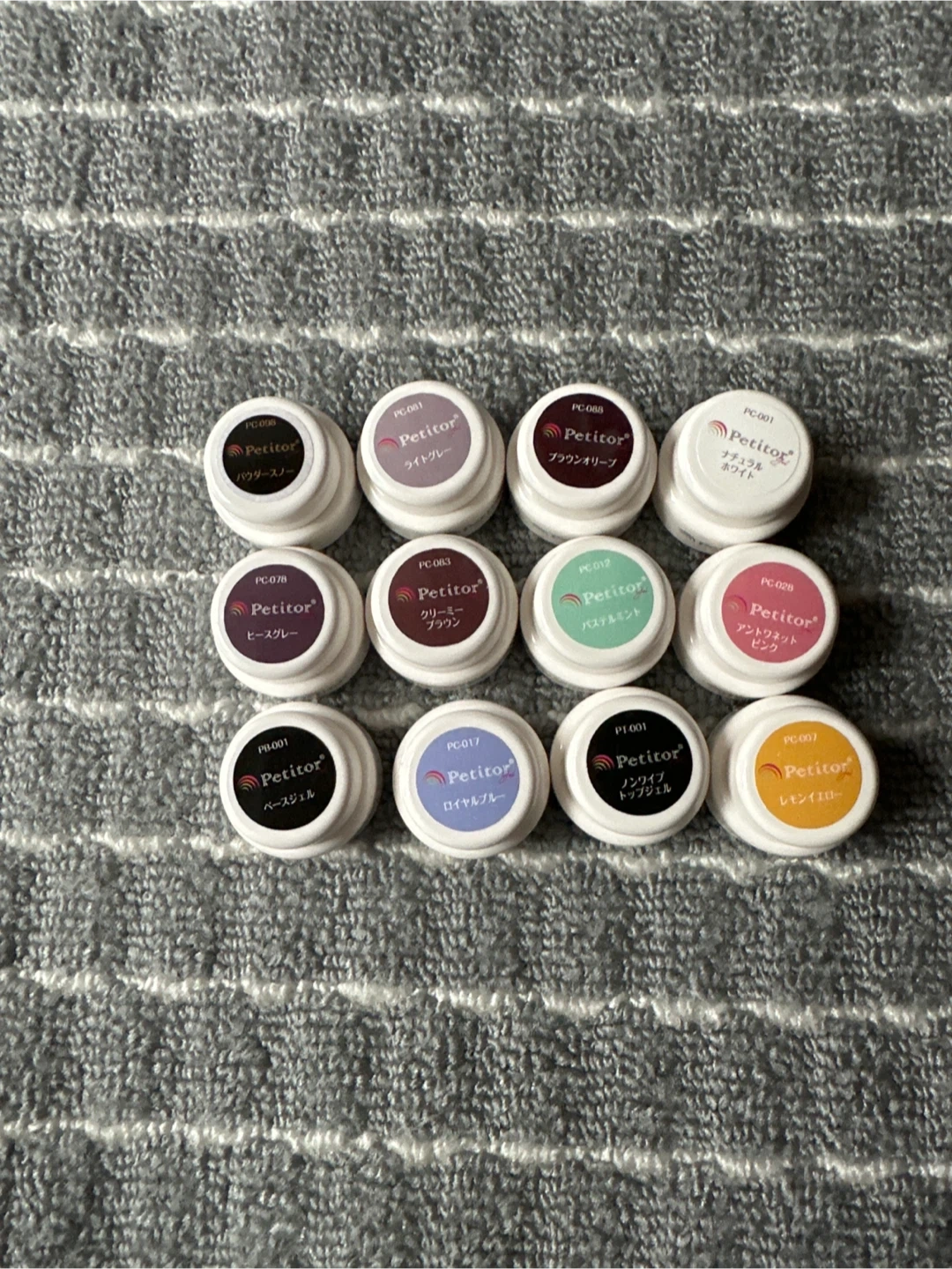 プティトルのジェルネイル12色セットです ・ブランド:プティトル ・カラー:パウダースノー, ライトグレー, ブラウンオリーブ, ナチュラルホワイト, ヒースグレー, クリーミーブラウン, パステルミント, アントワネットピンク, ベースジェル, ロイヤルブルー, ノンワイプトップジェル, レモンイエロー 新品 未使用