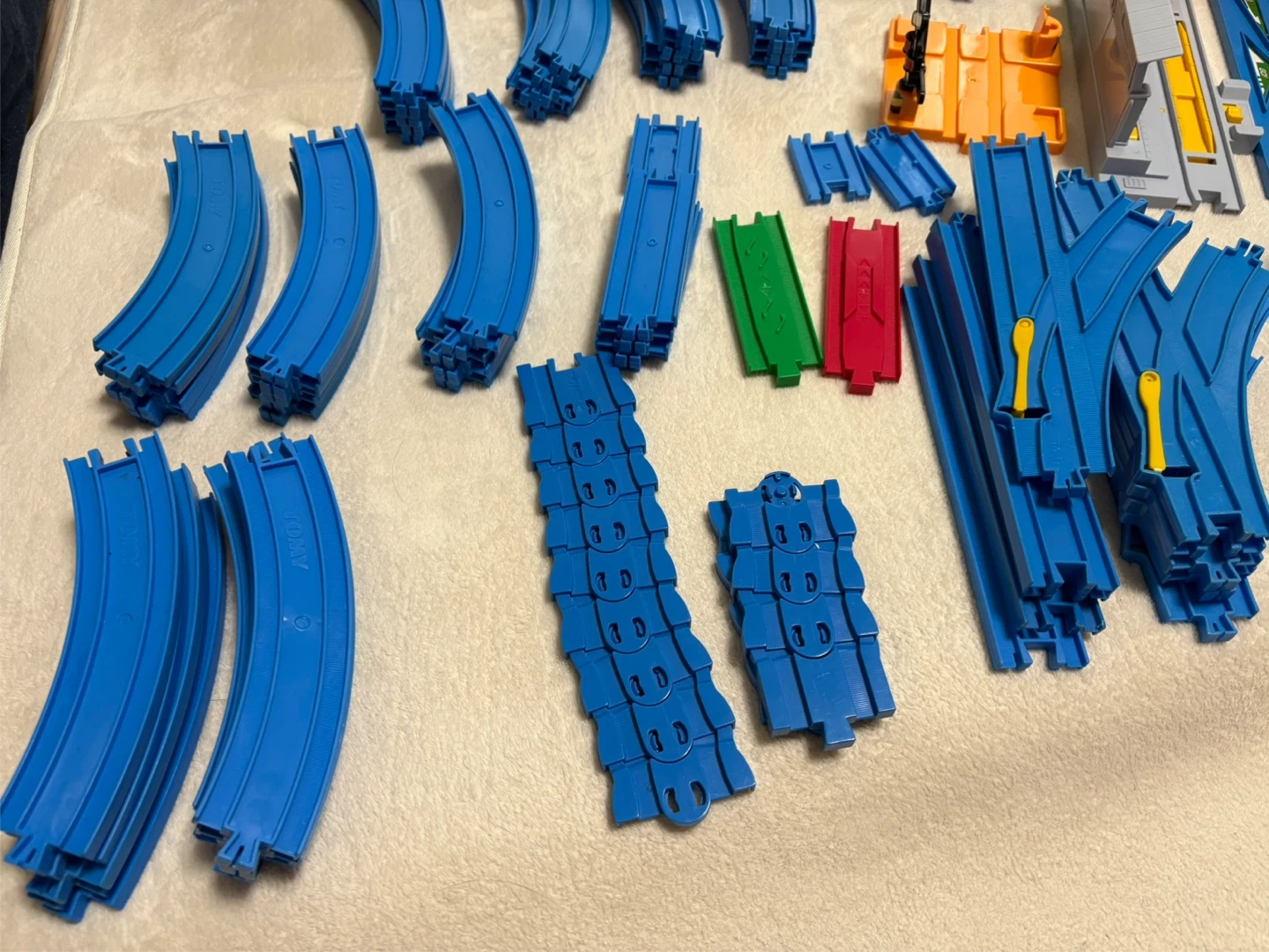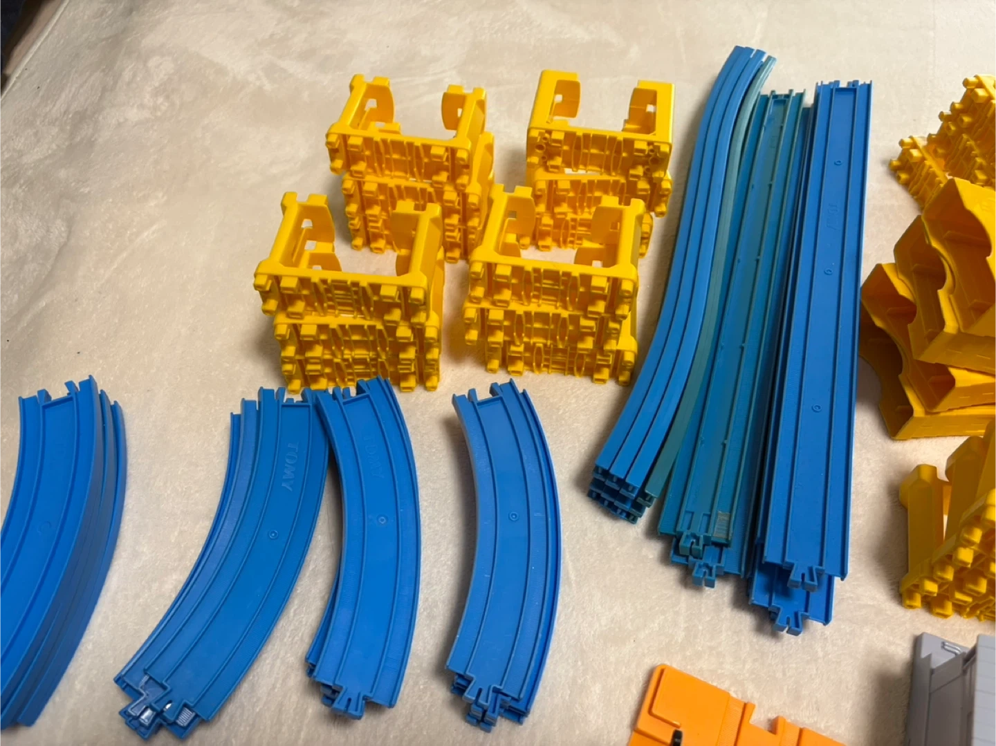 プラレールの線路とそのほかパーツです。 全部で130パーツほどあります。 単線カーブが44本、単線ストレートが長短合わせて9本、二列カーブが8本、橋脚37個、そのた細々としたもの合わせて130ほどパーツがあります。 色褪せているものがいくつかありますがそれ以外は特に問題ありません。 ダンボールに入れた状態でお渡しします。 ※猫を飼っているのでアレルギーの方はご遠慮ください。