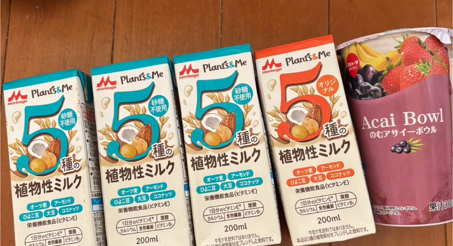 プランツ&ミーの植物性ミルクです ・種類:植物性ミルク ・容量:200ml×3 と色違い1本 ・賞味期限:2025年11月18日 のむアサイーボウル めいらく  賞味期限 2025/12/16 娘に買ってきたら美活ダイエットやめたとの事。 私はアサイーが苦手で💦 ビタミンEは若返り効果があります。 お肌艶々ですm(_ _)m