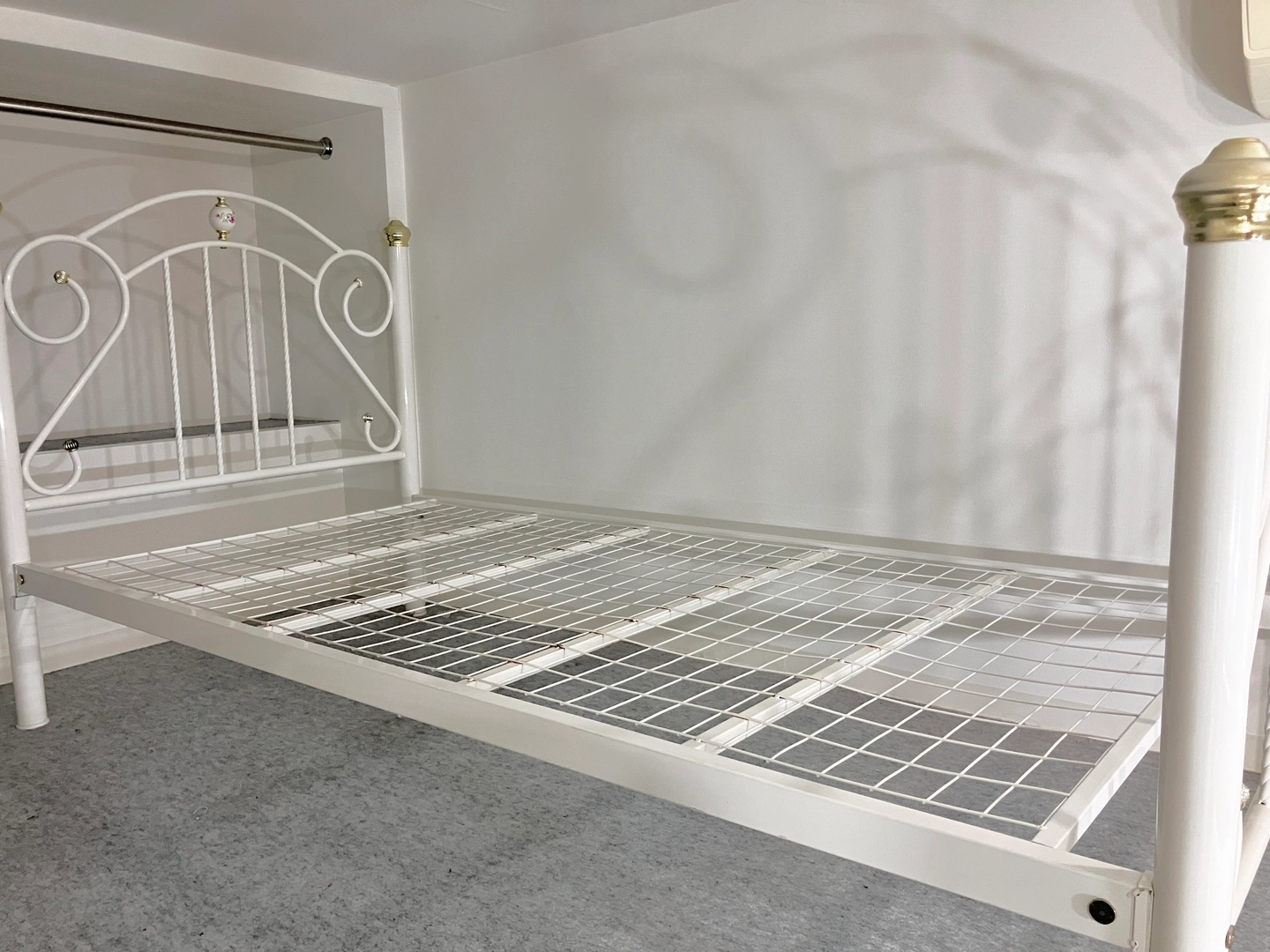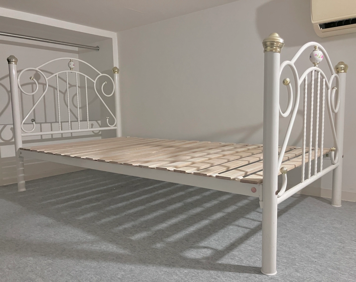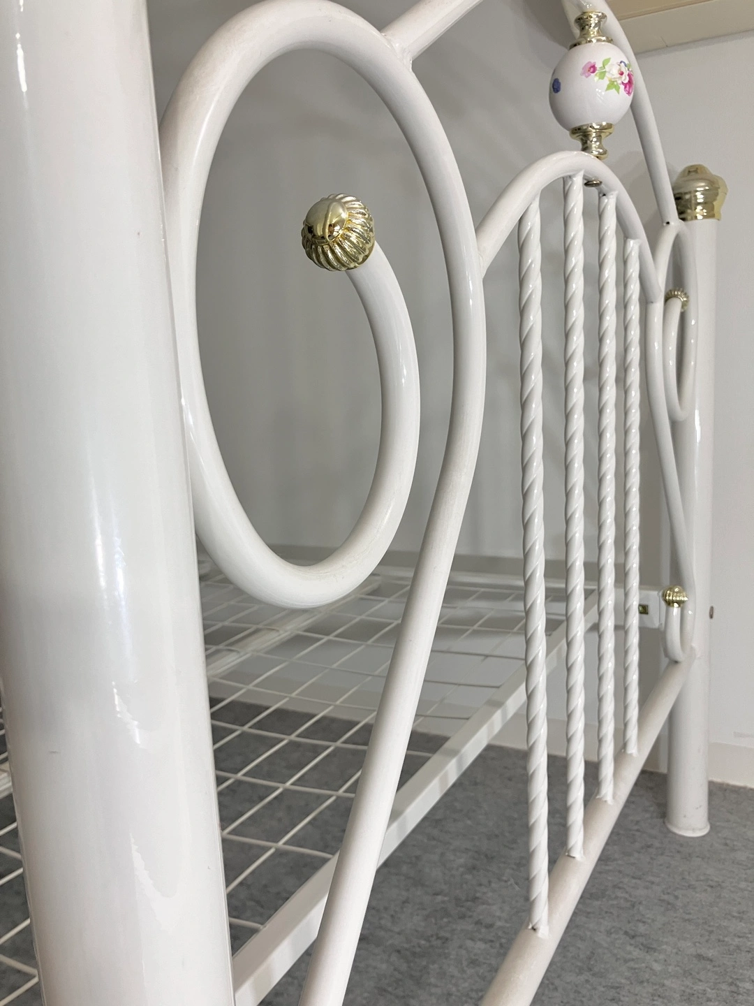 ロフト部屋で15年ほど使用したお姫様ベッドです。 まだまだしっかりとしていますが、ところどころサビ変色や傷もあります。画像をよくご確認ください。 ⭐︎ベッド内寸97×197 (シングルサイズ) 97×200の寝台1つ 前後の柵2つ の3つに分割できます。 組み立ては簡単です(説明書あり) 大きなお車で、複数名での運搬がオススメです。 ご 心配な方は、お取引をお控えください。 ※1500円で美品スノコ(使用期間半年)もお付けできます。ご希望の場合はご相談ください※ ※スノコサイズ100×200(大きめですが、布テープで繋がっているため、ピッタリと敷く事が出来ます) マットレスをご利用の場合、スノコは不要かと思います※