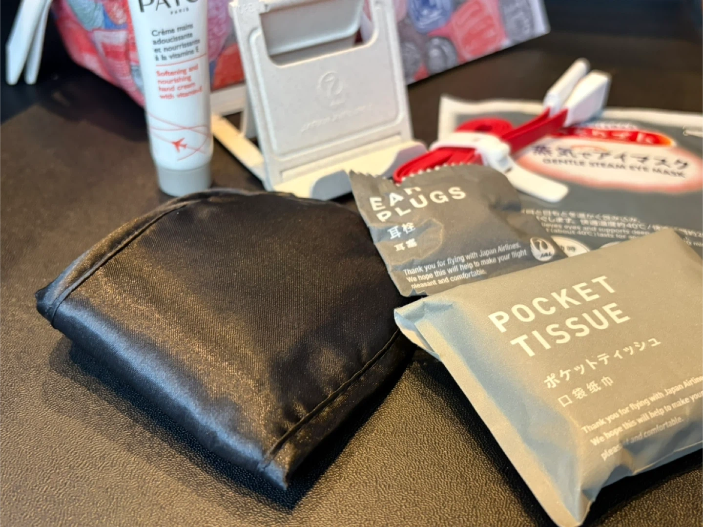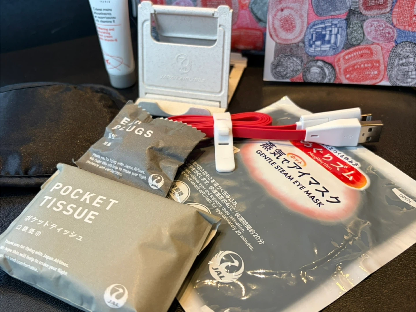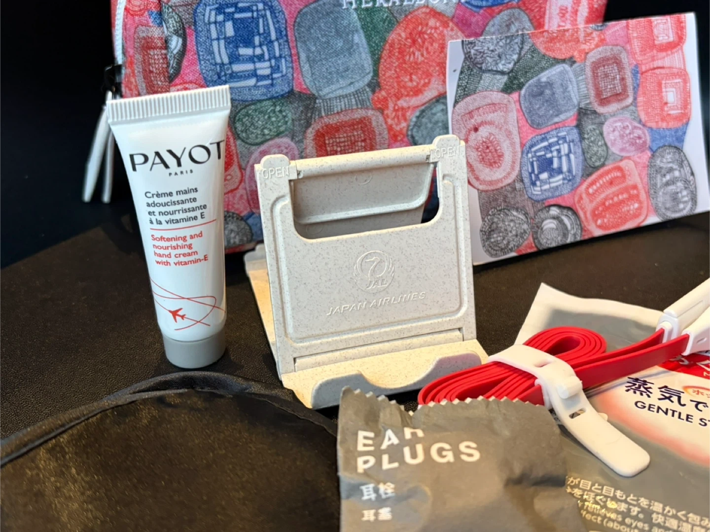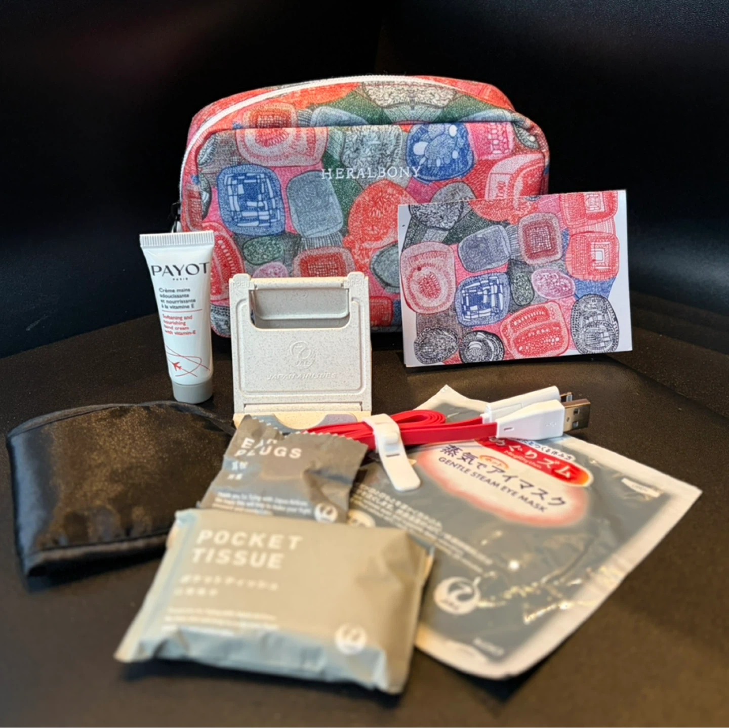 【ヘラルボニーのアメニティポーチ】 JALアメニティセットです。 トラベルアメニティ+ヘラルボニーのポーチ2つ 旅行に必要な物が入っております。 【内容】 ・ヘラルボニー ポーチ ・PAYOT ハンドクリーム ・JAL スマホスタンド ・JAL 耳栓 ・JAL ポケットティッシュ ・JAL 蒸気でアイマスク ・USBケーブル ・ポストカード2枚 ※別のベラルボニーポーチ(アメニティなし)も差し上げます。 アメニティは使用しておりませんが、自宅保管であることをご了承ください。