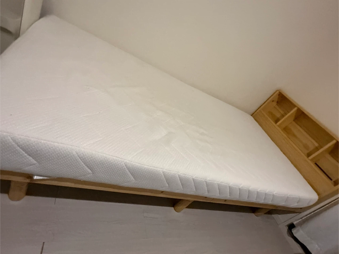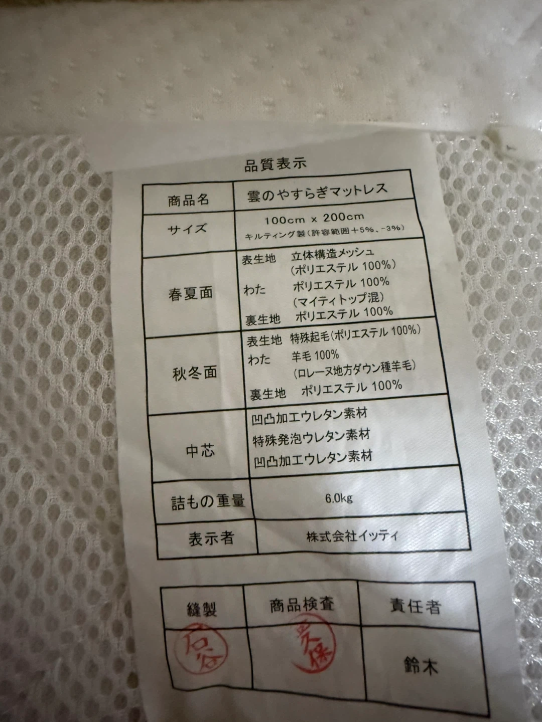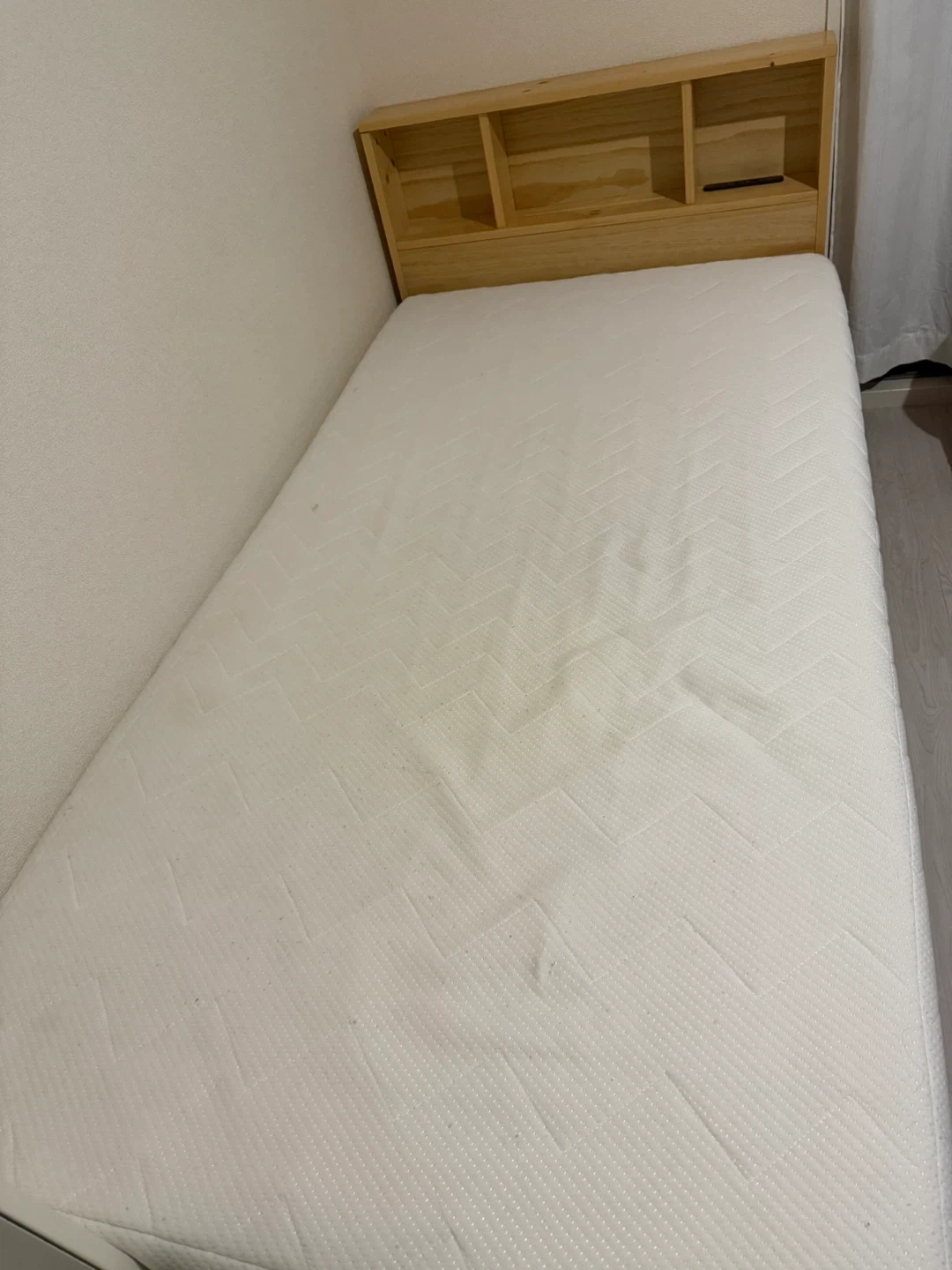 シングルサイズのマットレスとベッドフレームをセットでお譲りします。 【情報】 マットレス(雲のやすらぎ) 定価:39,800円(税込) サイズ:100cm x 200cm×17cm(シングル) 購入時期:2021年12月頃 【状態】 使用感があります 秋冬面に毛玉とシミが少し見受けられます (※写真をご確認ください) 【情報】 ベッドフレーム(モダンデコ) 定価:12,800円(税込) 【状態】 コンセントが壊れています 脚は高さ調整が3段階で可能です 中古品であることご了承いただきますようお願いいたします。 10月26日〜31日までのお受け取りをお願いいたします。 なお、平日は仕事の都合上、夜間の受け渡しとなります。