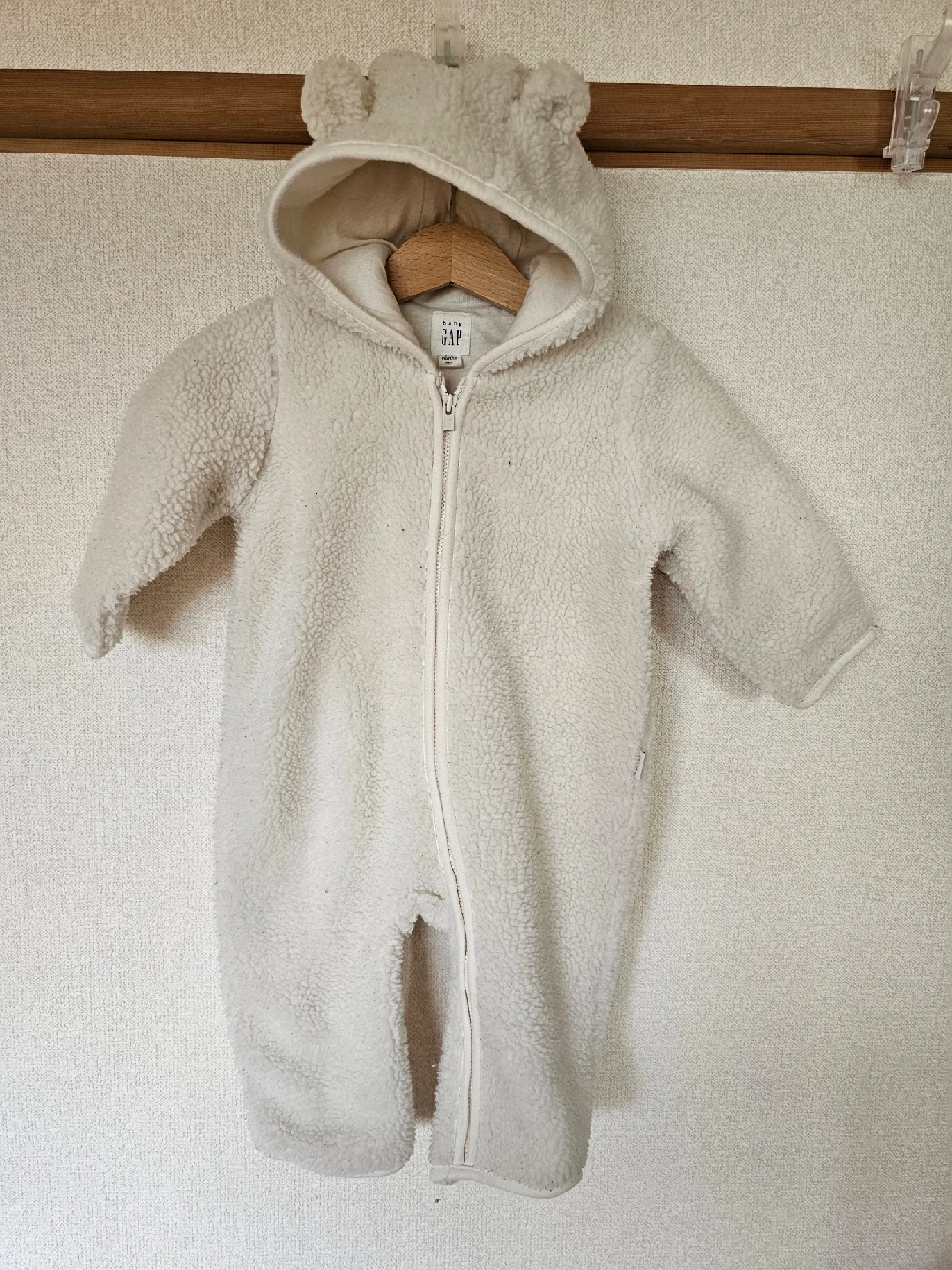 ベビーギャップのくまロンパースです ・サイズ:6-12 months ・カラー:ホワイト ・素材:ボア ・フードに耳付き ・外出時に使用していたので、使用感あり。毛玉。 中古品であることご了承ください