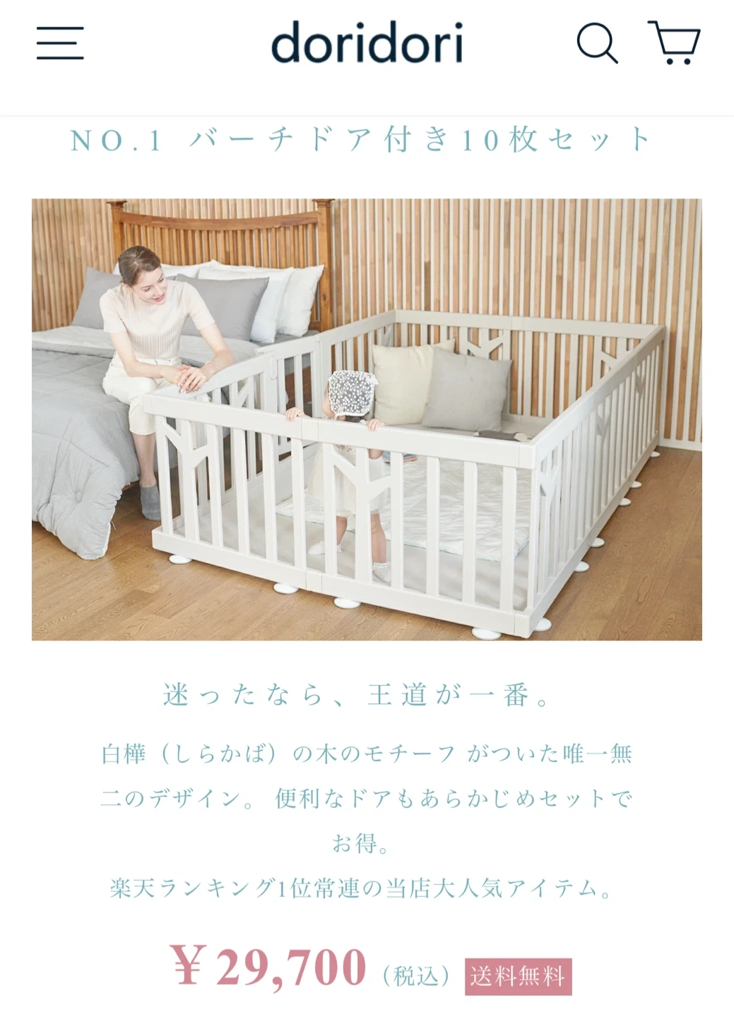 https://doridori.co.jp/products/if112?variant=51792139223347 ・色:ホワイト ・購入時期:2021年6月(楽天公式店) ・使用状況:約2年はリビングで子供の遊び場として使用、約2年は寝室の隅で分解して保管 ・ドアは問題なく使用可能 ・各パネルは使用に伴う汚れ、細かなキズあり ・円形ノンスリップのゴム部分は経年劣化あり ・破損や割れなどなし ・家庭内にペットなし、喫煙者なし ★車などで取りに来ていただく想定でおります。 ★受け渡し場所や価格はご相談ください。 ⭐︎このサークルにぴったりサイズのマットレスは、同ブランド(https://doridori.co.jp)にて販売されています。