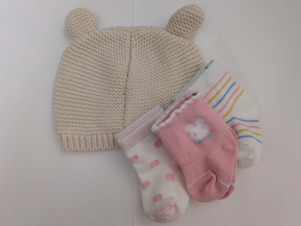 新生児用 ベビーの帽子と靴下のセットです ・帽子:アイボリー色、ニット素材、くま耳付き、GAP ・靴下:3足セット、サイズは7〜9と記載 ・状態:使用感少なめ GAPの帽子はタグを切ってあります。 使用回数は少ないですが、長期保管していましたので神経質な方はご購入お控えください。 猫を一匹飼っています猫アレルギー等ある方はご購入お控えください。 中古品であることご了承ください お取引はららぽーと横浜でも致します。ご相談ください。
