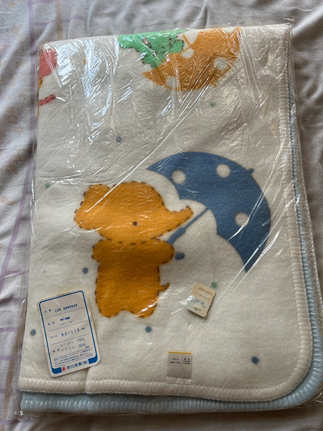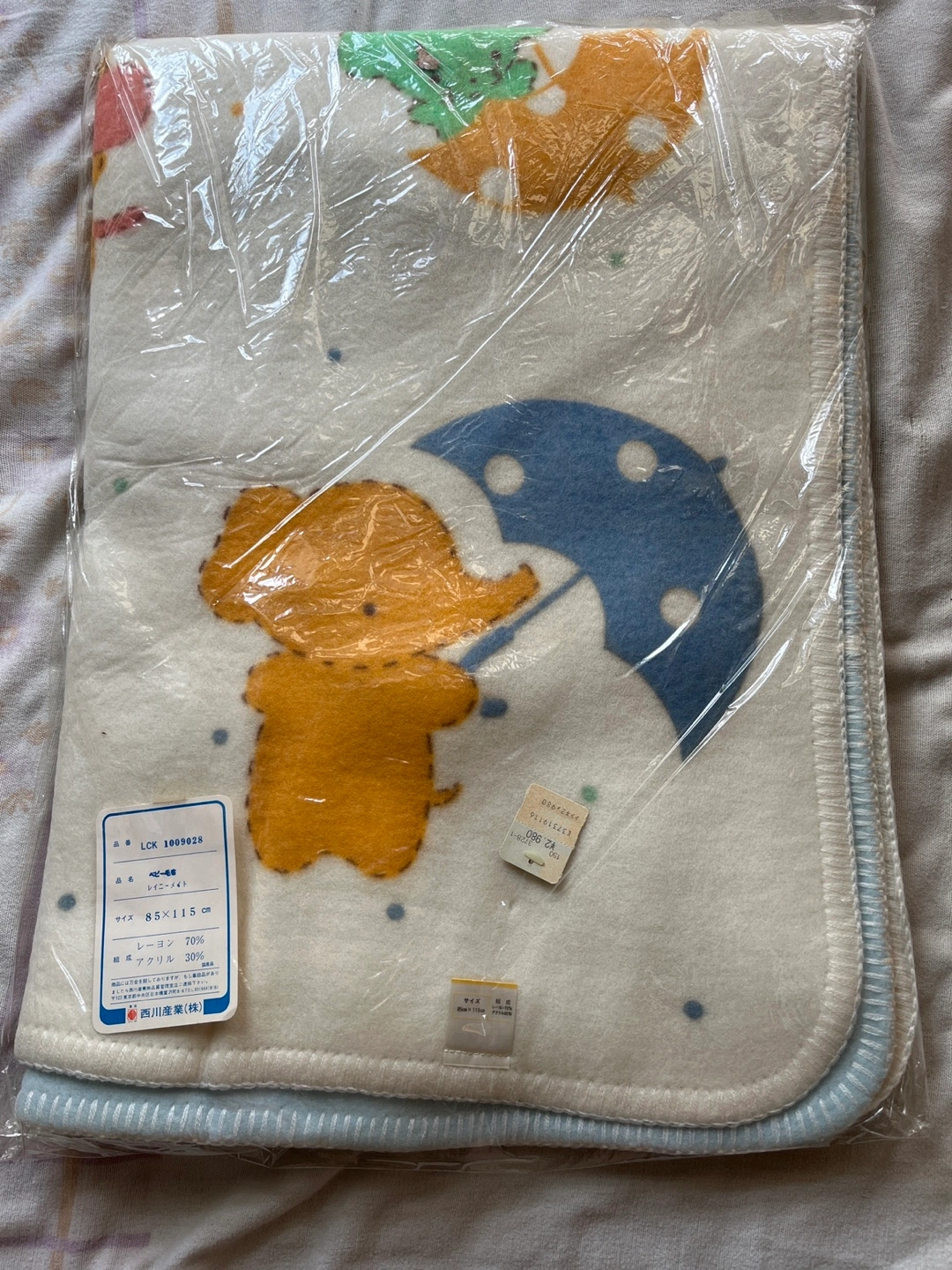 新品未使用の西川産業(株)野ベビー毛布です。 サイズ85✖️115cm レーヨン70% アクリル30% 定価2980円の商品です。