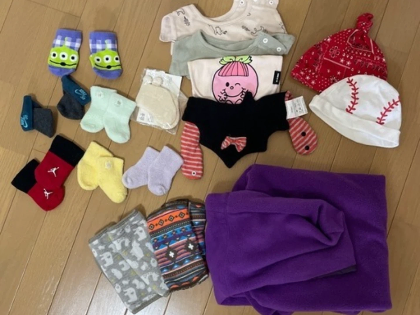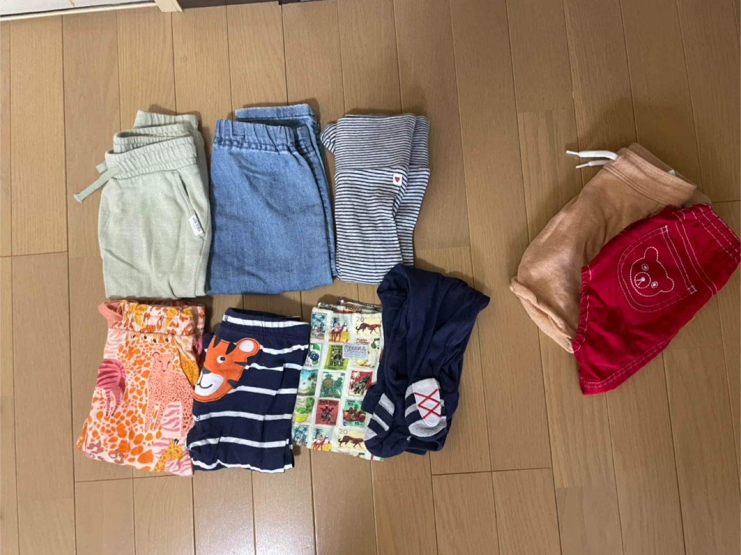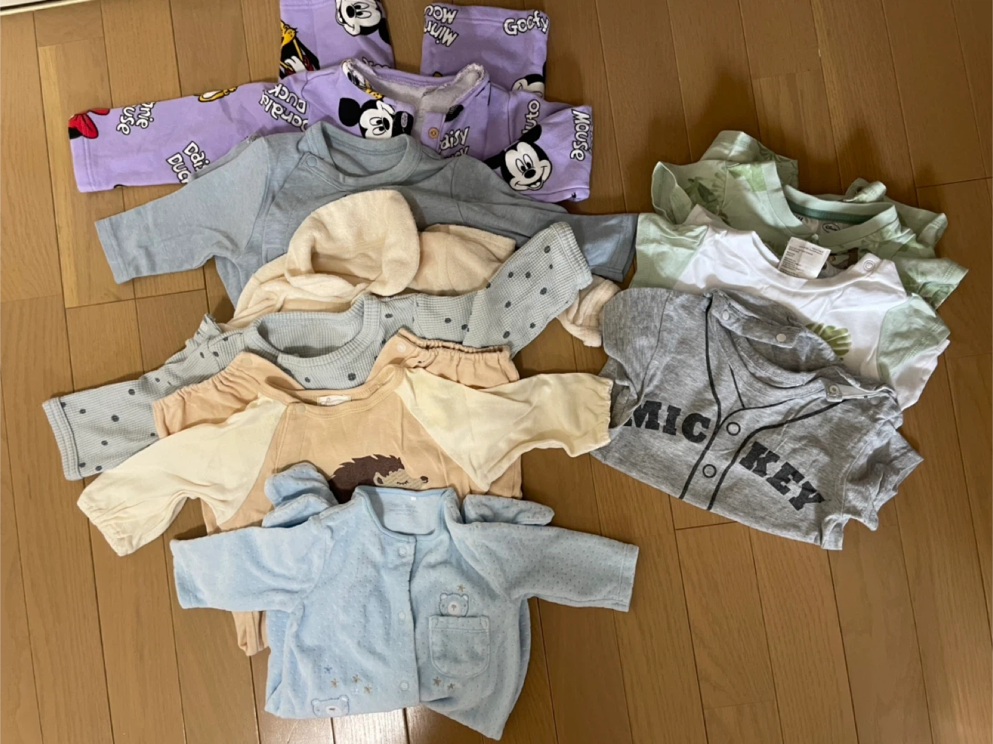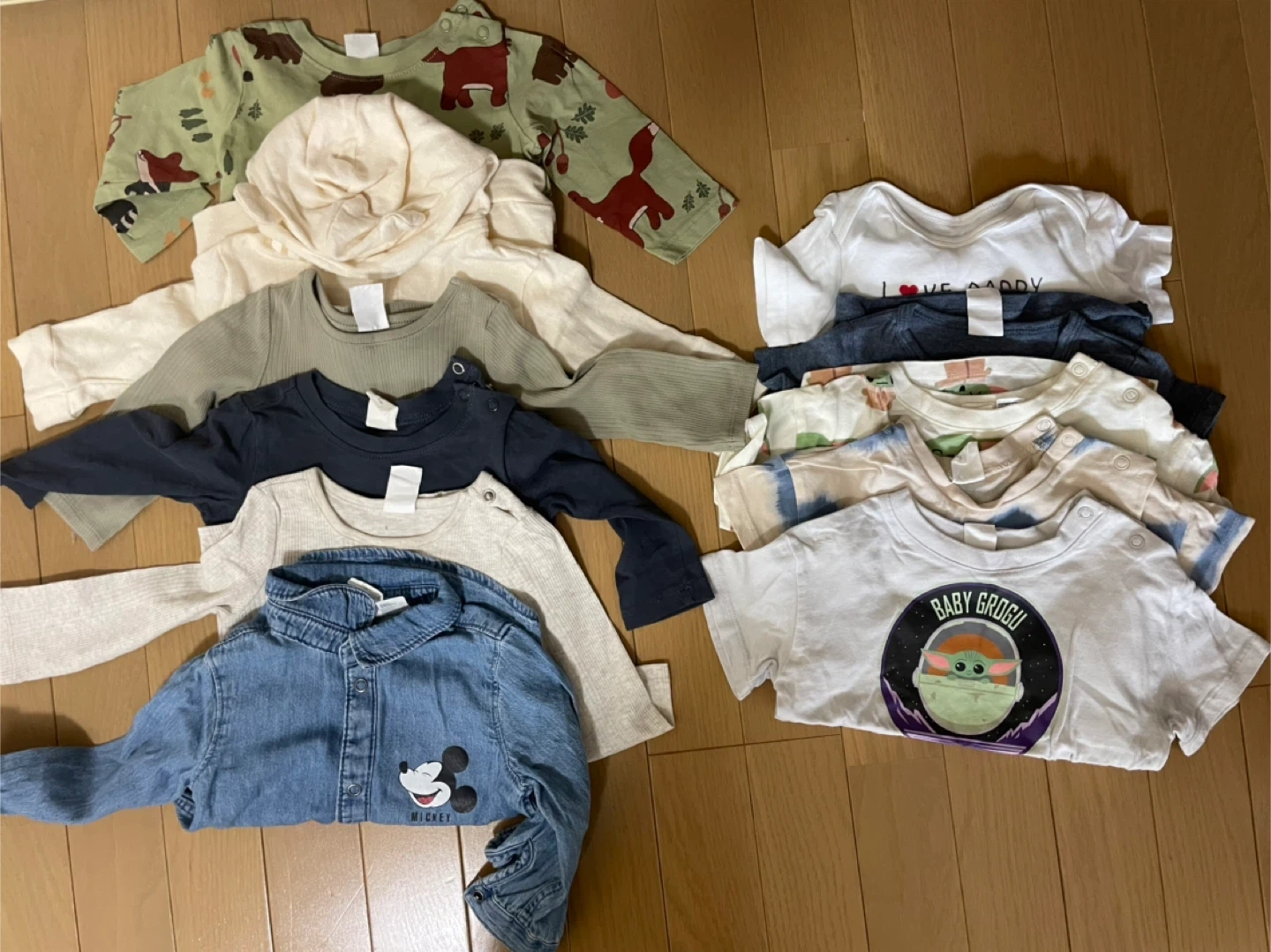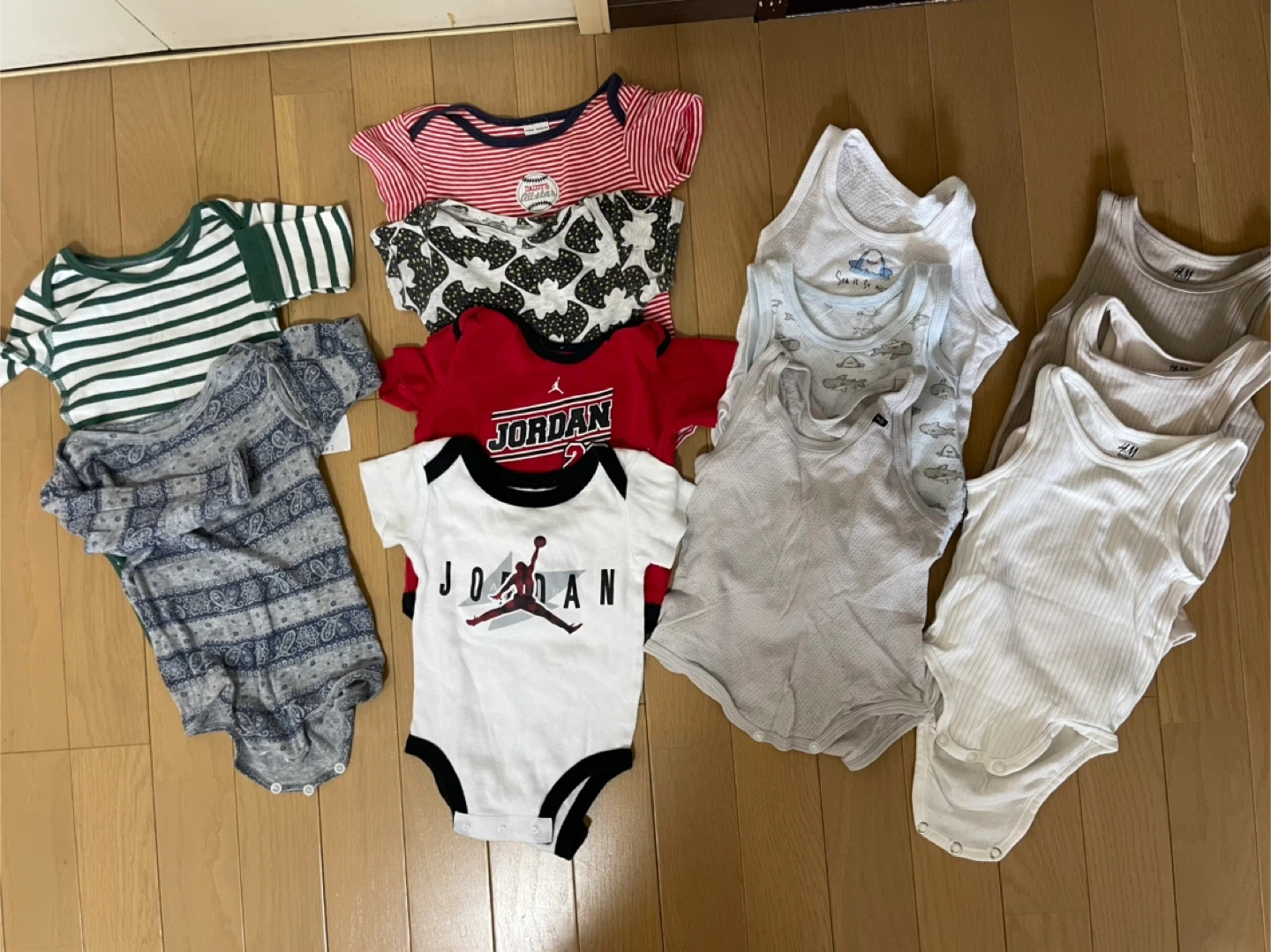 半袖tシャツ70 5枚 長袖トップス70 6枚 長ボトムス70 7枚 短ボトムス70 2枚 長ロンパース70 6枚 半袖ロンパース70 3枚 長袖下着70 2枚 半袖下着70 4枚 タンクトップ70 3枚 メッシュタンクトップ70 3枚 スタイ 4枚 帽子 2枚 靴下 7枚 抱っこ紐防寒ケープ 1枚 抱っこ紐よだれガード 2枚 スリーパー 1枚 合計58点 着用期間は短いですが使用感、シミ等はあります。 H&M、NIKE、西松屋、ハッカ等ブランドも色々です。