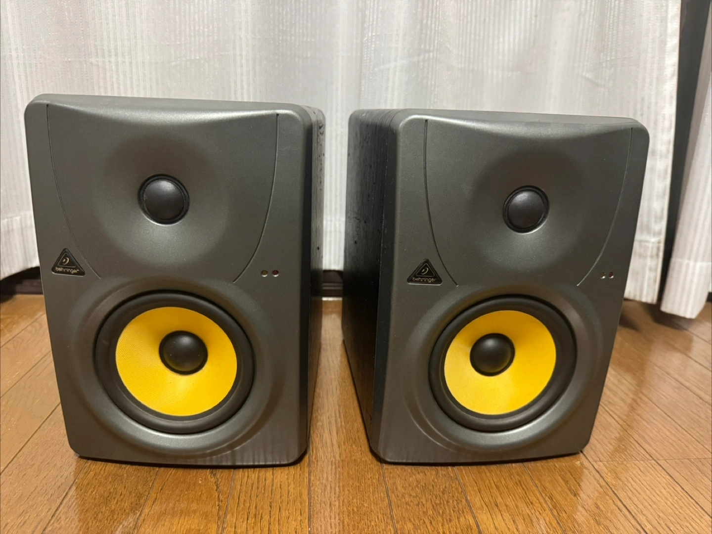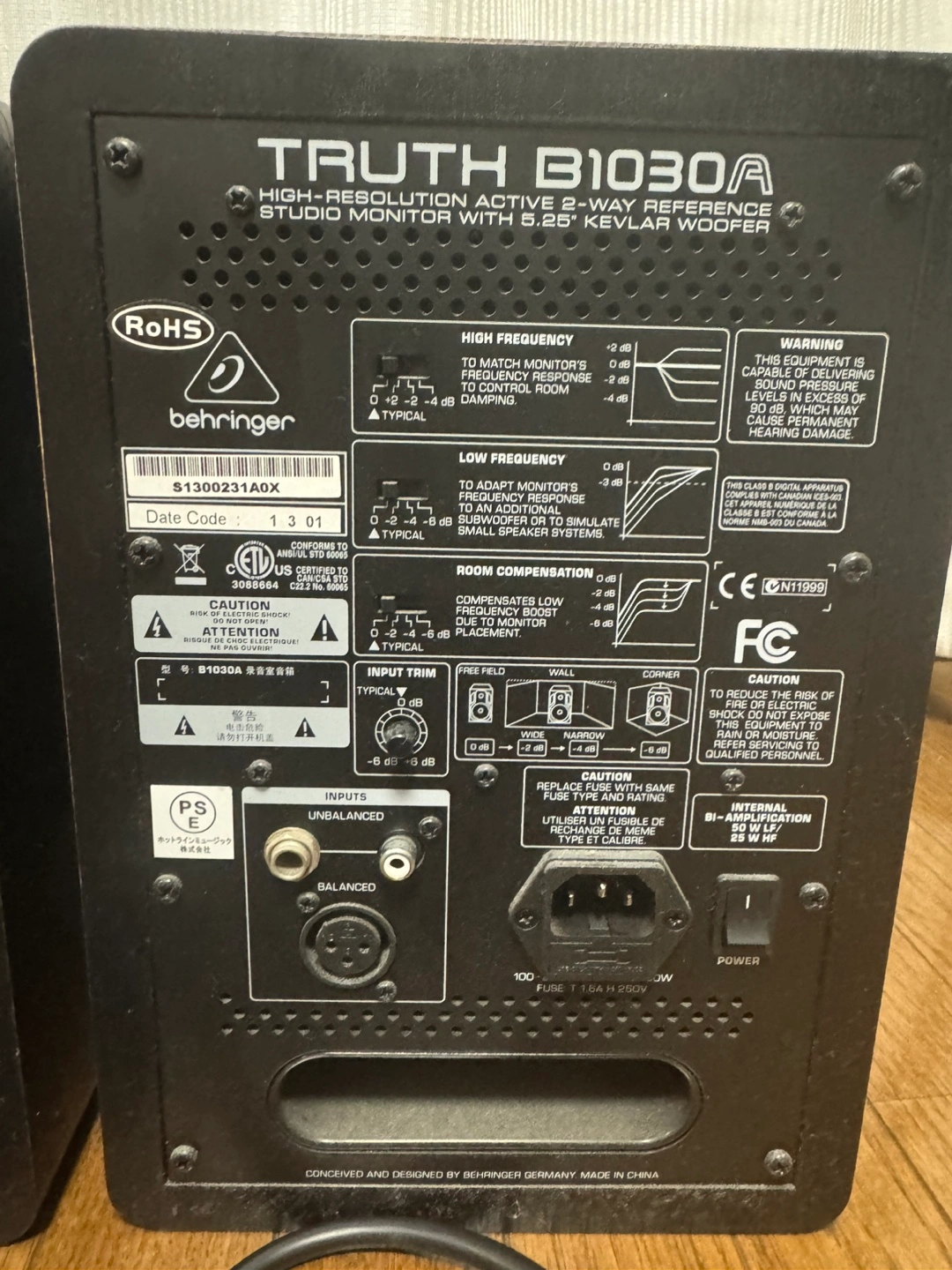【情報】 ブランド:ベリンガー 型番:TRUTH B1030A 種類:スタジオモニタースピーカー 【仕様】 ◆パワードモニタースピーカー ・周波数レンジ:50Hz~20kHz ・ドライバー構成:HF: 1インチ:LF: 5.25インチ ・クロスオーバー周波数:4.3kHz ・パワーア ンプ:低域50W(ピーク)、4Ω、高域25W(ピーク)、4Ω ・最大音圧レベル:110dB SPL(1m、ペア) ・入力:XLR×1、標準フォーンジャック×1、RCA×1 ・イコライザー:高域: 4段階、低域: 4段階、ルーム補正: 4段階 ・電源:AC100V、50/60Hz ・消費電力:100W ・寸法(W×H×D):198×288×280mm ・質量:5.5kg(1本) 【付属品】 電源ケーブル、オーディオケーブル