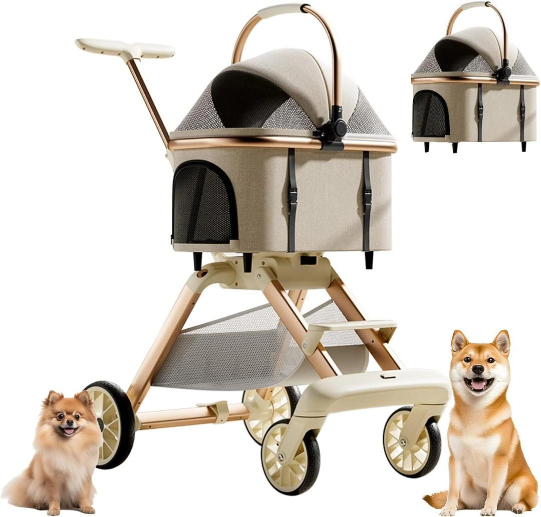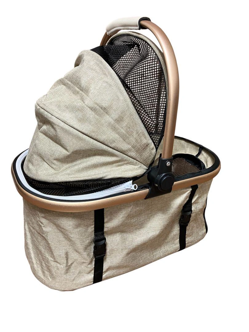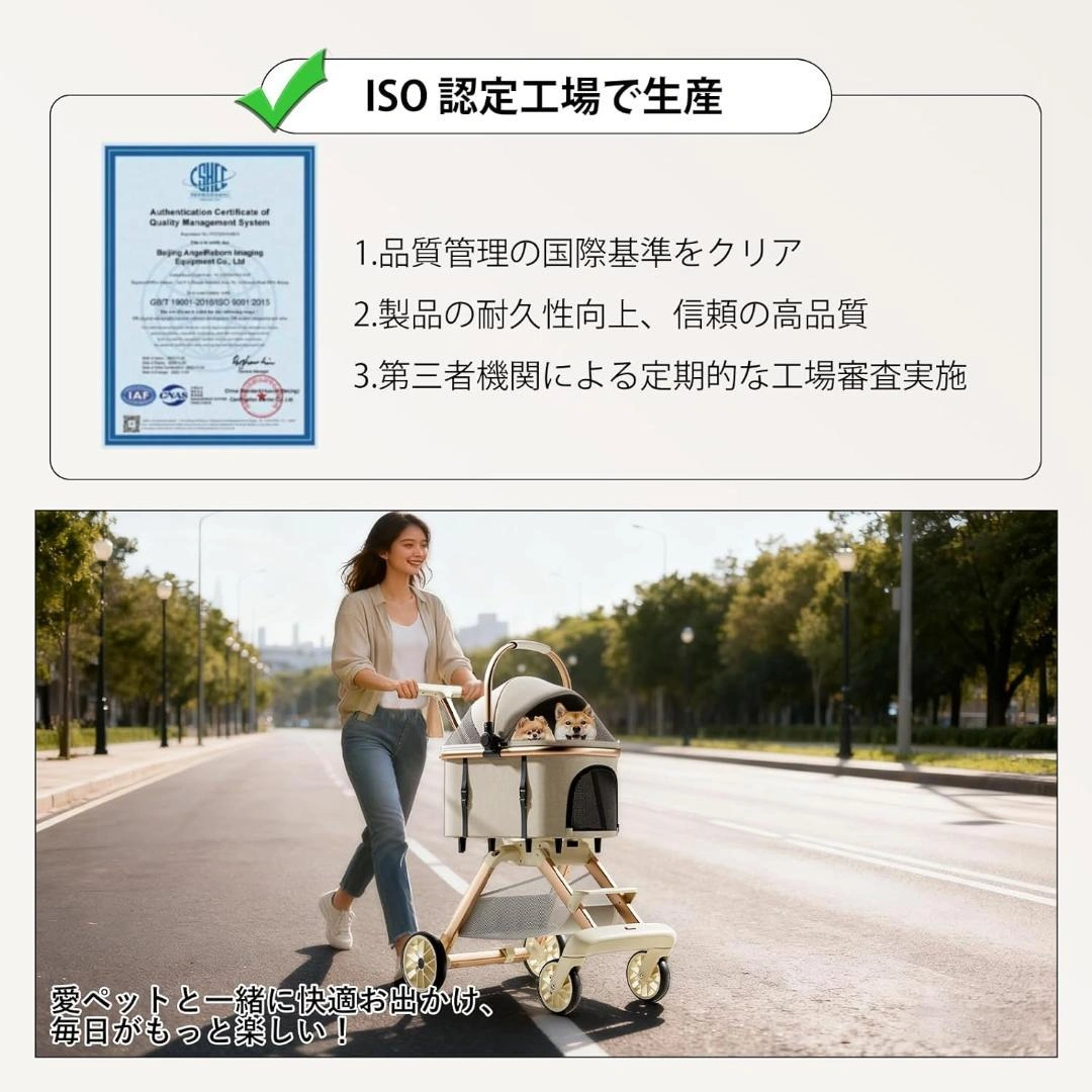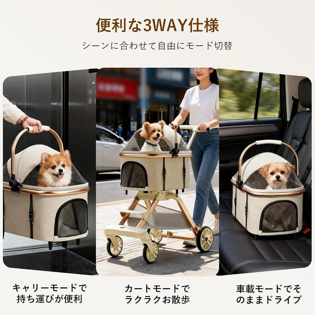 ご覧いただきありがとうございます✨ 点検、撮影のため、開封しておりますが、新品、未使用です。実物写真(9〜10) 色 カーキ 【商品仕様】整車重量は約6.5kg、展開サイズは約72×53×104cm、折りたたみサイズは約53×60×26cm、提篮重量は約1.6kg、提篮サイズは約50×30cm。最大耐荷重は約30kgで、体重10kg以内、体長50cm以内の中小型犬に適しています。本体フレームはアルミ合金製、生地は600D防水オックスフォード布を使用。車輪は前輪15cm、後輪19cmのEVA耐摩耗発泡製で、安定した走行が可能です。 【分離型&折りたたみ可能】こちらのペットカートは分離式デザインを採用し、バスケット部分は簡単に取り外せます。手提げバッグとして使用したり、車内に設置して車載用ペットバッグとしても活用可能です。折りたためてコンパクトに、更にトランクにも収納することが出来ます。 【360°前輪回転で操作簡単】前輪は360°回転可能で、内蔵ベアリング設計により小回りが利き、片手でもスムーズに方向転換できます。後輪には一体型ブレーキを搭載しており、一踏みで固定可能。斜面の上り下りでもペットが快適に移動できる仕様です。大直径ホイールはPU+EVAの耐摩耗素材を使用し、衝撃吸収システムと組み合わせることで、石畳、泥道、芝生、減速帯などの路面でも安定した走行を実現します。 【広々トップカバー&通気性】トップカバーは180°以上開閉可能で、空間をさらに広く確保できます。中型犬も自由に立ったり横になったりでき、快適な姿勢を保てます。前後と側面の3面メッシュ窓により通気性が向上し、空気がよく循環するため、長時間の外出でもペットが快適に過ごせて、状態も確認しやすい。通気面積は一般的な製品より約35%アップしています。 【収納便利&清潔維持】バスケットには小物用ポケットが付いており、スマホやリードなどを収めることができます。フレーム下部には大容量の収納スペースを備え、散歩や買い物に必要なペット用品も収納可能です。バスケット内のマットは取り外して洗濯でき、清潔を保ちやすい設計です。フレームは素早く折りたたむことができ、収納や持ち運びが簡単です。1~2匹の小型・中型犬に適しています。 ご希望の方はお気軽にご連絡ください。