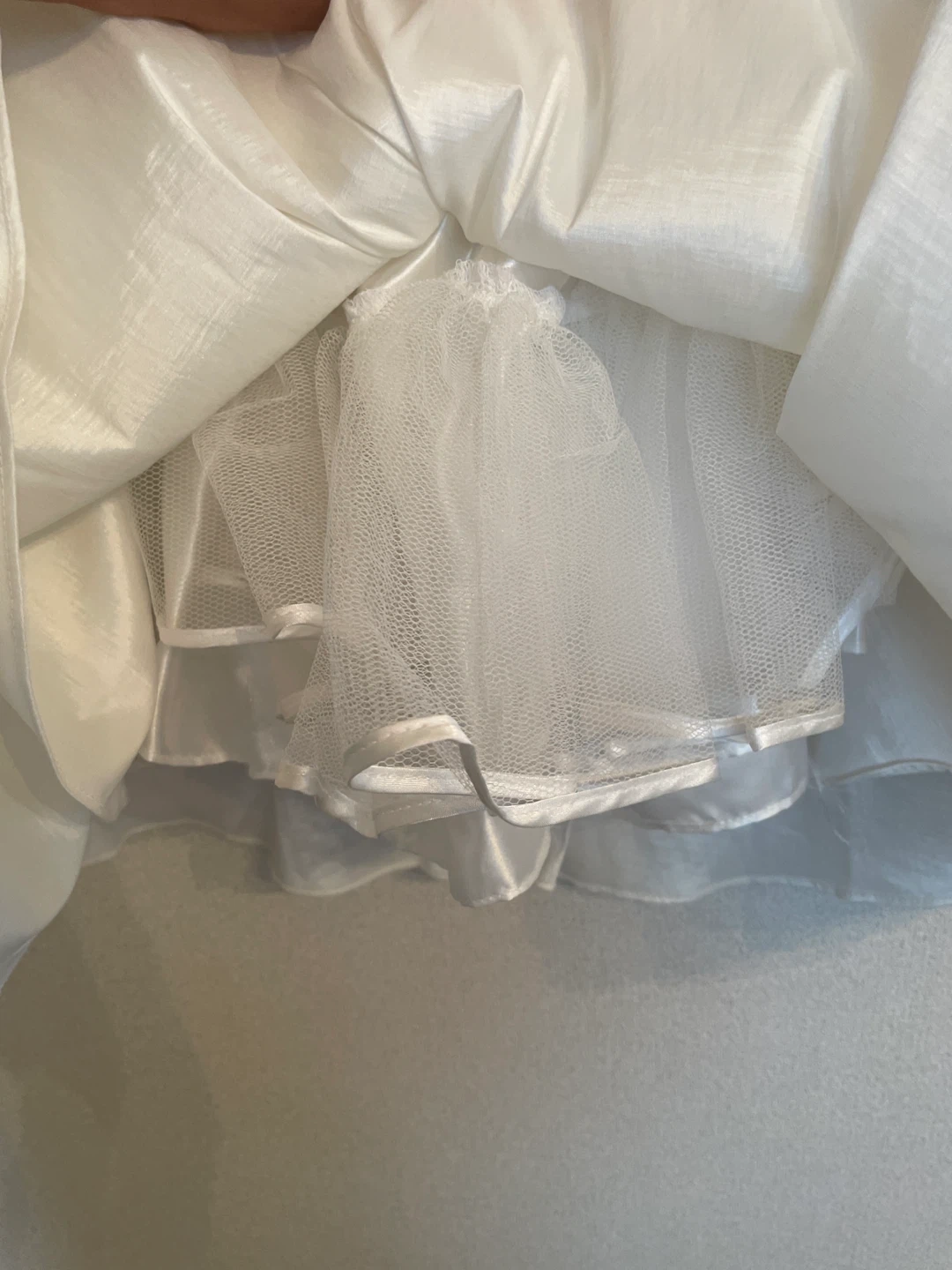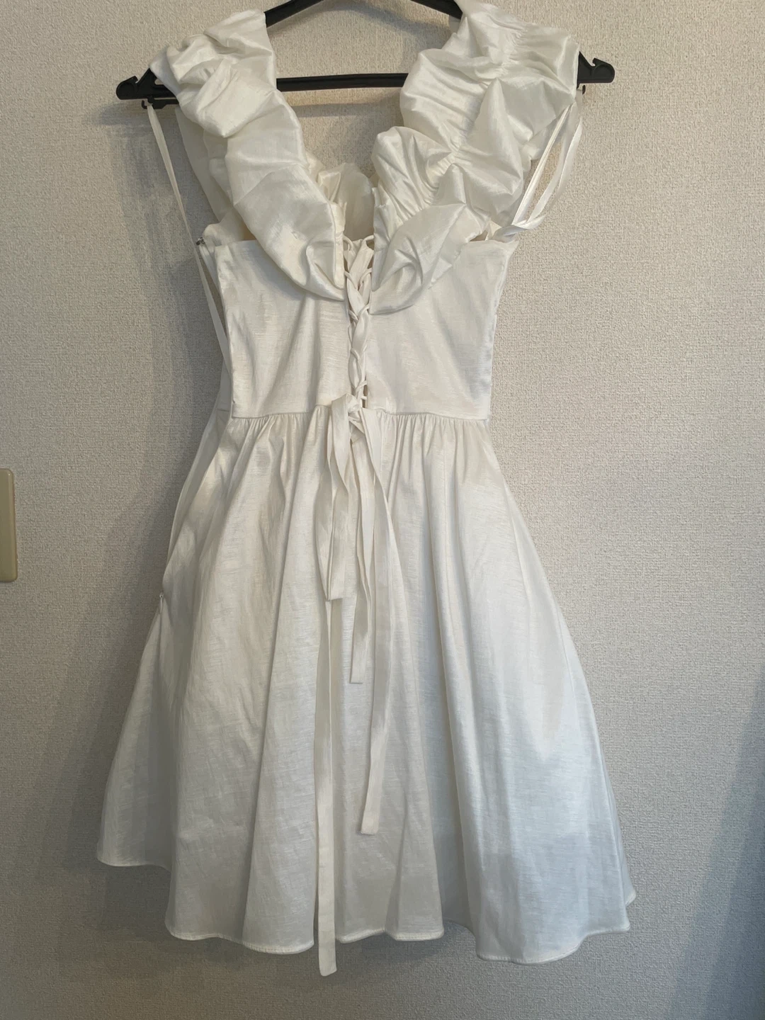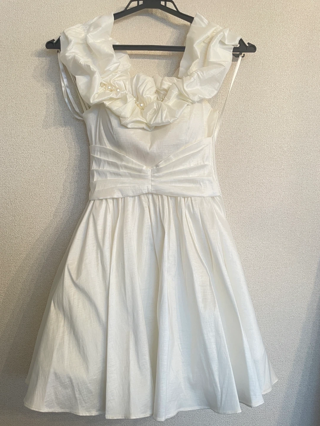 白いミニワンピースです ・色:白 ・デザイン:フリル、パール ・状態:目立つ傷や汚れなし 結婚式のイベントで一度使用しました 中古品であることご了承ください