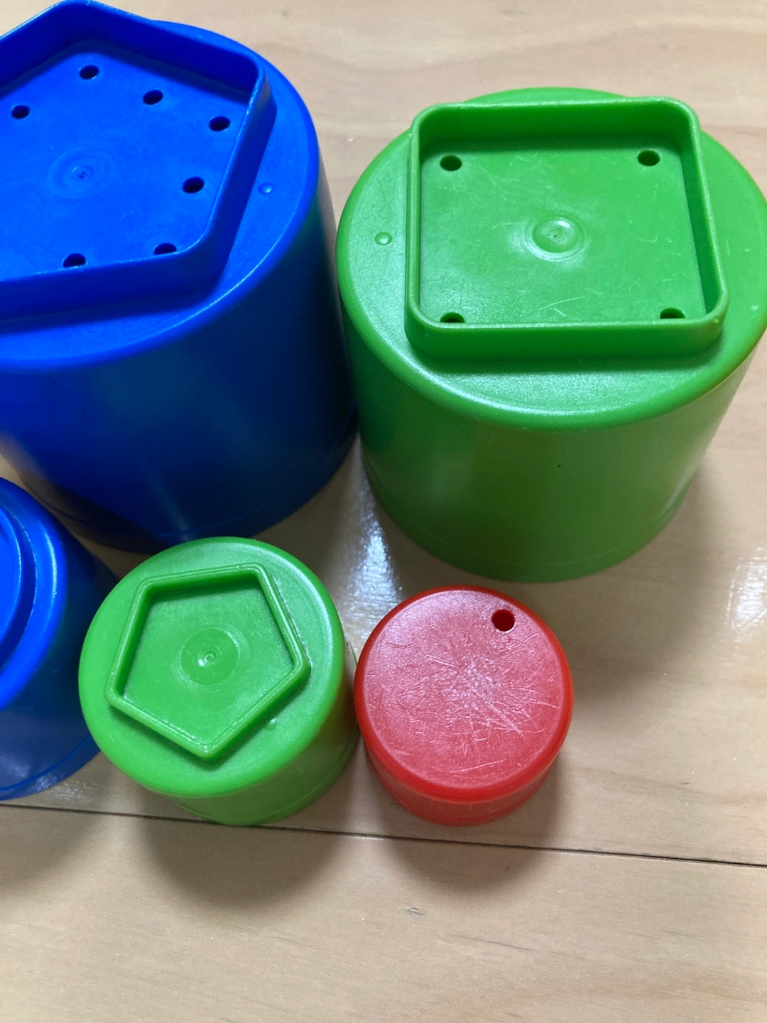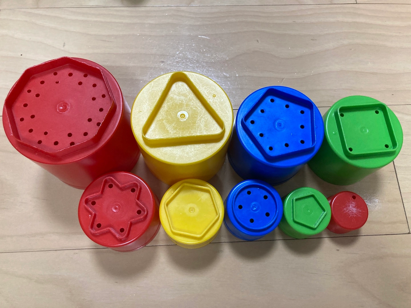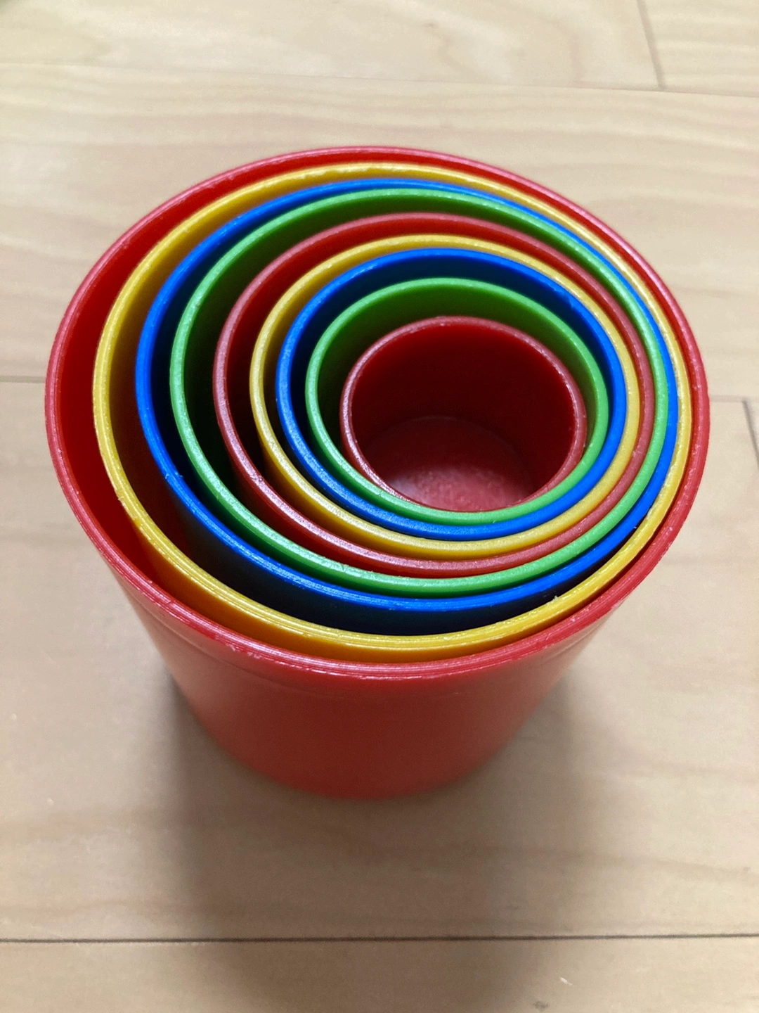 ボーネルンドのスタッキングビーカーです! 重ねたり並べたり沢山遊んでいました(^^) 細かな傷あ りますが、割れはなく、十分お使いいただけると思います。 アルコール消毒してお渡しいたします。 定価 2,310円 ===公式ホームページより=== 大きい順に9個のビーカーを並べていくと、全長51cmの長さになります。積み上げて遊んだり、砂の型抜きに使ったり、あそび方はいろいろ。ビーカーの底はそれぞれの大きさで異なる数の穴があいているので、水を入れると穴から水が流れるのを楽しめます。遊びながら自然と、色・大きさの違い・数を認識していきます。 一番大きなビーカーサイズ:9×9×10cm 一番小さなビーカーサイズ:3.5×3.5×2.8cm 【多彩な色合い】 赤、緑、青、黄色、オレンジといった多様な色の組み合わせが特徴で、子供たちの興味を引きます。 【安全な素材】 プラスチック製で、耐久性があり、子供が遊ぶのに適した安全な素材です。 【クリエイティブな遊び】 粘土遊びに最適で、子供の創造力を育むためのアイテムです。 #ボーネルンド #ダントーイ #スタッキングビーカー