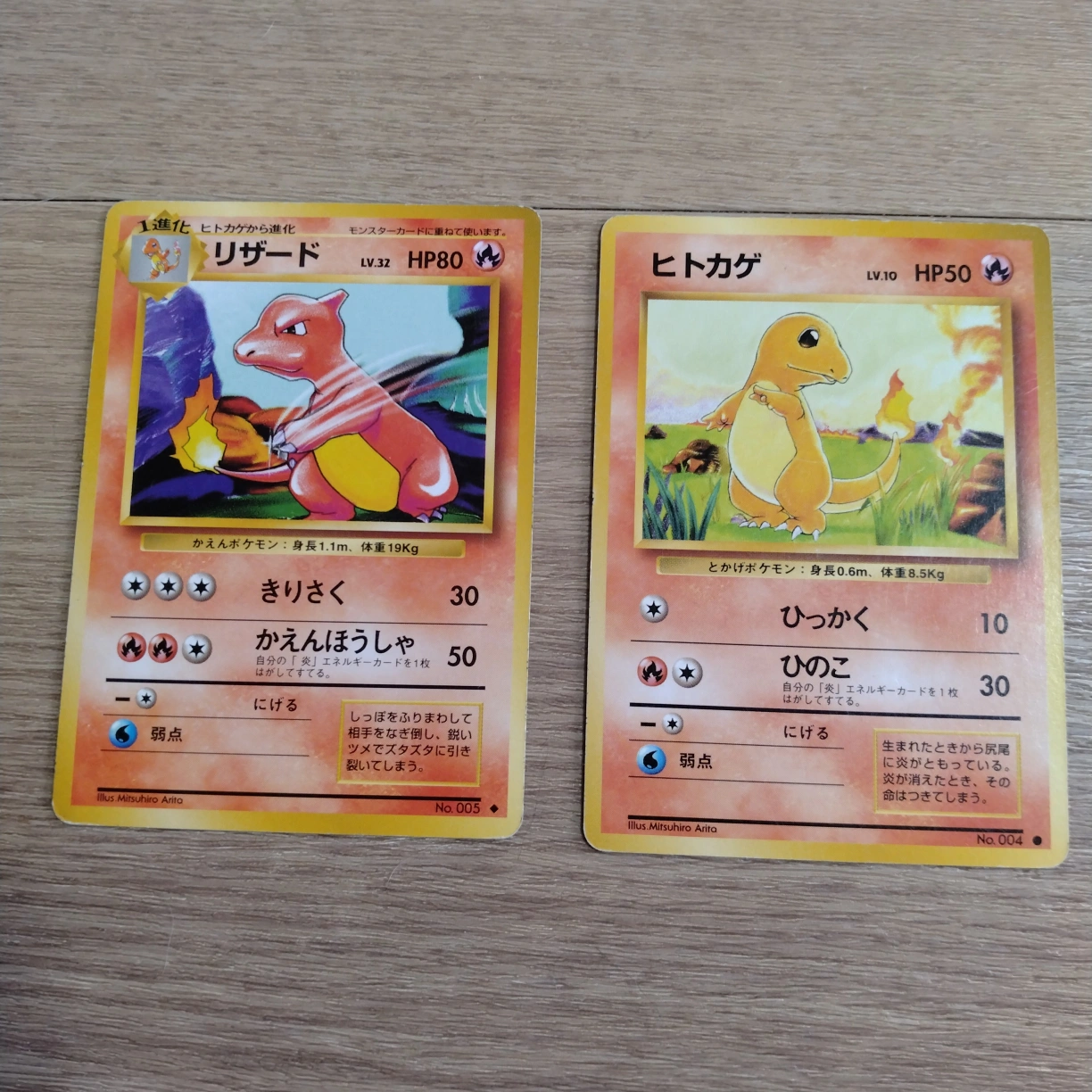 ポケモンカード2枚セットです。 当時遊んでいた古いものになりますので気になる方はお取引をご遠慮ください。 ・リザード ・ヒトカゲ ・旧裏 ・裏面に「POCKET MONSTERS CARD GAME」と記載あり ・使用感あり 中古品であることご了承ください