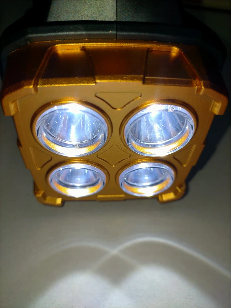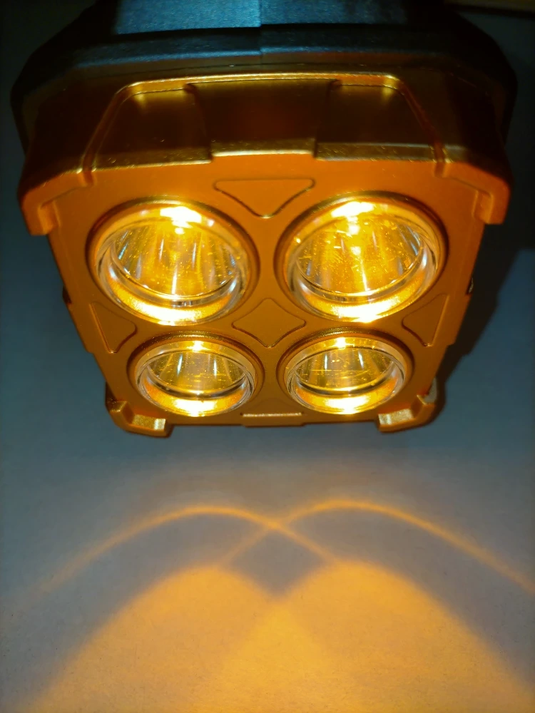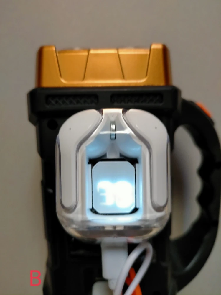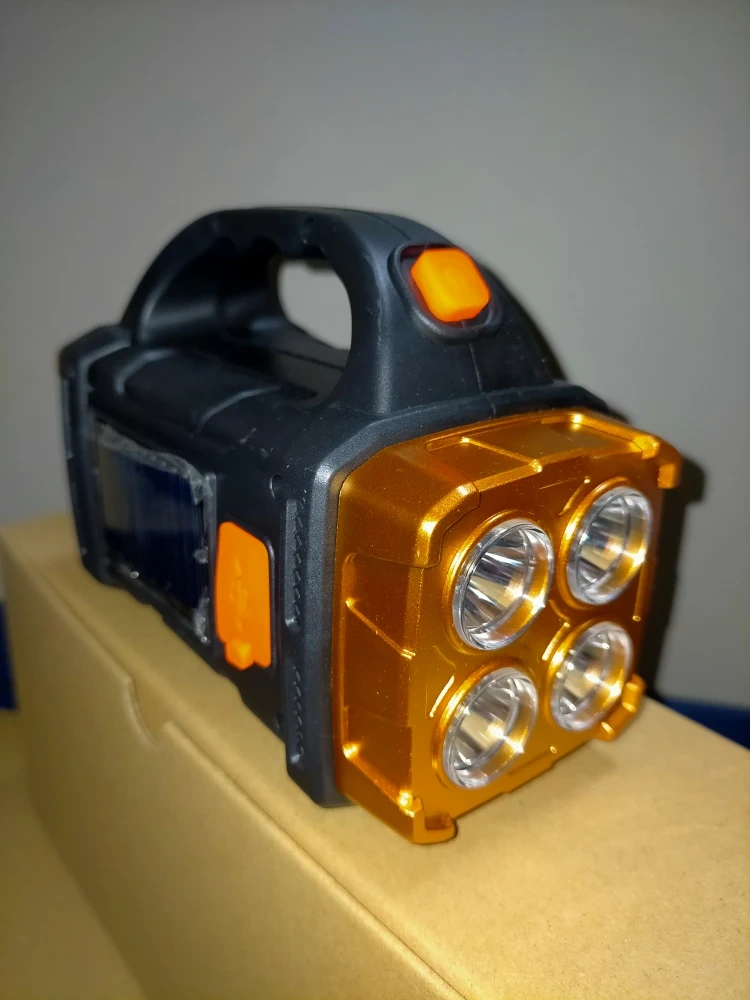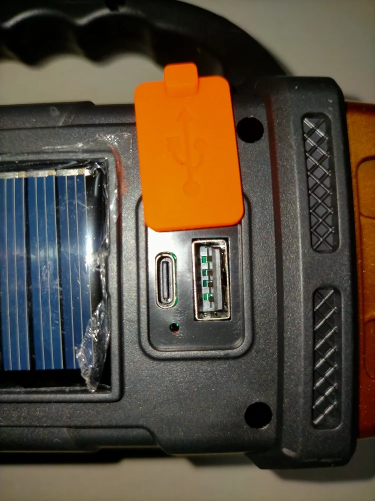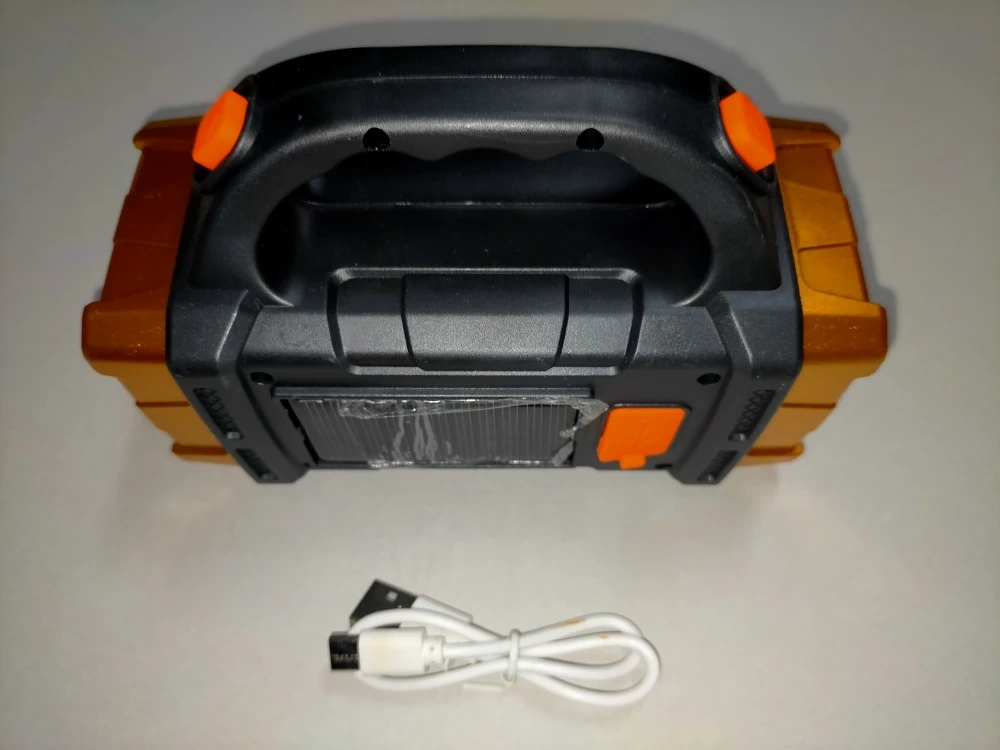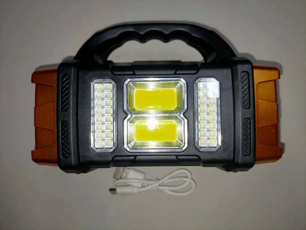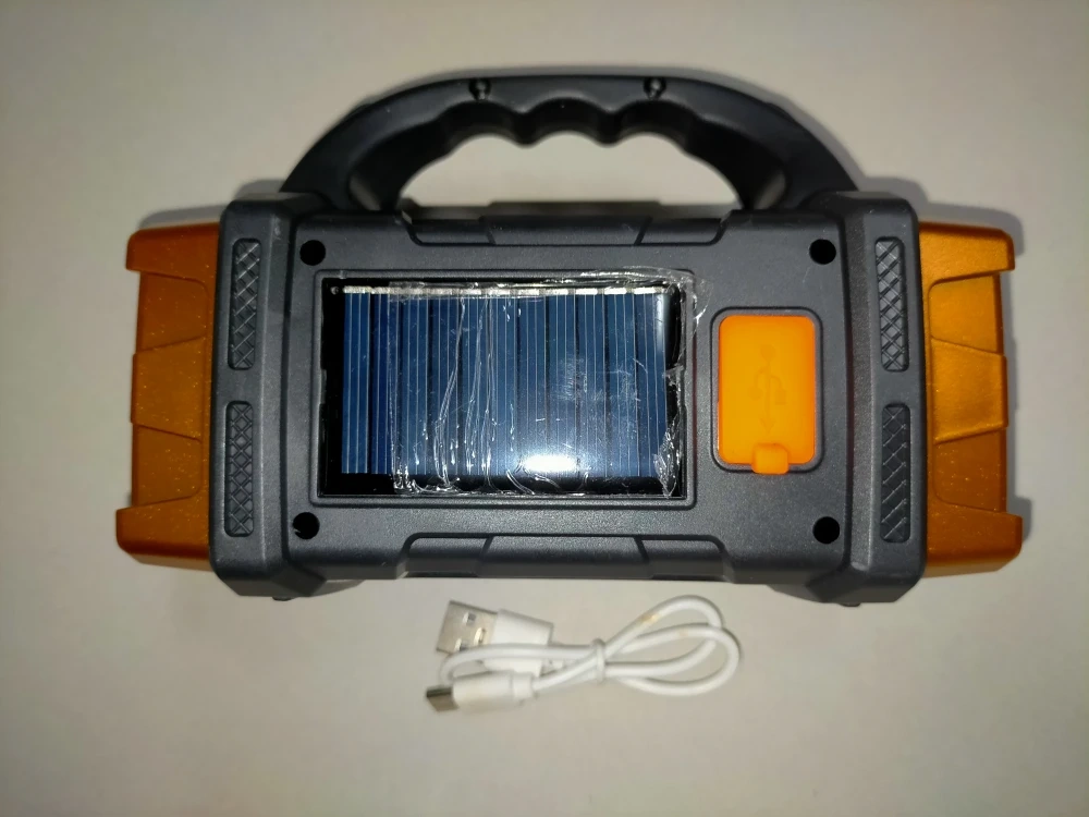 点灯箇所(5、7、8枚目) 画像5、6枚目の箇所はどちらも白色に点灯します。 黄色い面は(ソーラーパネル面を手前にした場合)左右のどちらか のボタンを2回押した時に白色で点灯します。 左側のボタンを1回押すと白色に点灯します。(7枚目) 右側のボタンを1回押すと黄色く点灯します。(8枚目) バッテリーとしての検証: ・ワイヤレスイヤホンへ充電できました。(画像10枚目) ・スマホへの充電はできませんでした。 (電圧不足?) サイズ:約15 x 7 x 10(取っ手を含めた高さ) cm (外箱は折れ、潰れがあります。) 付属品:USBケーブル 管理Id:B1