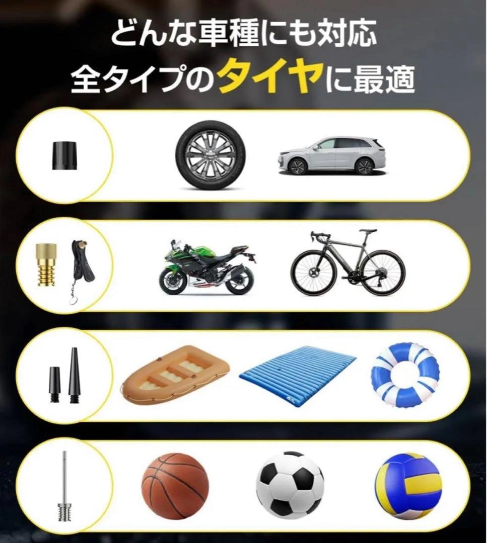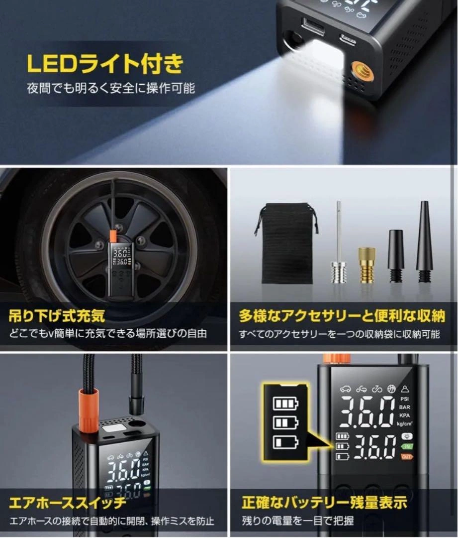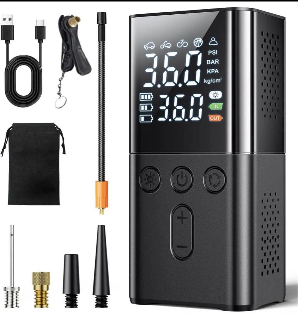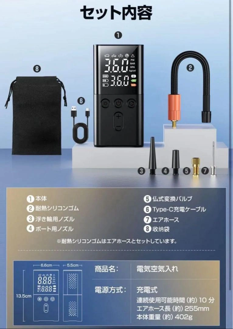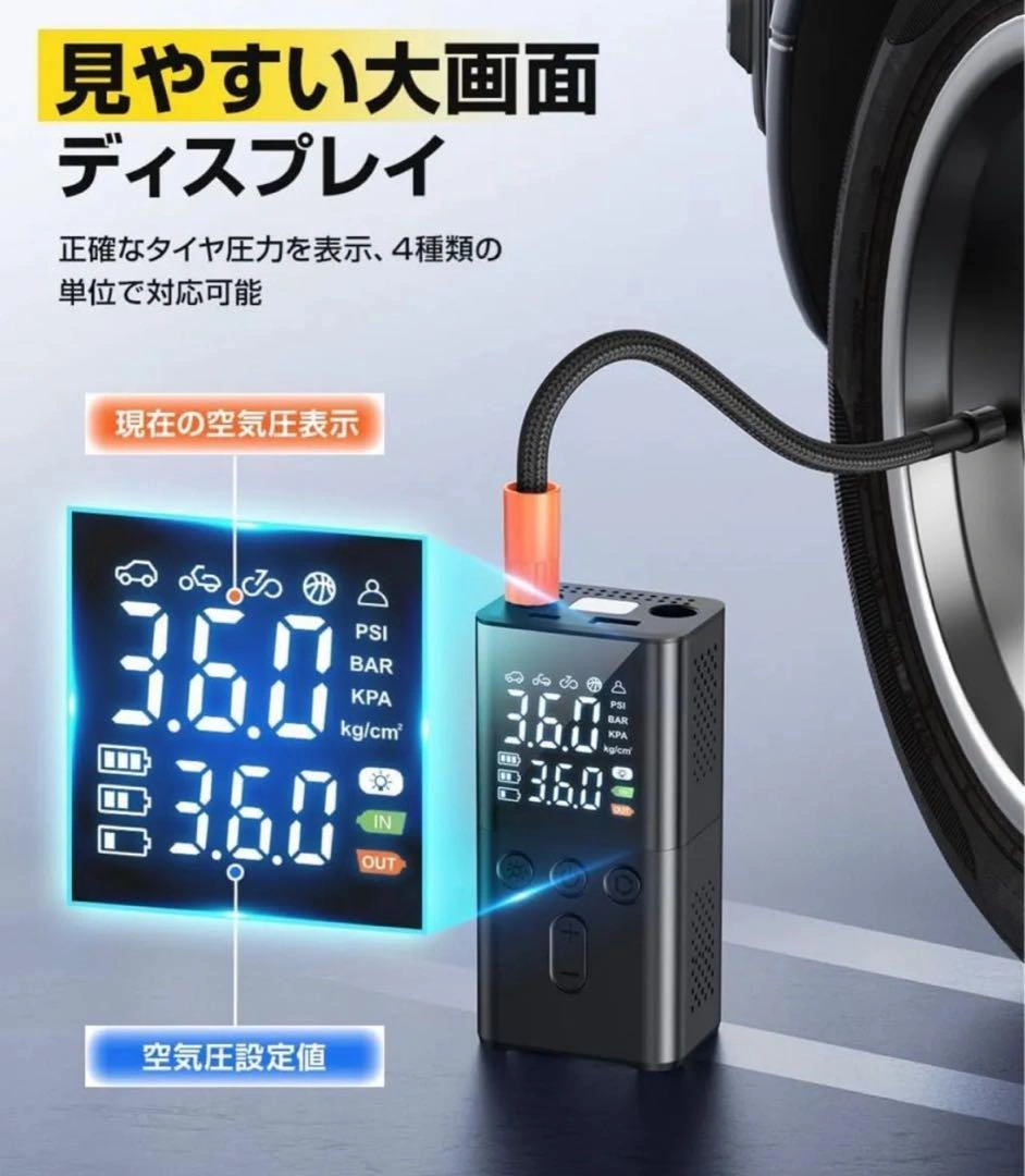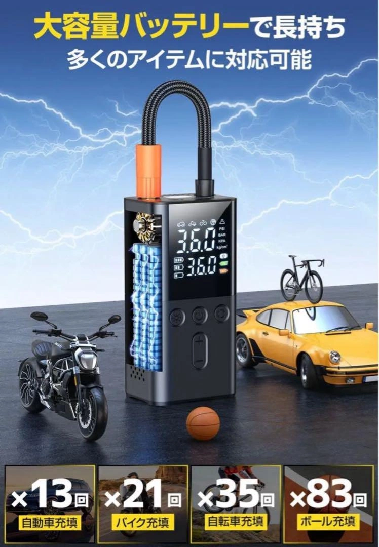 USB充電式のポータブル電動ポンプです。全タイプのタイヤに対応。 - モデル名: ポータブル電動ポンプ - 電源方式: USB充電式 - 圧力単位: PSI, BAR, KPA, kg/cm² - 付属品: 充電ケーブル、アダプター、ノズルセット - 対応タイヤ: 自動車、バイク、自転車、スポーツ用品 - サイズ: コンパクト設計 ご覧いただきありがとうございます。 ご希望の方はお気軽にご連絡ください。