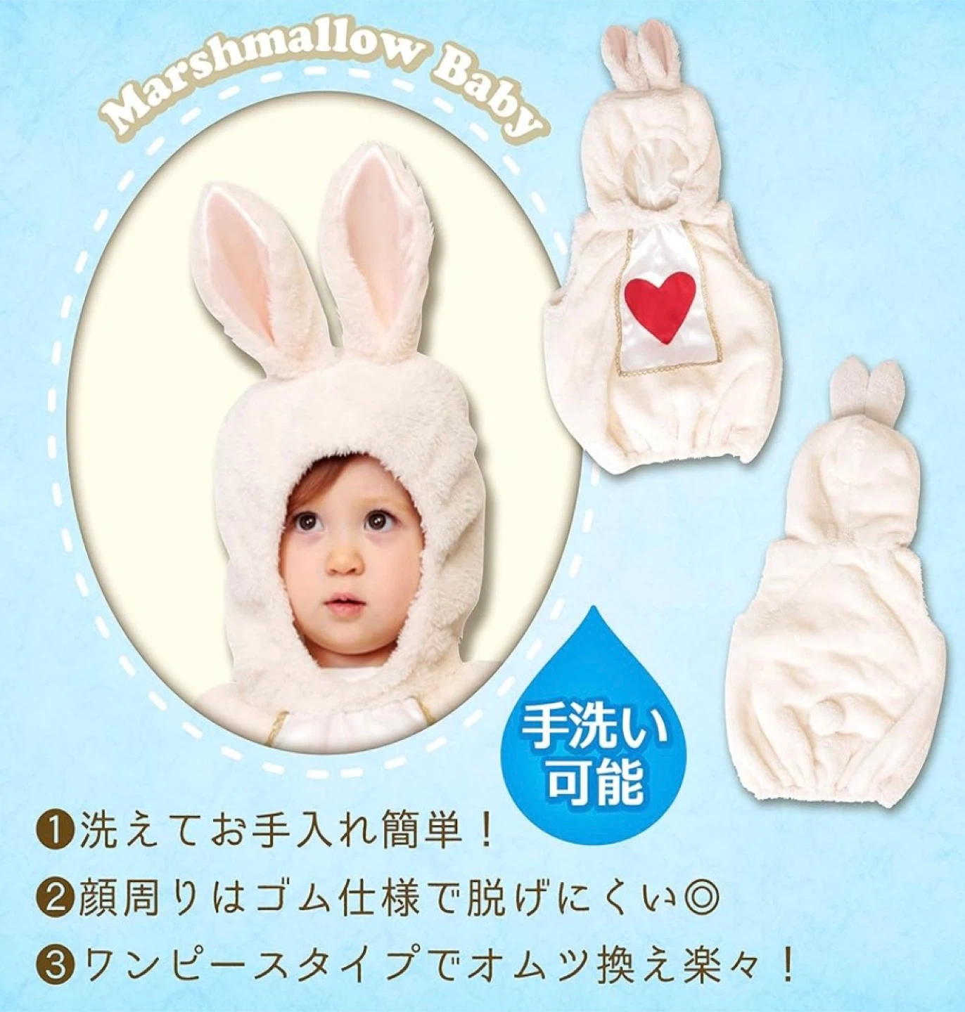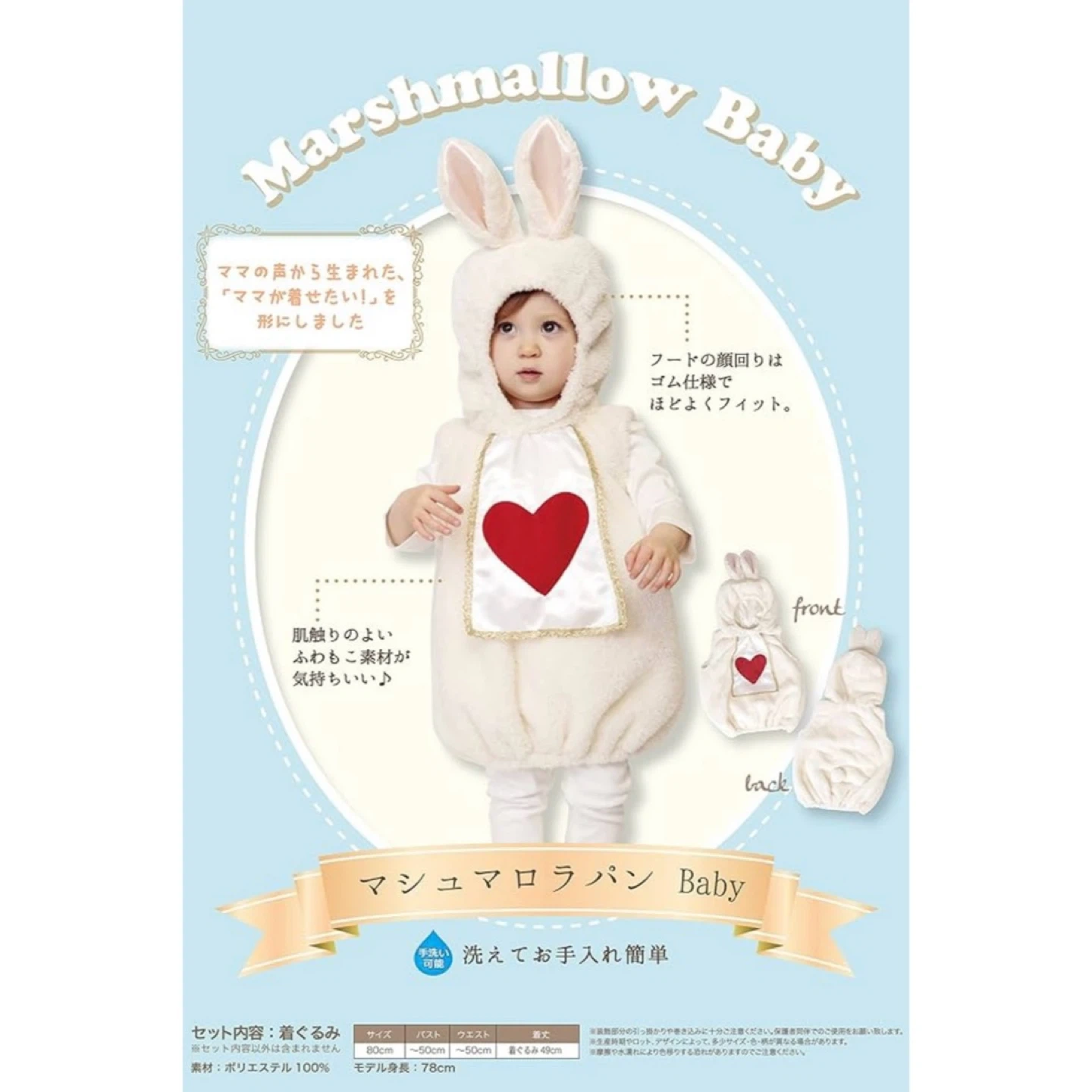 マシュマロラパン Babyのうさぎの着ぐるみです✨🐰 子どもが一歳2ヶ月の時に、1回着用しました。 割と綺麗な状態だと思います♪ サイズの表記はございませんが、購入記録を確認したところ、80cmでした🍀 【情報】 ブランド:マシュマロラパン Baby サイズ:80cm(バスト〜50cm、ウエスト〜50cm、着丈49cm) 素材:ポリエステル100% 年齢:1〜2歳目安 【状態】 目立つ傷や汚れなし 中古品であることご了承ください🙏 引き渡し場所はご相談ください✨