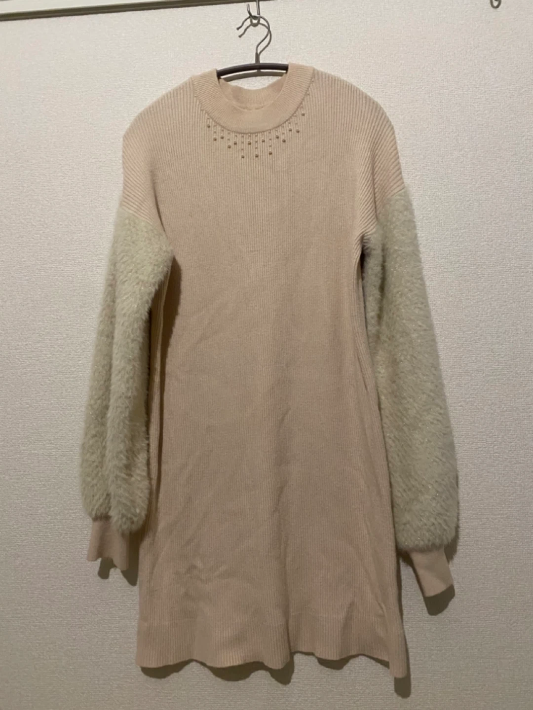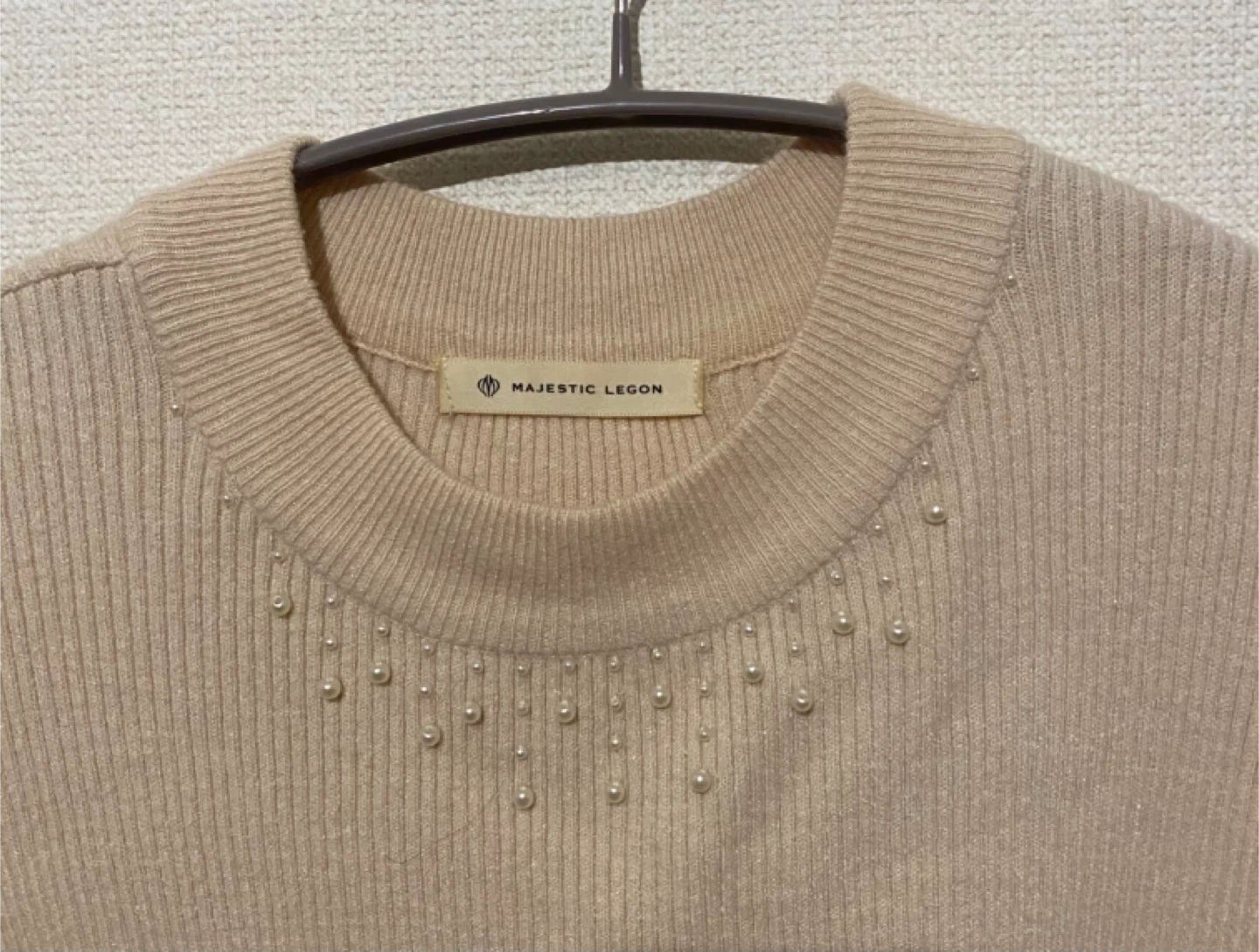 マジェスティックレゴンのニットワンピースです ・カラー:ベージュ ・袖部分がモコモコしたデザイン ・首元にパール装飾 ・使用感少なめ 中古品であることご了承ください
