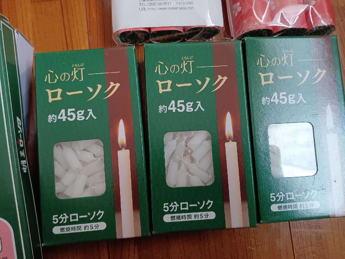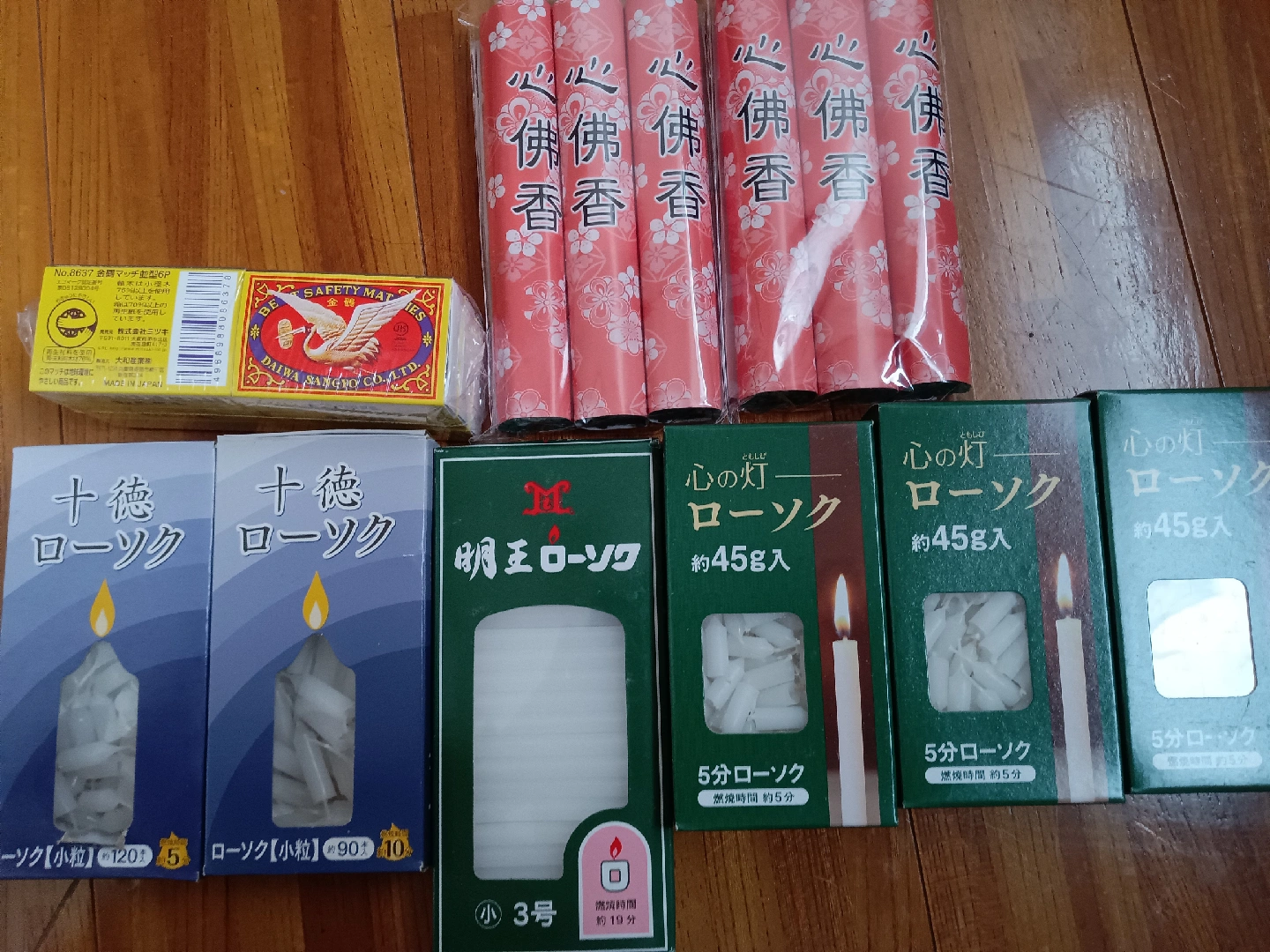 ローソクと線香のまとめ売りです 【情報】 ブランド:マルエス、大和産業 商品:ローソク、線香、マッチ 【状態】 燃焼時間10分のローソクは一部使用しております。 中古品であることご了承ください