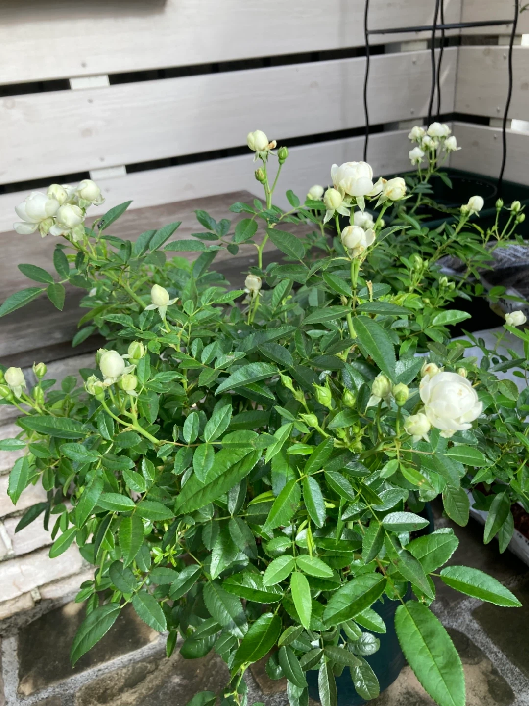 バラの鉢植えです🌹白の花を咲かせます。1番最初の写真は10月20日に撮影したものです。蕾がたくさんついてきました。 7号鉢で育てていて、バラ専用の腐葉土と堆肥を使用しています。これから涼しくなるにつれ、秋のバラを楽しめると思います。四季咲き。 夏の間バラ専用のストレスブロックを与え、9月に有機肥料済み 薔薇の説明が書かれている札はありません。1番最後の写真はホームセンターで同じものが売っていましたので、参考に価格を表示しました。 ・品種:マルゴズシスター(ポリアンサローズ) ・花径:3〜5cm ・樹高:50〜60cm ・状態:生育状態良好 ・鉢の色:緑 中古品であることご了承ください