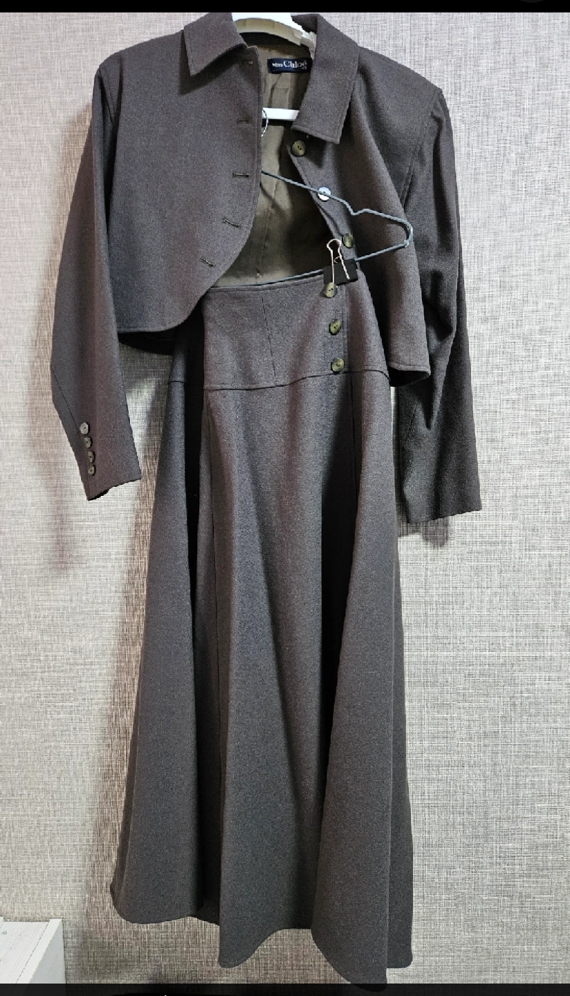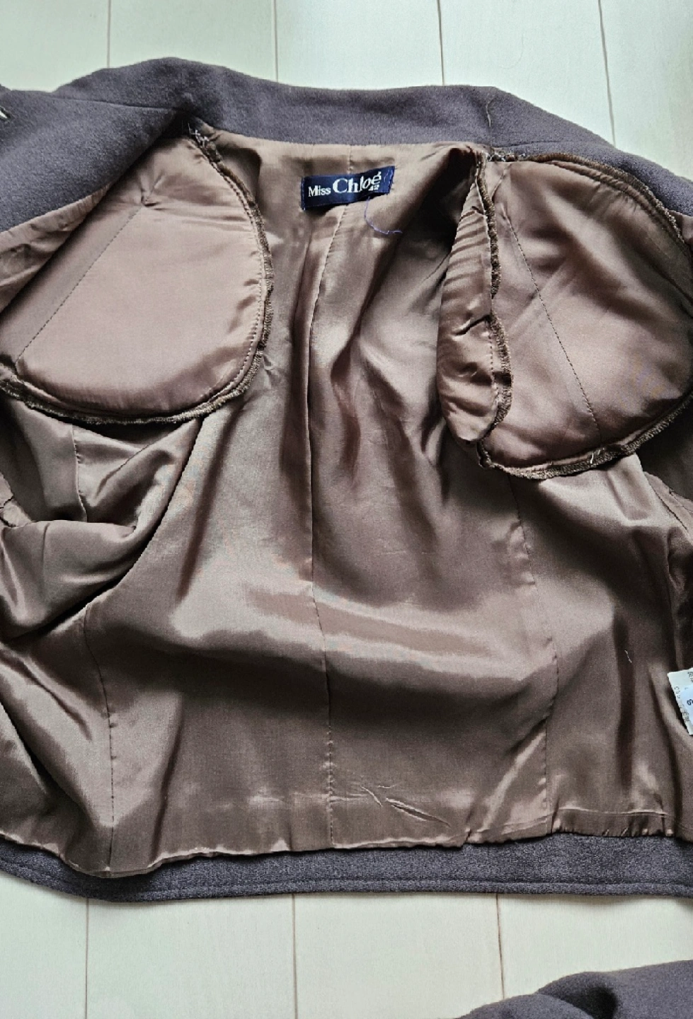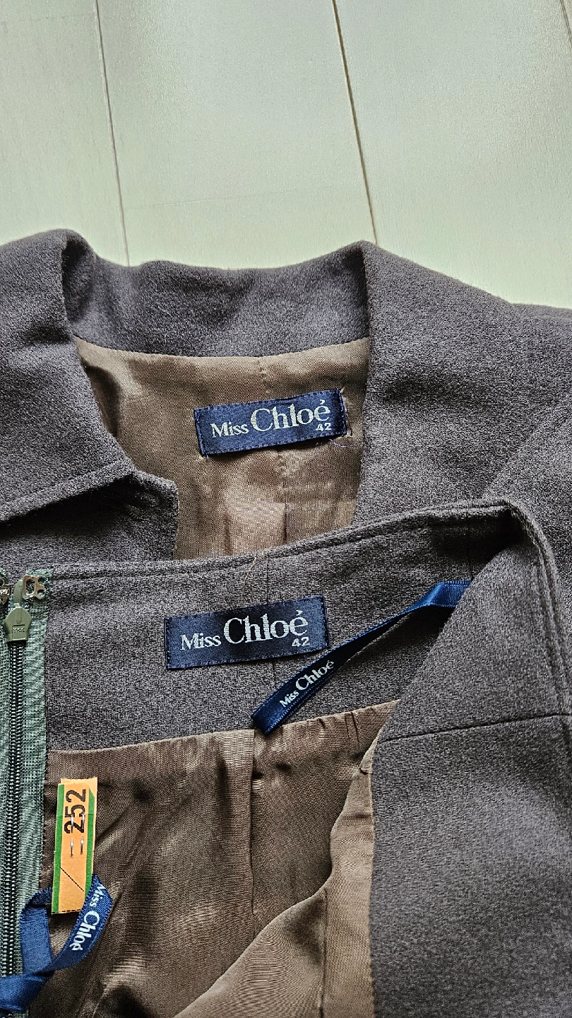 ミスクロエのセットアップです 【情報】 ブランド:ミスクロエ サイズ:42 素人寸法 スカート ウエスト 約65cm スカート丈 82cm スリット 25cm 上着 肩幅 約41cm 着丈 約40cm 袖丈 51cm カラー:ブラウングレー系 【状態】 ミスクロエになります 数回着用後クリーニング出してそのままだったので他の方に大切にしてもらいたく手放します ウエストも私にはもう限界だったため、、 中古品であることご了承ください