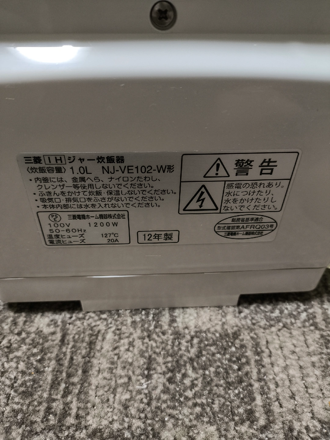 ミツビシの炊飯器です。 12年製 ですがここ4年程しか使用していません。 まだまだ使用可能です〇 5号炊の重ためですのでできまきたらお近くまでいらっしゃれる方お願いいたします。 【情報】 ブランド:ミツビシ 型番:NJ-VE102 炊飯容量:1.0L 【状態】 使用感はありますが、比較的きれいです 中古品であることご了承ください