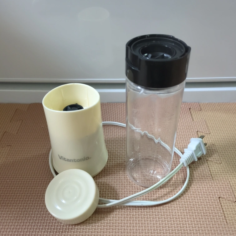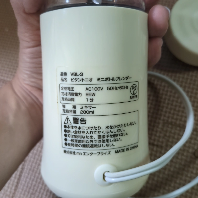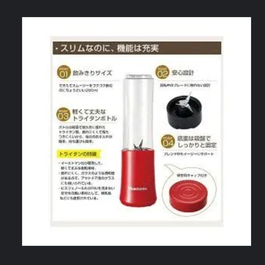 7年ほど前にプレゼントでいただき当時はよく使ってました! スムージーを作って、蓋を付け替えて持ち歩いてました(^^) 今は別のを購入したので清掃後ずっとしまっていましたので 使用感はありますが、、、使っていただける方に譲ります! 箱は捨ててしまいました。 説明書は見つかりましたら一緒に同封いたします。 以下、商品の説明公式より↓ パパッと作ってサッとお手入れ。毎日使えるお手軽さ美肌や体内浄化にスムージーが良いのは分かっているけど、忙しくて野菜やフルーツをカットする時間がないから粉末系や冷凍系のスムージーを利用している人も多いですよね。 でも、粉末系はシェイカーでは混ぜ残ってしまったり、冷凍系も滑らかになるまで時間とパワーがいるから大変。 そんな時の強い味方がビタントニオの『 ミニボトルブレンダー 』です。 MAX280ml対応の飲みきりサイズでとってもコンパクト 撹拌した容器でそのまま飲める手軽さも◎ 本体にボトルがセットされた状態でも、500mlペットボトルと同程度の大きさだから お家はもちろん、職場や学校に持ち運んで使えるお手軽さ ミキサーを出すのは面倒という人でも、これならラクラク。 市販の野菜ジュースにフレッシュなフルーツや野菜をプラスすれば、オリジナルドリンクもカンタン 体力と筋力アップのプロテインも、バナナをプラスしてパワーアップ ドリンクはもちろん、ソースやスープなどお料理にも活用できるので、 得意料理のバリエーションだって広がりそう お手軽ヘルシー生活のお供に、ぜひ活用してください ●サイズ [本体+ボトル] (約)直径7.6×高さ25.7cm 【素材】ボトル:トライタン 本体、キャップ:ABS樹脂 ブレード:ステンレススチール 【重量】約510g(キャップ含まず) 【コード長】0.8m 【ボトル容量】約280ml 【定格使用時間】1分 【回転数】17,000回転/分 【電源】AC100V 50/60Hz 【消費電力】95W 【ご注意】40℃以上の湯、食器洗浄機・食器乾燥機類は使用しないで下さい。部品の変形や破損の原因になります 素材...その他 種類...その他