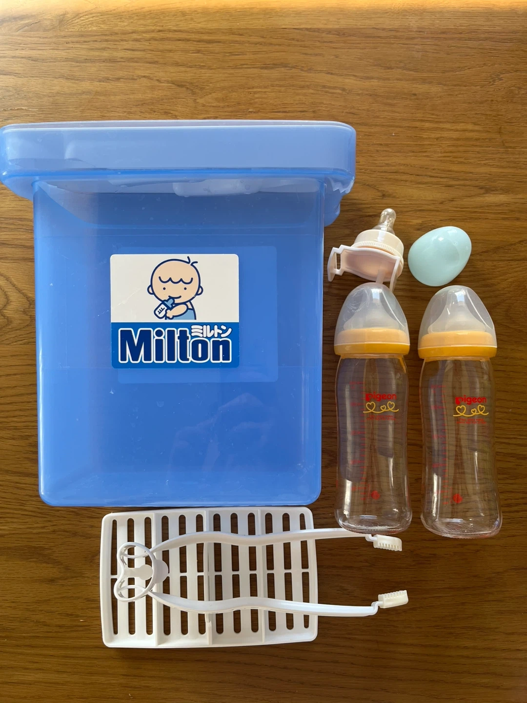 ミルトンの哺乳瓶消毒ケースセットです。 【内容】 ・ミルトン消毒ケース (フタ、トング、落とし蓋付き) ・哺乳瓶 x 2 (ピジョン240ml ガラス製) ・紙パック用乳首 (チュチュ 紙パック用乳首) 中古品であることご了承ください 消毒済みですが、ご使用前に今一度洗浄・消毒をお願いいたします