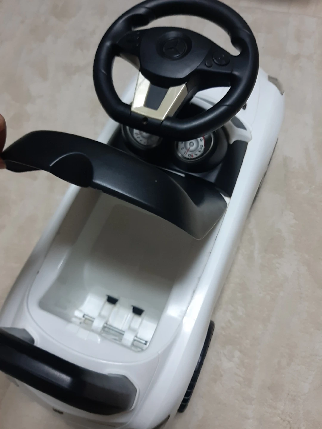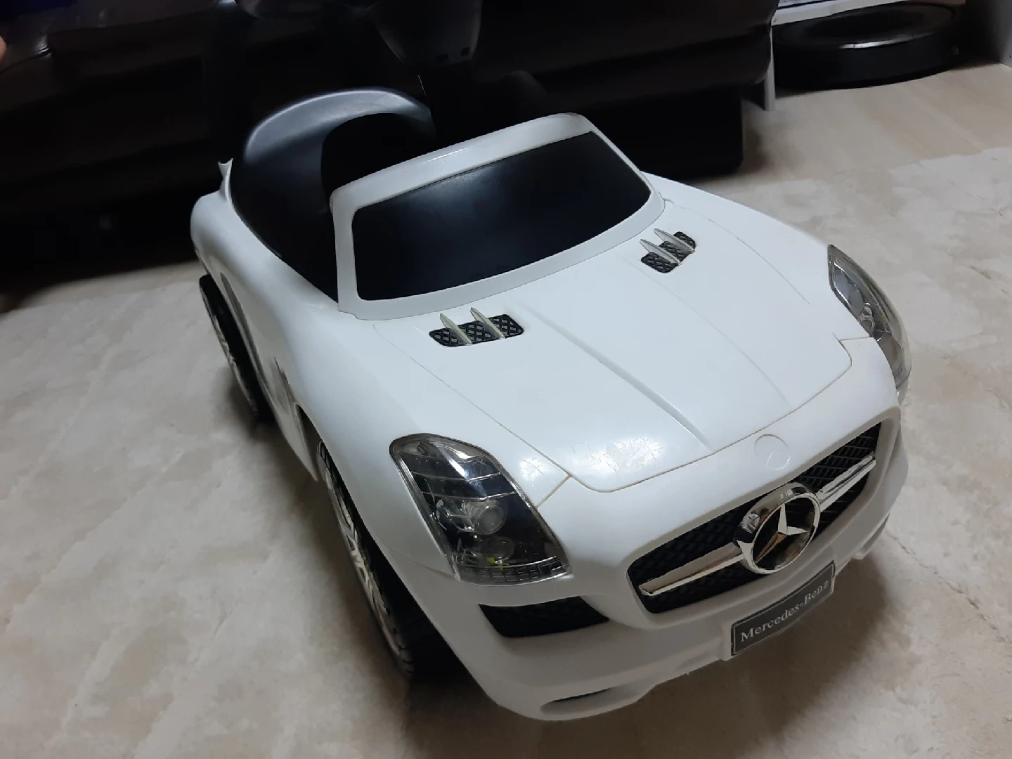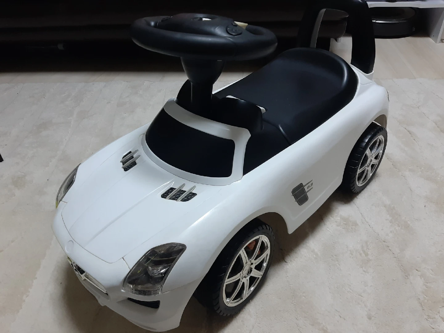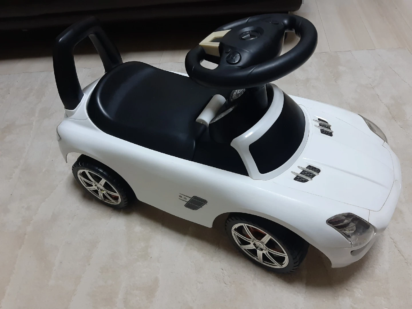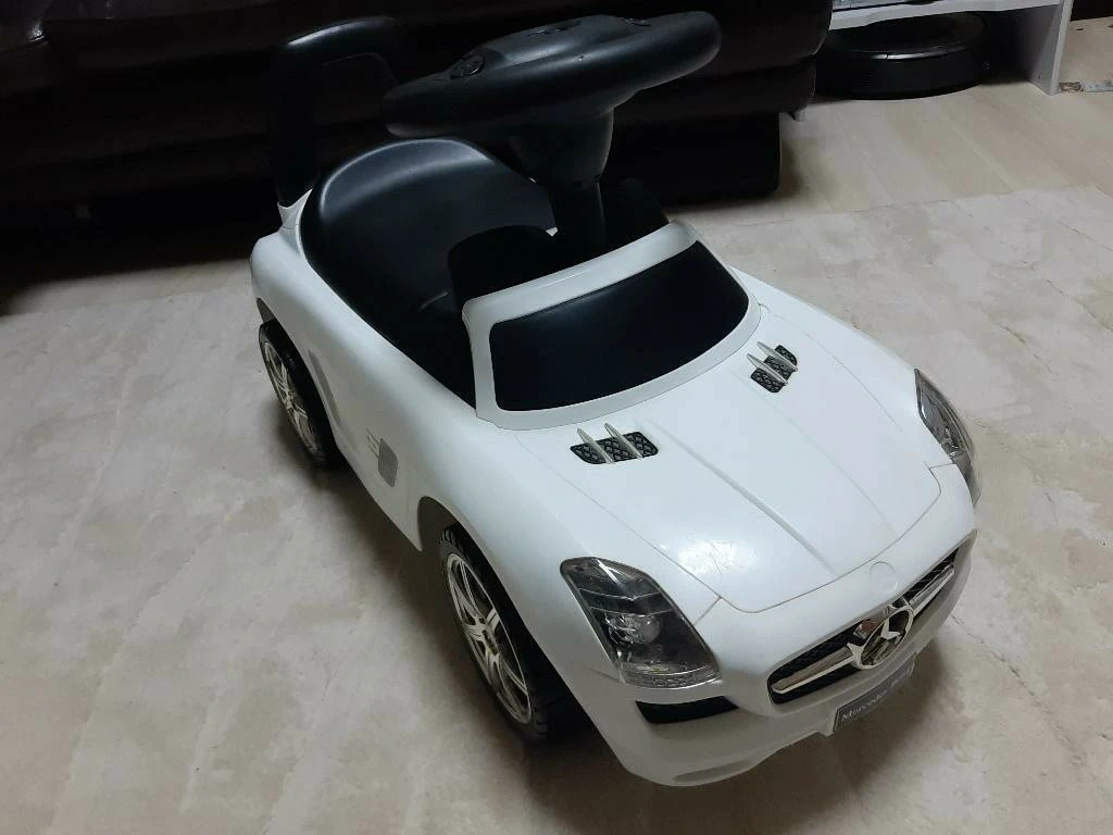 白メルセデスベンツSLSキッズカー 子供が乗って実際に動かせる車(ベンツ)の足蹴りおもちゃです。 室内で使ってました。 電池が切れており音の確認はできてませんが鳴らないかもしれないです。 椅子のふたを開けると小物が入れられます。 全体をアルコール除菌でふいてますが、子供が気に入って使っていた為小傷や汚れありますので中古を気になさらない方に。 引渡し希望日時:平日17時以降~or土日祝要問い合わせ ご希望日ありましたらお知らせください。 直接取りに来て頂ける方限定でお願いいたします。