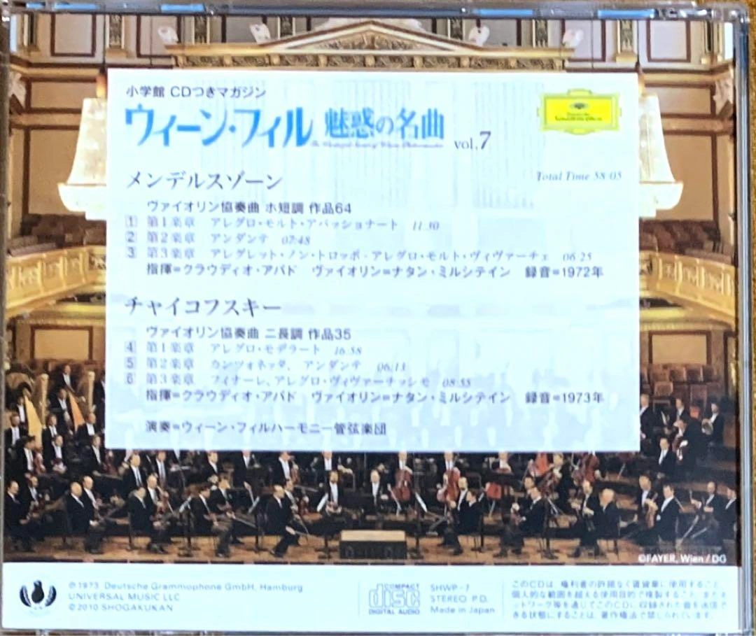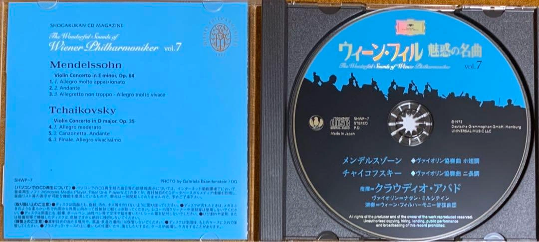 ウィーン・フィルハーモニー管弦楽団による名曲集。メンデルスゾーンとチャイコフスキーのヴァイオリン協奏曲を収録。 ナタン・ミルシテインがソロを務め、クラウディオ・アバドの指揮で演奏。 クラシック音楽ファン必見の一枚。高品質な録音と演奏が楽しめます。 ウィーン・フィル、魅惑の名曲vol. 7 メンデルスゾーン ヴァイオリン協奏曲 ホ短調作品64 第1第楽章 アレグロ・モルト・アバッショナート 11:30 第2楽章アンダンテ07:48 第3楽章アレグレット・ノン・トロッポ・アレグロ・モルト・ヴィヴァーチェ 06:25 指揮=クラウディオ・アバド ヴァイオリン=ナタン・ミルシテイン 録音-1972年 チャイコフスキー ヴァイオリン協奏曲 二長調作品35 第1楽章 アレグロ・モデラー10:38 第2東京 カンツオネック、アンダンサ 06:13 第3楽章 フィナーレ、アレグロ・ヴィヴァーチッシも08:53 指揮=クラウディオ・アバド ヴァイオリン=ナタン・ミルシテイン 録音-1973年 演奏= ウィーン・フィルハーモニー管弦楽団 ご覧いただきありがとうございます。