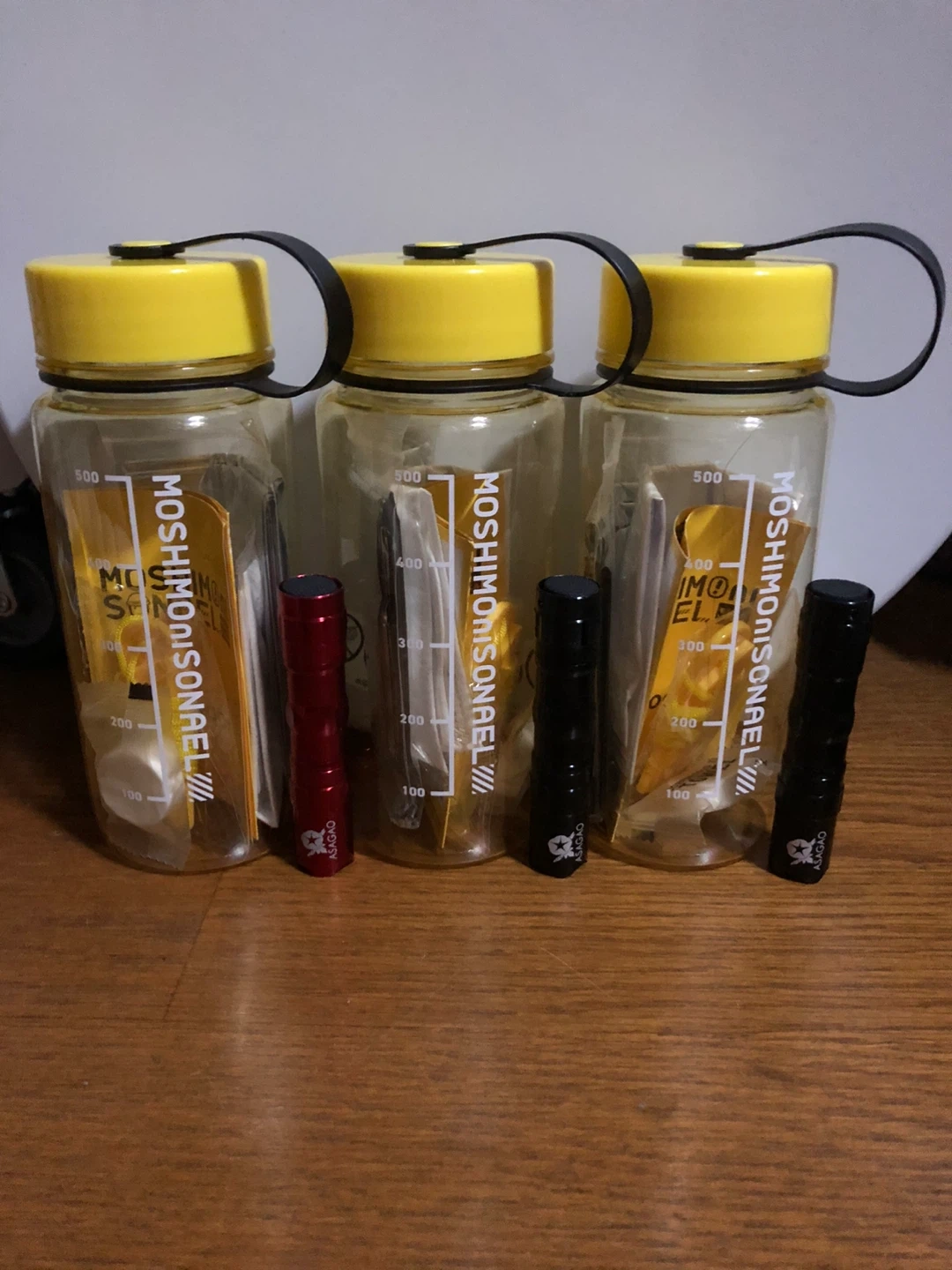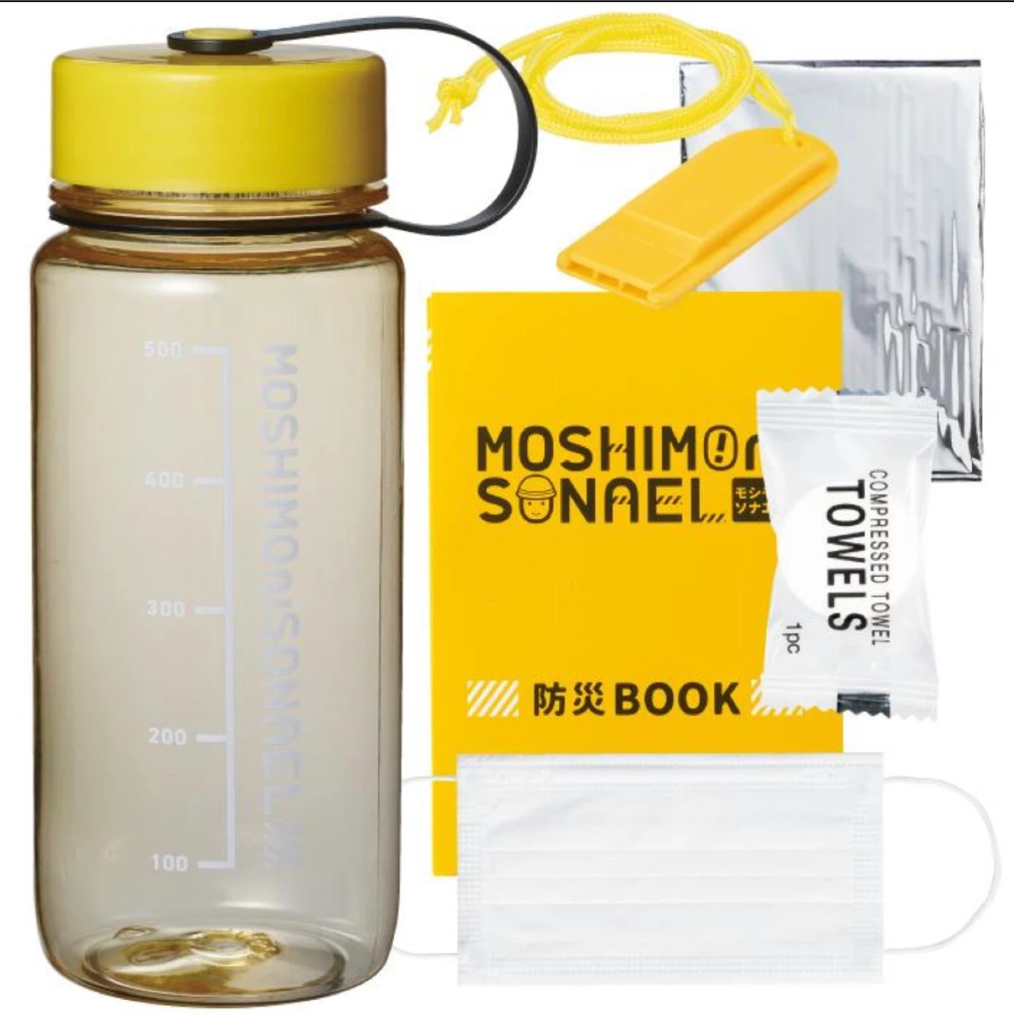 モシモニソナエルの防災備蓄ボトル6点セット×3個 +🎁ミニライト付属 【情報】 ブランド:モシモニソナエル セット内容: ボトル 容量:630ml(ボトル) 色:クリア、イエロー アルミシート1400×1700mm 圧縮 タオル200×200mm 不織布マスク ホイッスル 防災ブック +🎁ミニライト(電池付) 【状態】 未使用品 ⚠️外箱はありません 中古品であることご了承ください