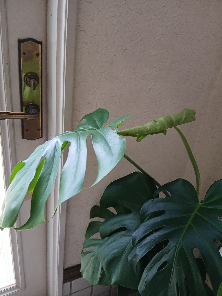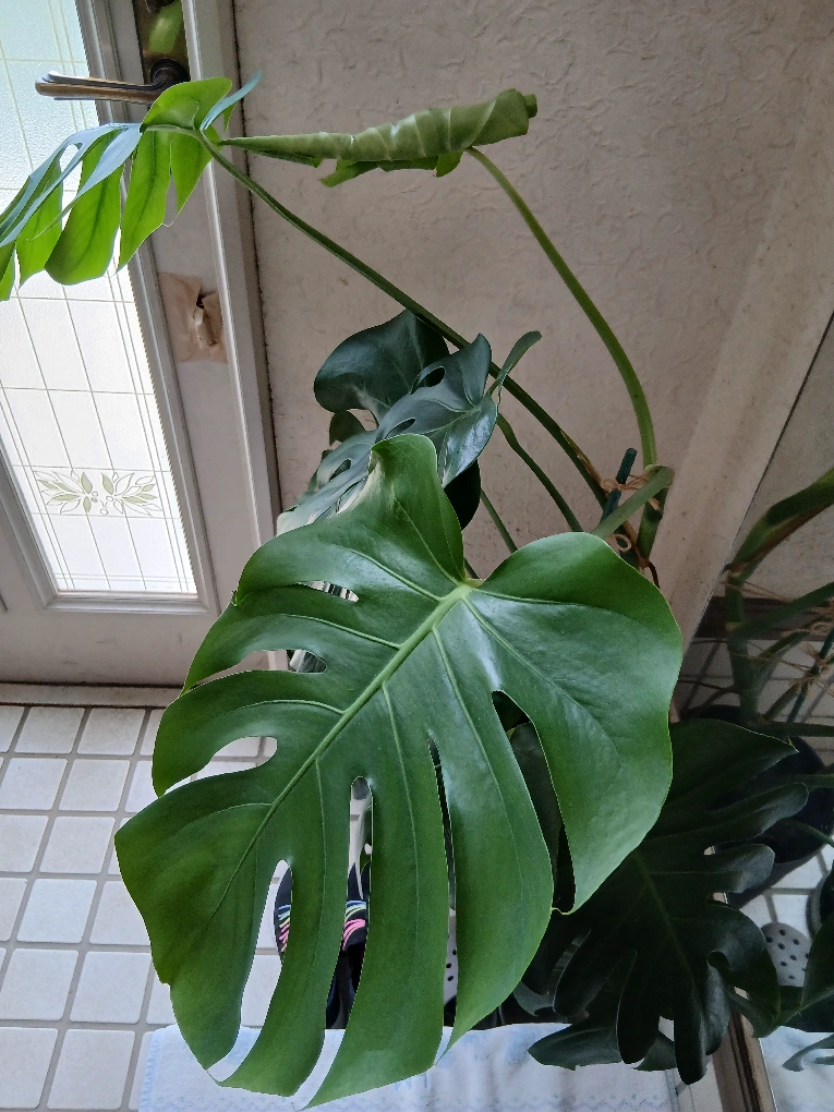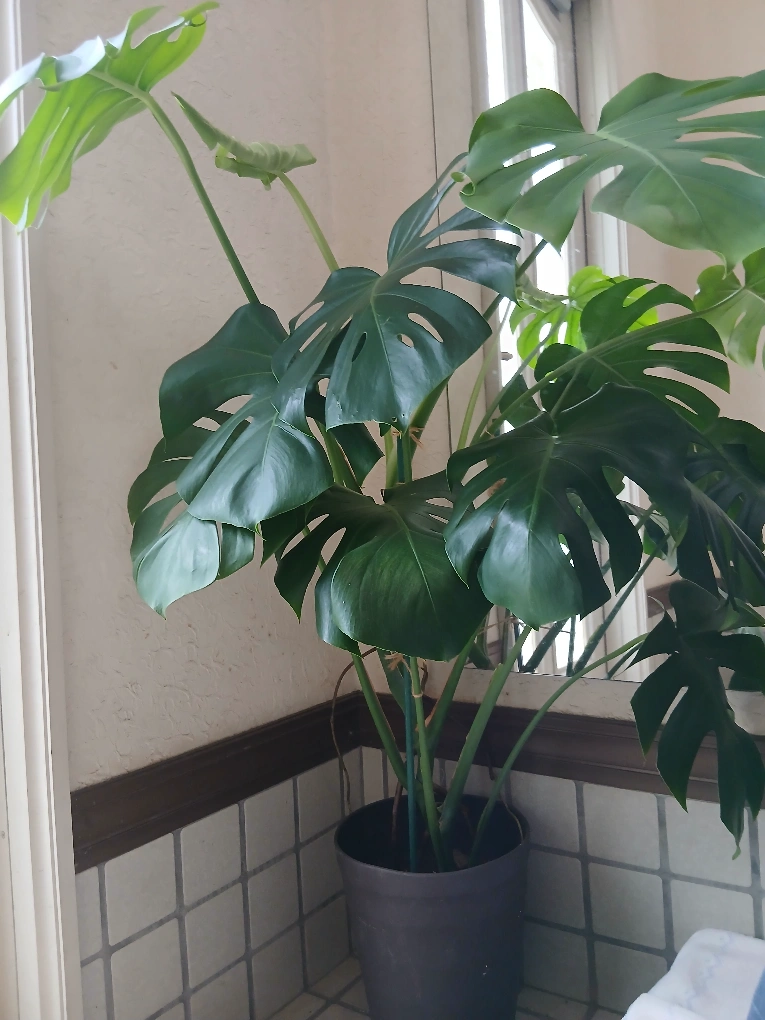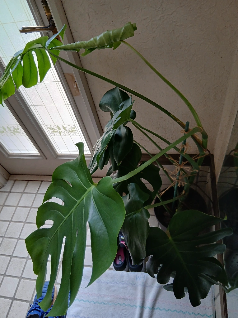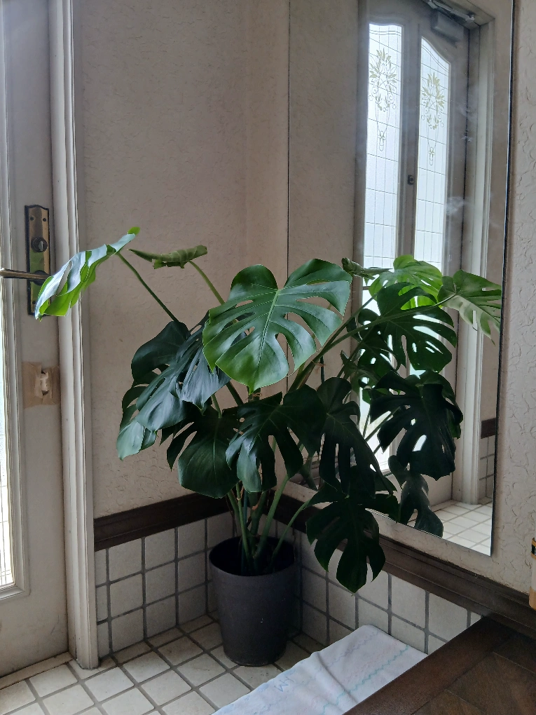 観葉植物のモンステラです ・鉢の色:ダークブラウン ・状態:非常に良好 大切に育てた、モンステラデリシオザ5年物のトップをカットして、移植後2年経過中、10枚の美しい葉をつけています、これからが楽しみな鉢です。 高さは、鉢底から110センチ 幅は、支柱を使用して、80センチです。 置場所は南東向きの玄関。 元気良く次の葉を出して成長しています。明るいカーテンごしの光が入るリビングにも最適です。 他にも多数育てているので、バランスの良い物から出品して参ります。