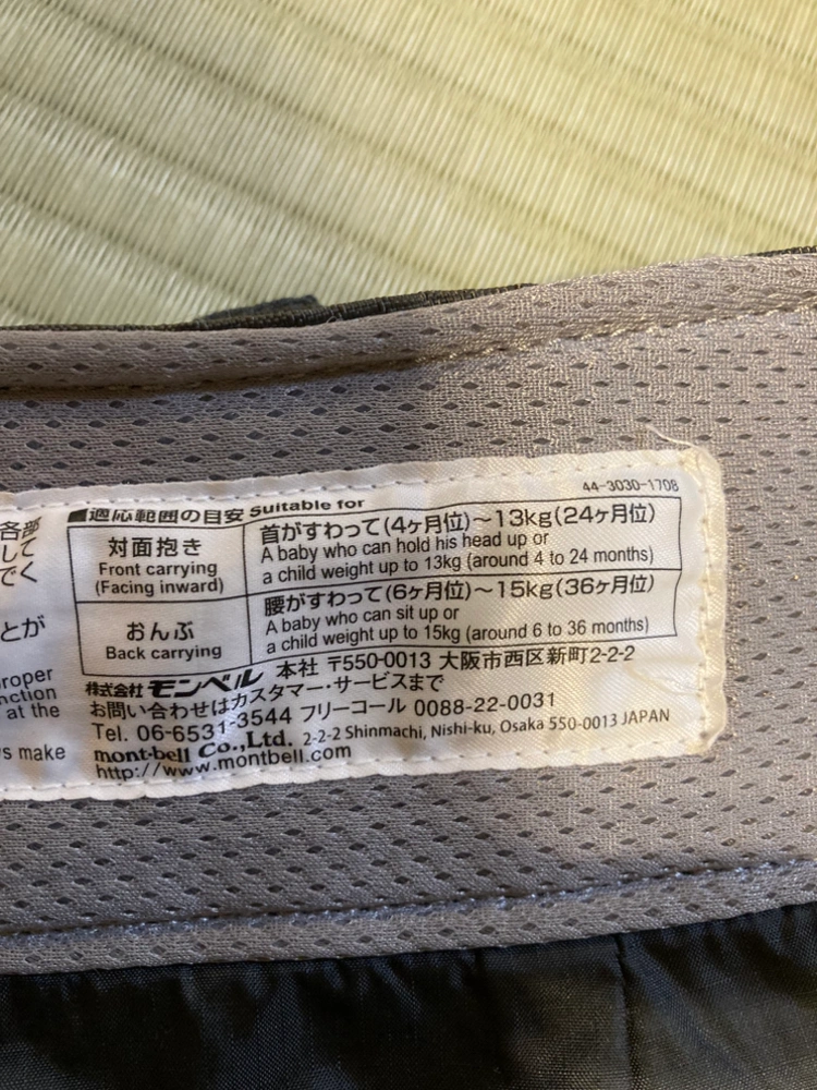 モンベルの抱っこ紐で、軽くてコンパクトになって持ち運びやすいのでよく使いました。 まだまだ使って頂けます。