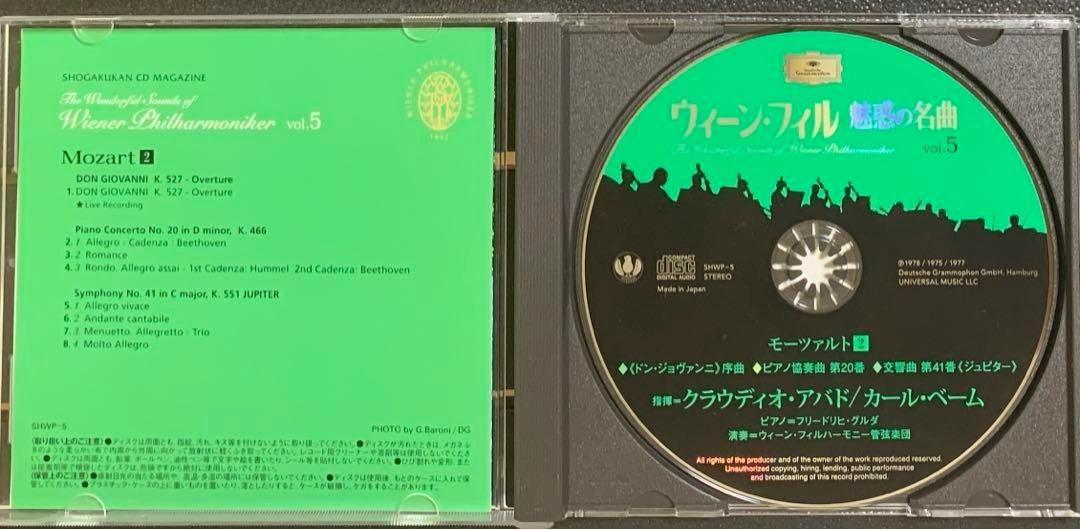 ウィーン・フィル 魅惑の名曲vol.5 モーツアルト 歌劇<ドン・ジョヴァンニ>K.527-序曲6:19 指揮=カール・ベーム 録音=1977年 ★ライヴ・レコーディング ピアノ協奏曲 第20番二短調 K. 466 第1楽章 アレグロ(カデンツア:ベートーヴェン)15:21 第2楽章 ロマンツェ 9:53 第3楽章 ロンド アレグロ・アッサイ(第1カデンツァ:フンメル、第2カデンツァ:ベートーヴェン)7:37 指揮=クラウディオ・アバド ピアノ=フリードリヒ・グルダ録音=1974年 交響曲 第41番ハ長調 K.551 <ジュピター> 第1楽章 アレグロ・ヴィヴァーチェ 8:03 第2楽章 アンダンテ・カンタービレ 7:41 第3楽章 メヌエット・アレグレットートリオ 5:41 第4楽章 モルト・アレグロ 6:44 指揮=カール・ベーム 録音=1976年 演奏=ウィーン・フィルハーモニー管弦楽団 ご希望の方はお気軽にご連絡ください。